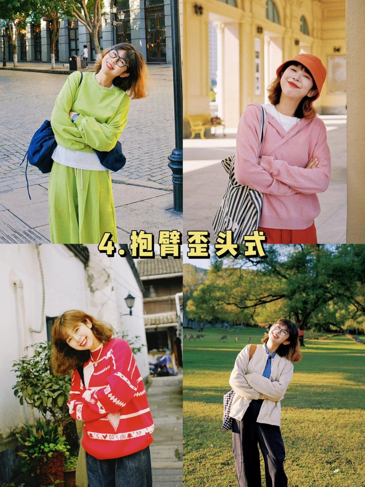 想要更加亲切地表达自己的拍照姿势时,可以选择抱手臂歪头式。双臂抱胸,头部微微倾斜,展示出轻松愉快的一面。这么做不仅可以营造出自然上镜的感觉,还会在照片中呈现出你的亲和力,让你显得更加漂亮。
