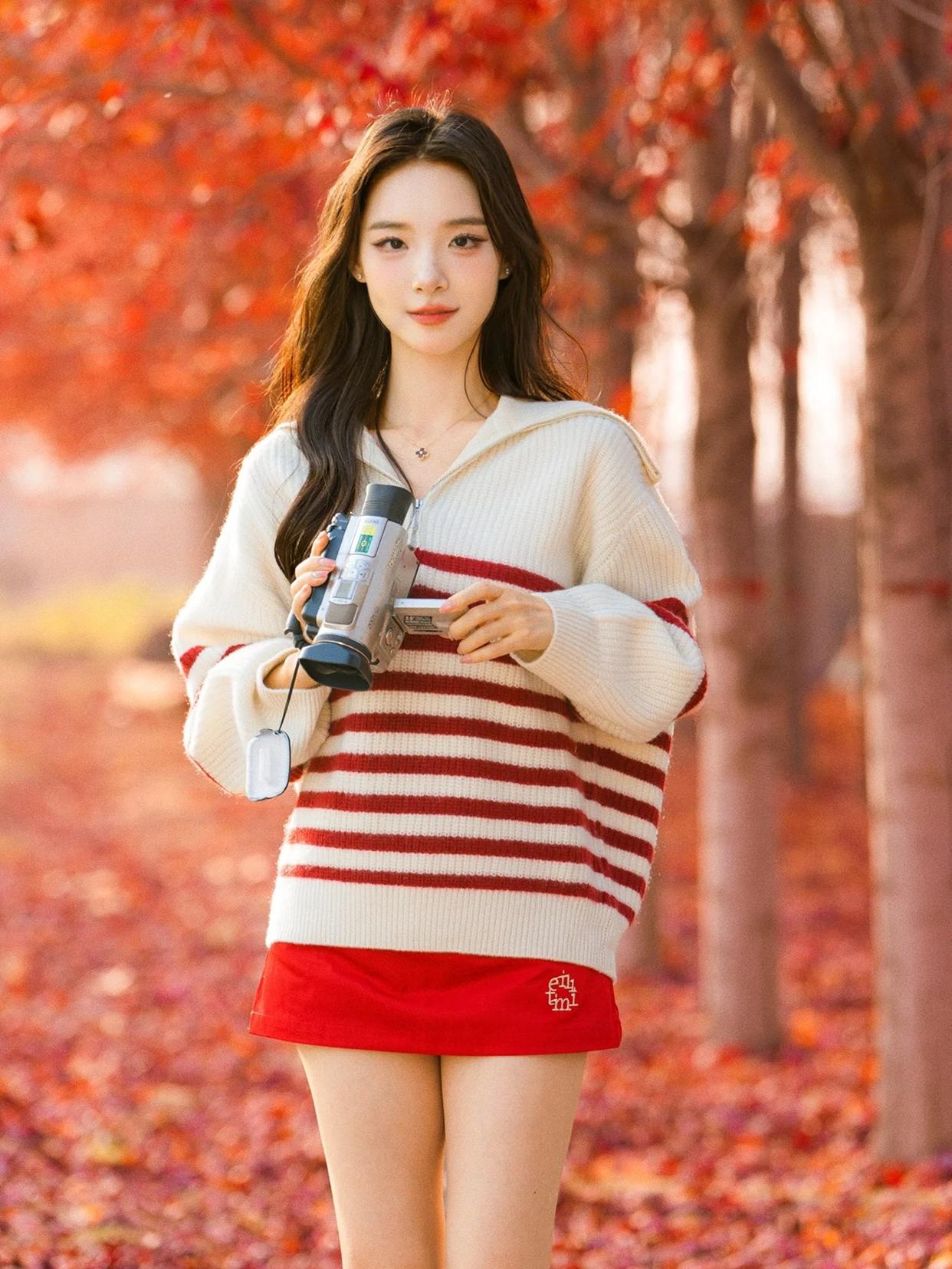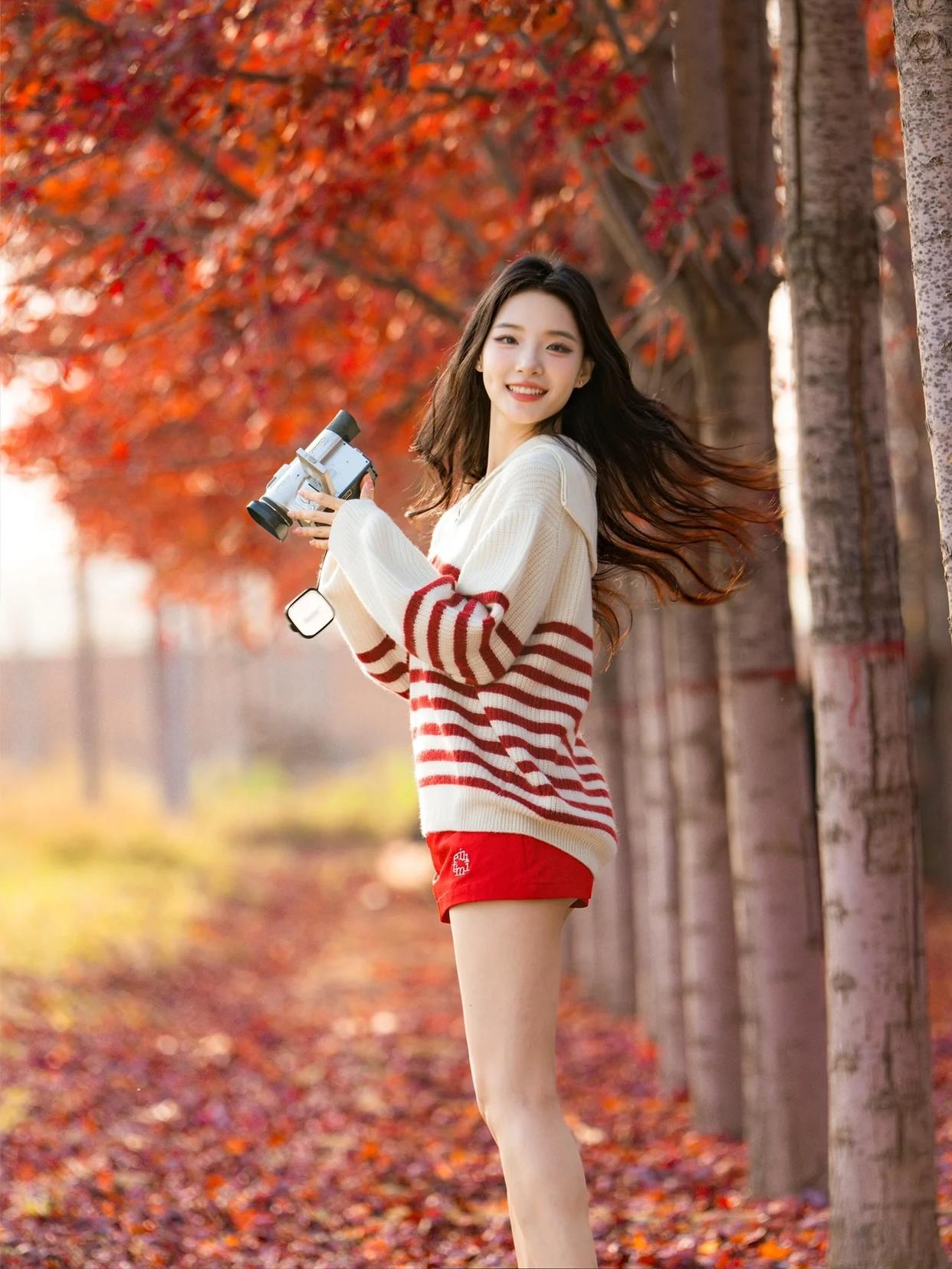 在枫叶林中拍人像,结合上道具的使用,能让画面整体呈现得更为丰富,参考下图,以枫叶林为背景,半身取景,模特手拿符合拍摄题材的道具,像是相机、围巾、雨伞、鲜花、饮料等都可以,这样即便是看向镜头拍,模特的紧张状态也能有所缓解。