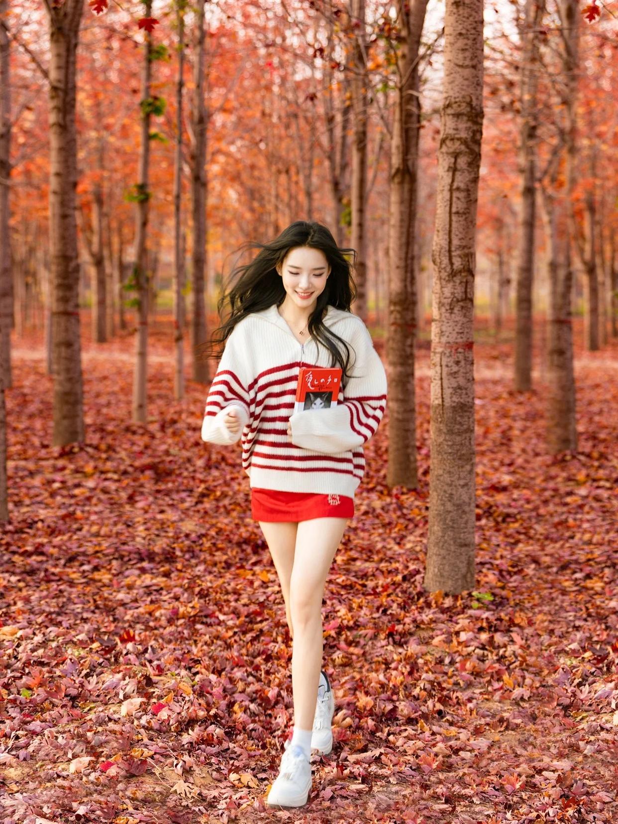 在广阔的树林中,模特的摆姿有了更多的发挥空间,如果模特怎么摆拍出来的效果都不佳的话,可以引导模特动起来拍,学下面的模特,在枫叶林中低头奔跑,让摄影师记录下这自然又富有生命力的画面,很有氛围感。