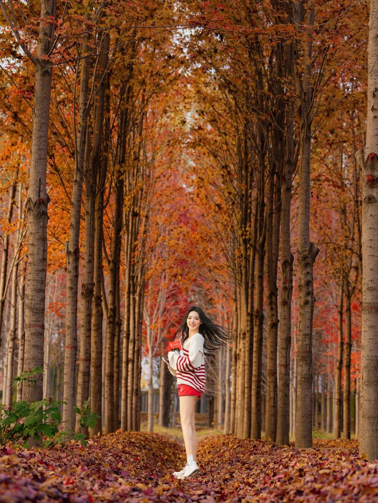以大场景的方式拍摄枫叶林人像,想要更好地出片,构图是重中之重,利用两排的枫叶作为画面的视觉指引,模特站在画面的中间位置,观众的视线会随着两排的树聚焦在模特的身上,照片的透视感和延伸性也会大大提升。