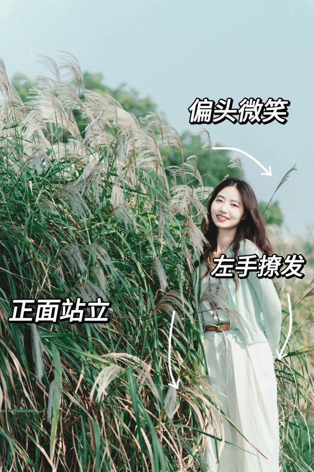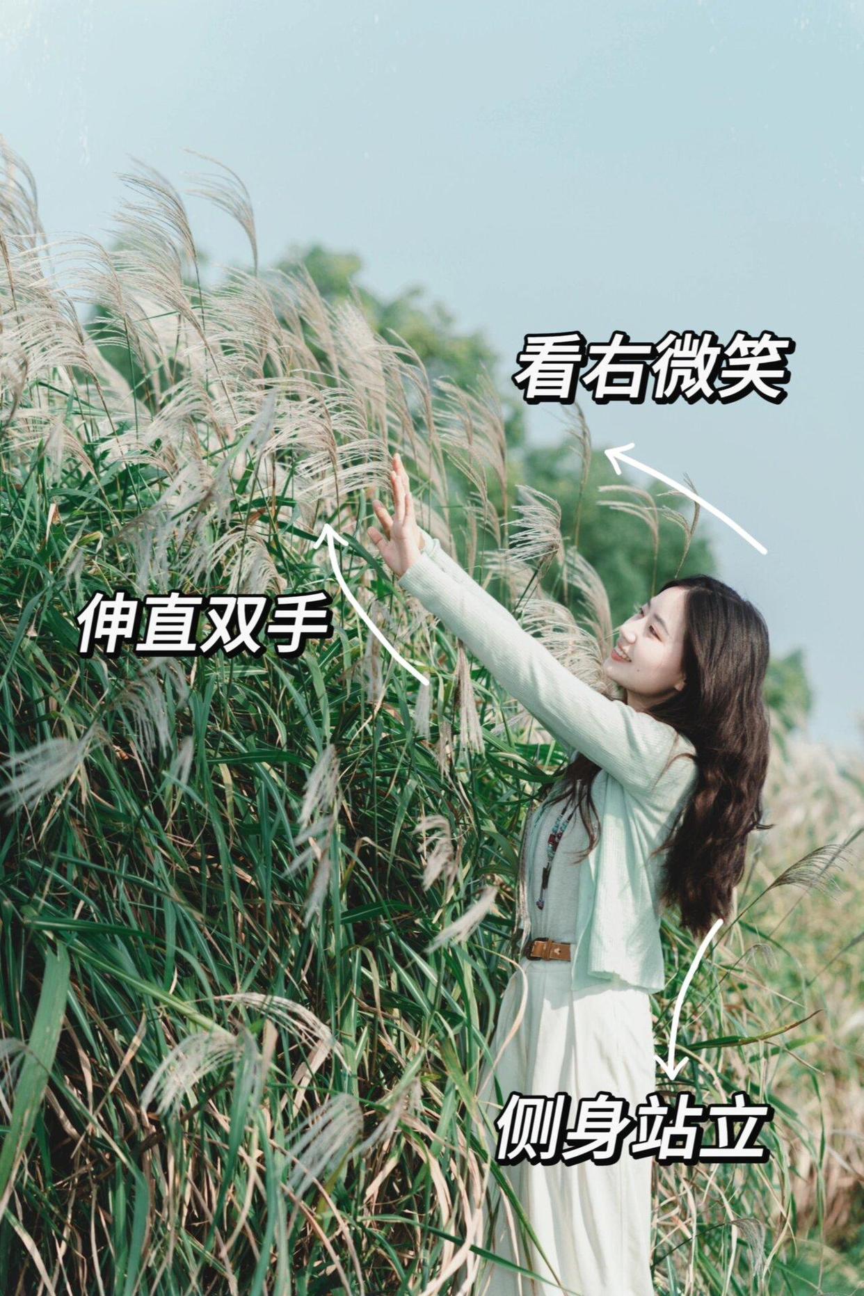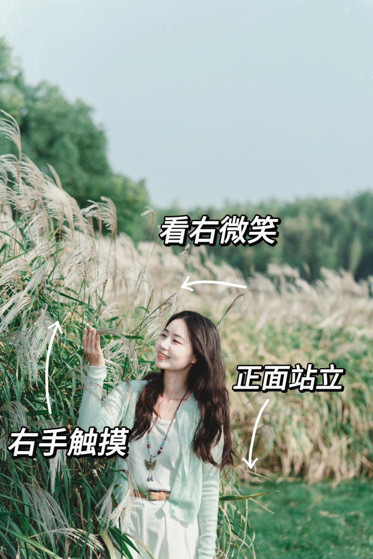 面对镜头站立,在芦苇中用右手轻触芦苇,同时微笑地看向右侧。这种姿势既简单又自然,是芦苇拍照中的经典之选。