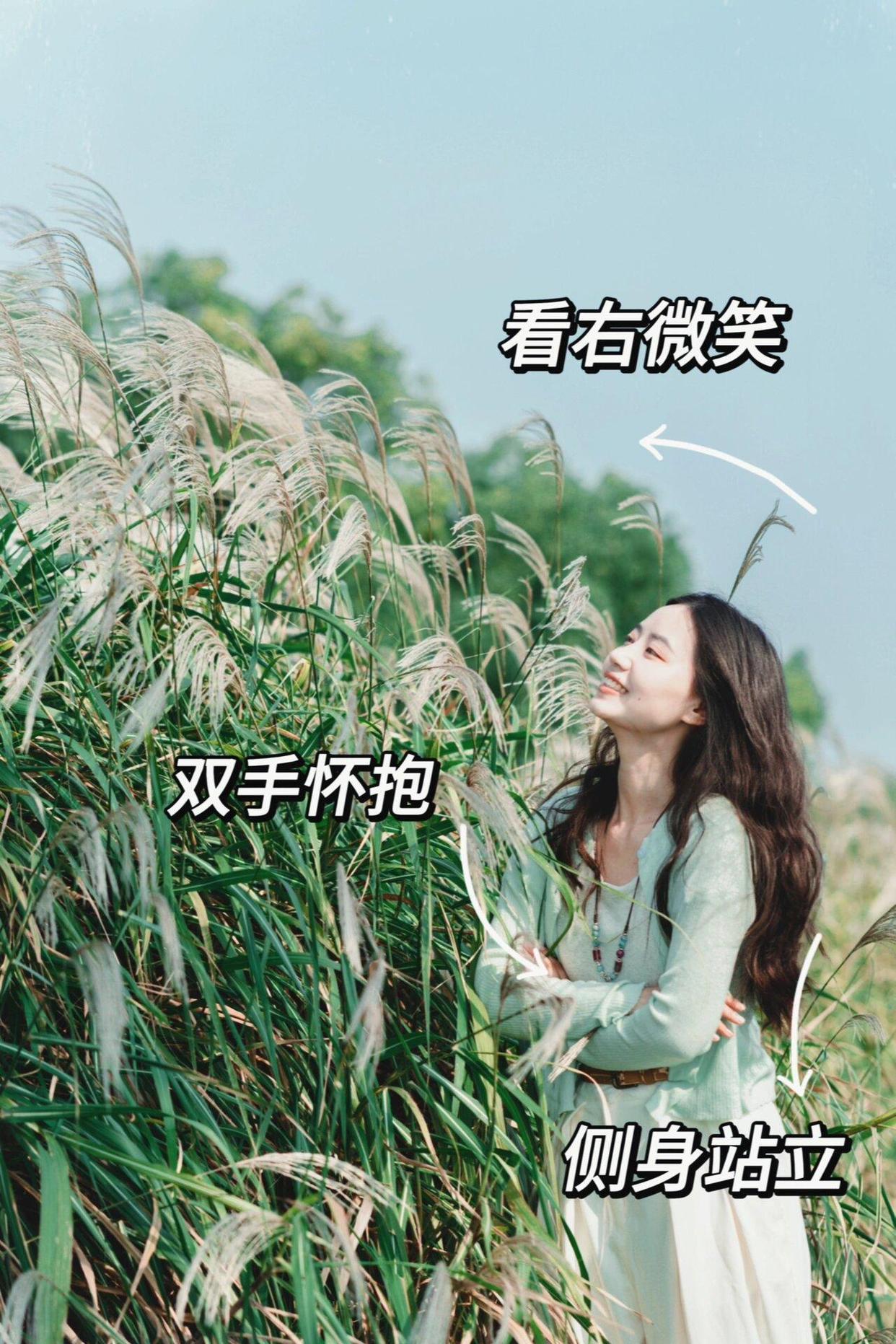 在芦苇中侧身站立,双手轻轻环抱自己,微笑着看向右侧。这个姿势不仅轻松拍大片,还能在芦苇拍照中展现出一种温柔而安静的气质。