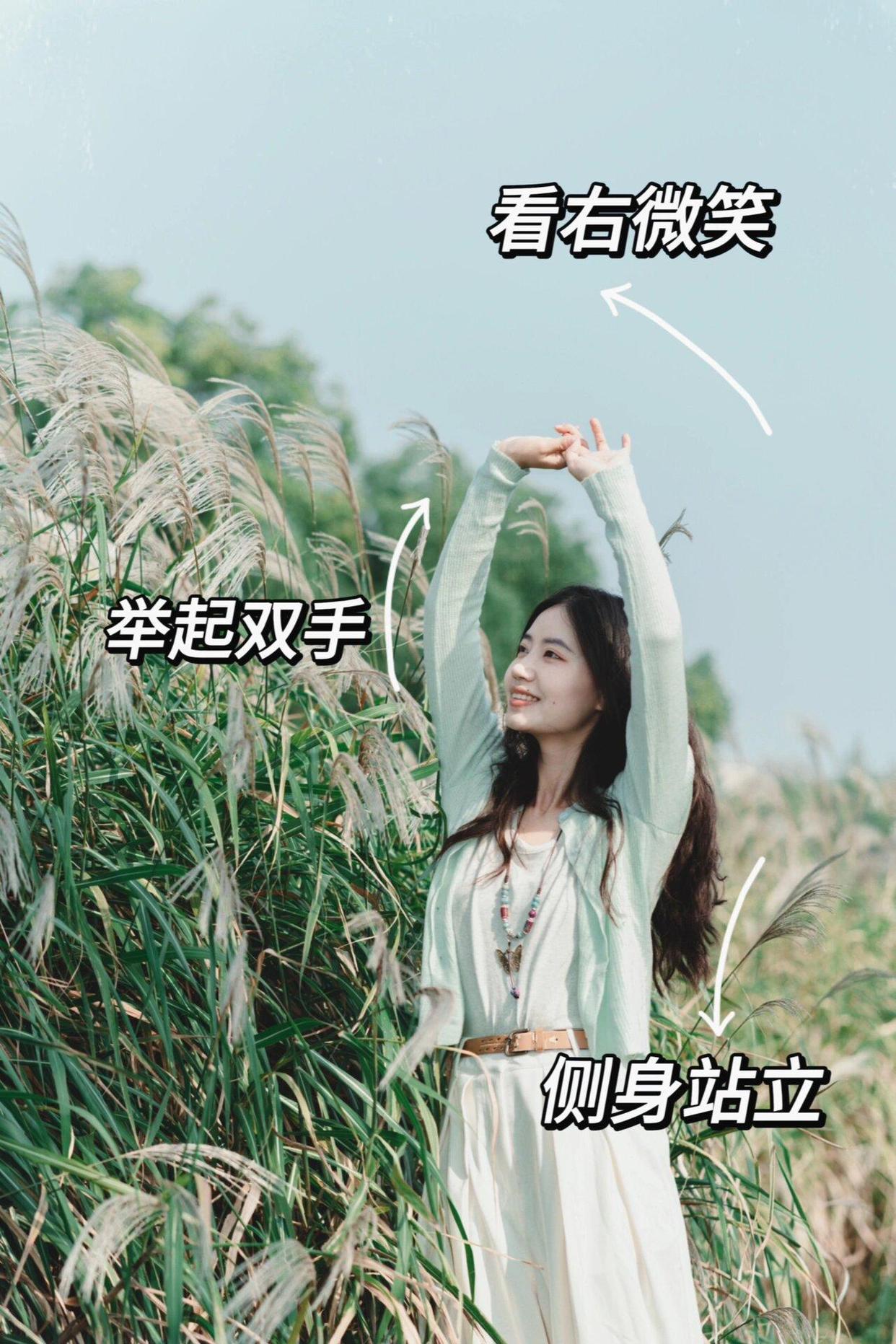 在芦苇中侧站,双手伸直向两侧展开,面带微笑地看向右侧。这种姿势在芦苇拍照中能够营造出一种开阔而自然的感觉。