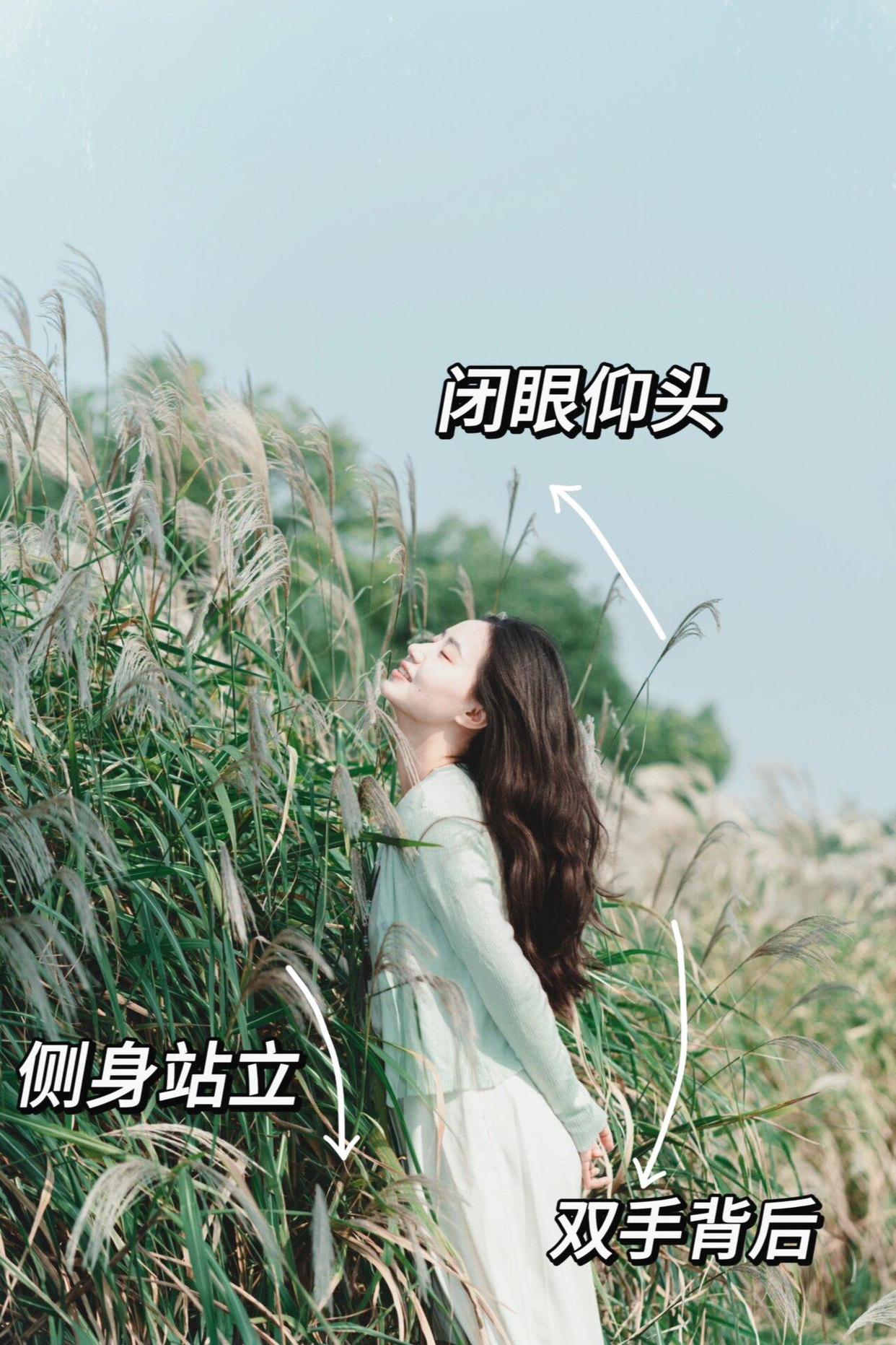 在芦苇中侧身站立,双手轻放在背后,闭上眼睛,轻轻仰头。这个姿势在芦苇拍照时,能够展现出一种内心的宁静和满足。