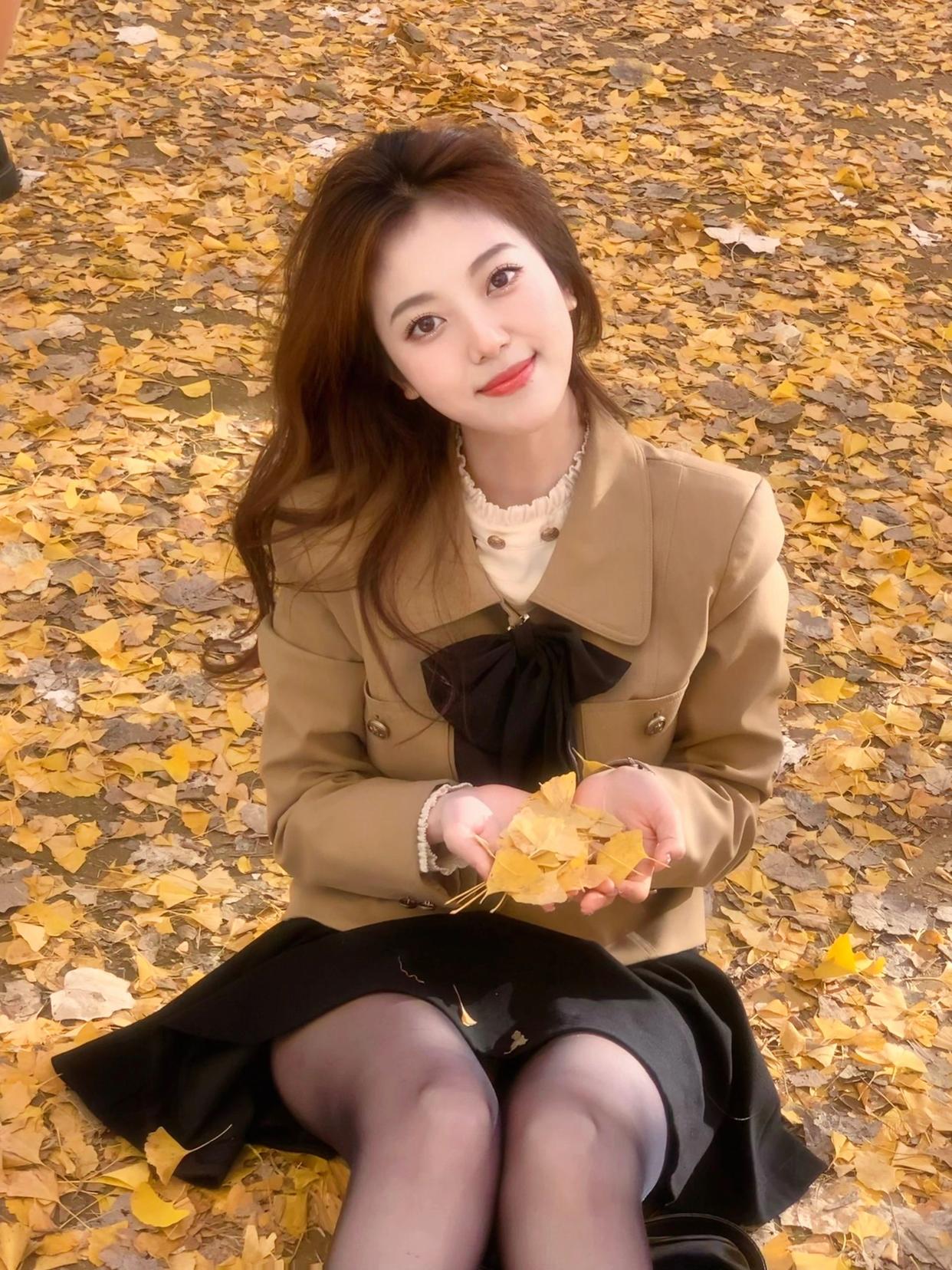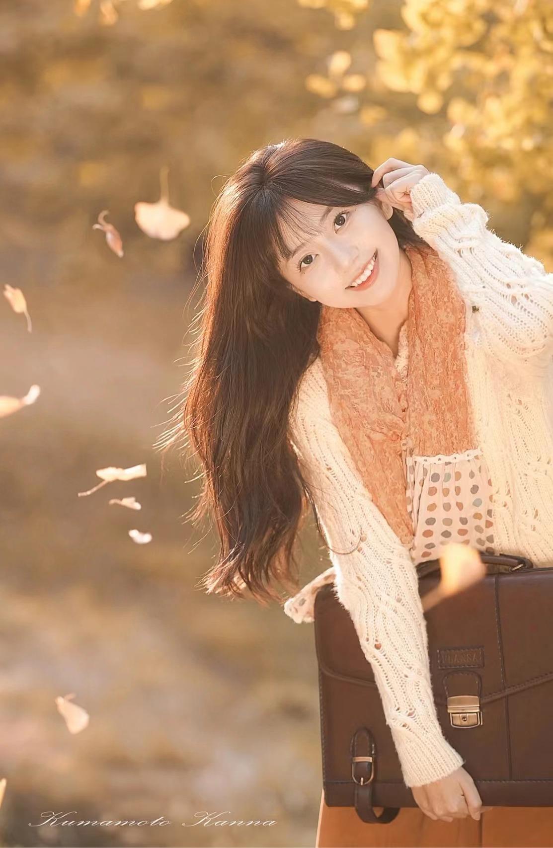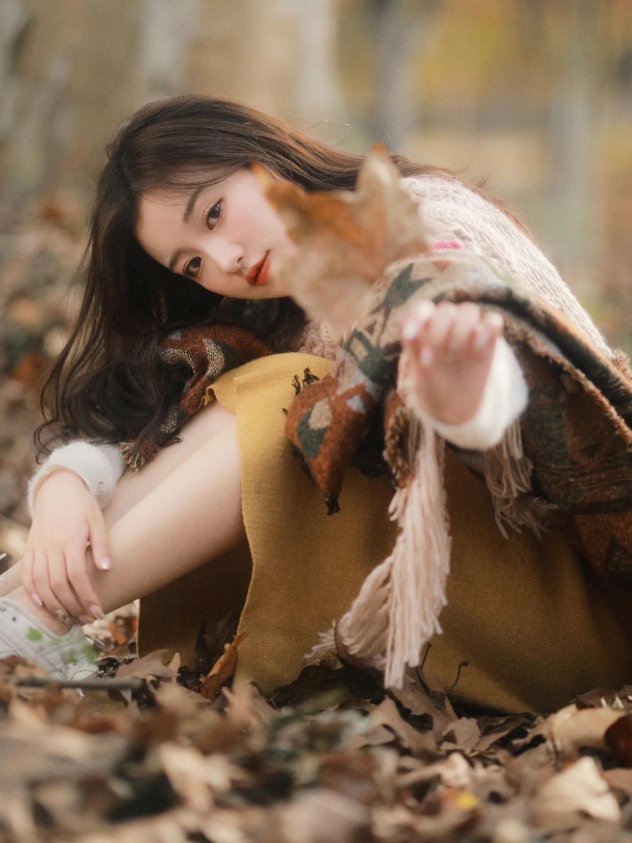 也可以像下面的小姐姐一般,以秋叶林为背景,中间构图,人物45度抬头,嘴巴微微张开,让脸部的线条更为立体和好看,也是很不错的拍法。