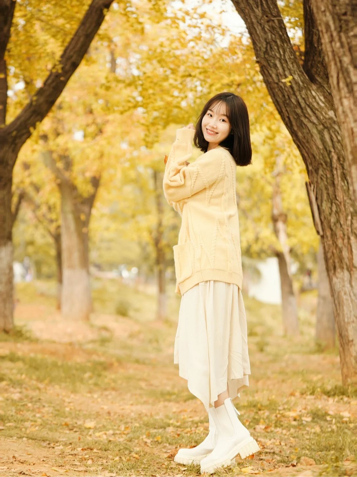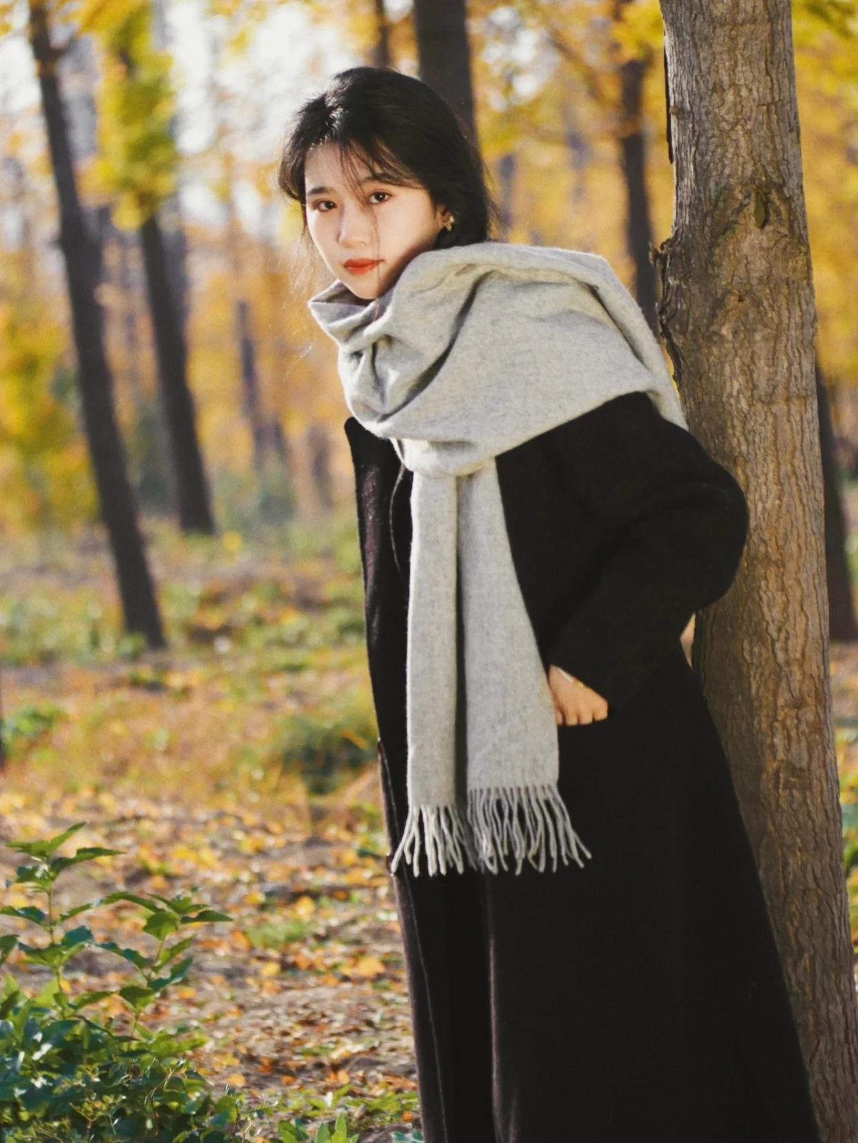 在秋叶林中拍全身照,大家要尽可能选择侧身拍,在侧身的角度下,身材的曲线和五官的轮廓都能突显出来。
