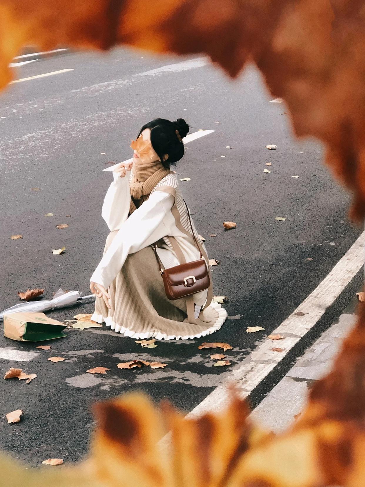 落在地上的树叶岂能让其白白入泥,不知道摆什么姿势的时候,抛洒秋叶的姿势尤为推荐,指导模特向半空抛起树叶,高速快门连拍这一瞬间,让相机定格在这很有动态美的画面,拍照很有氛围感。