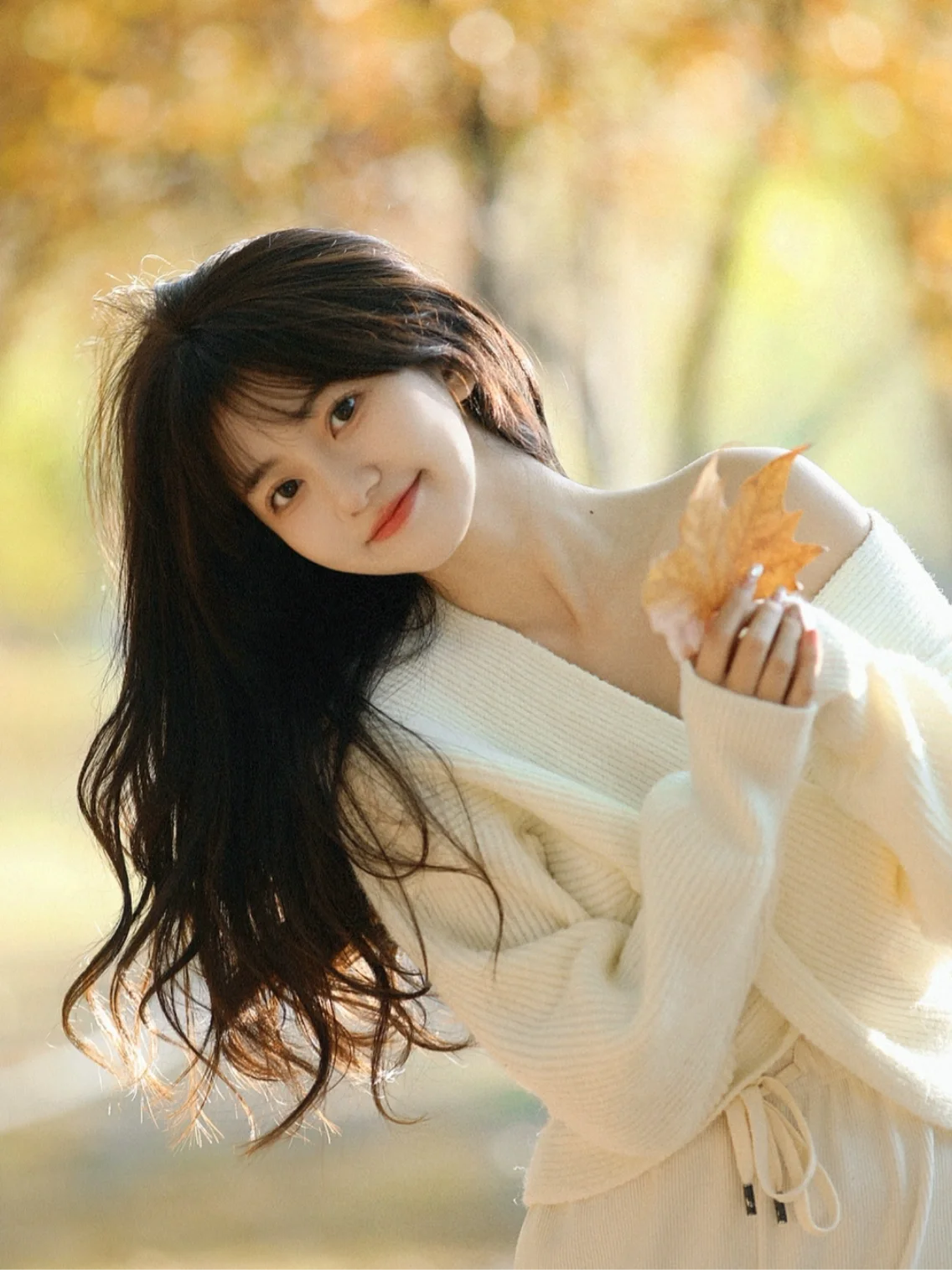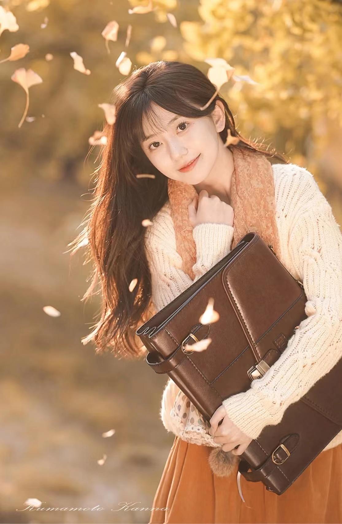 拍秋叶人像这类户外人像,道具的运用是必不可少的,结合上道具的使用,画面的氛围感会更足,颜色整体也会呈现地更为丰富。