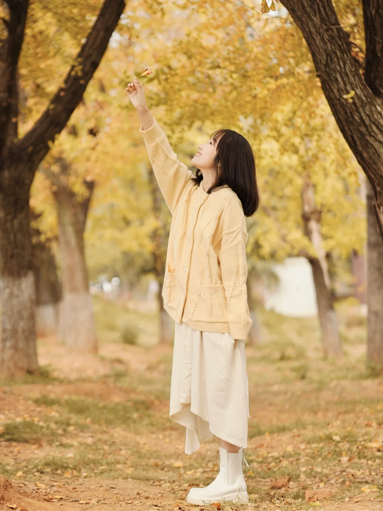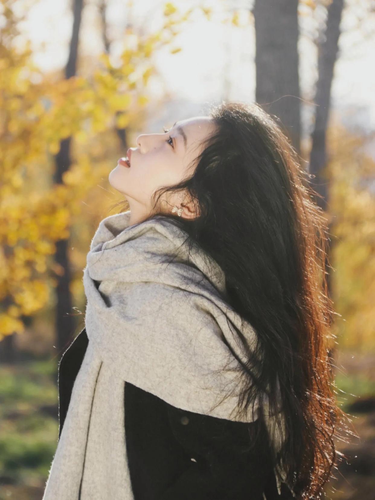 在秋叶林中拍半身照的时候,大家可以将自己好看的颈部、脸部线条展露给镜头,加强人像的线条美。