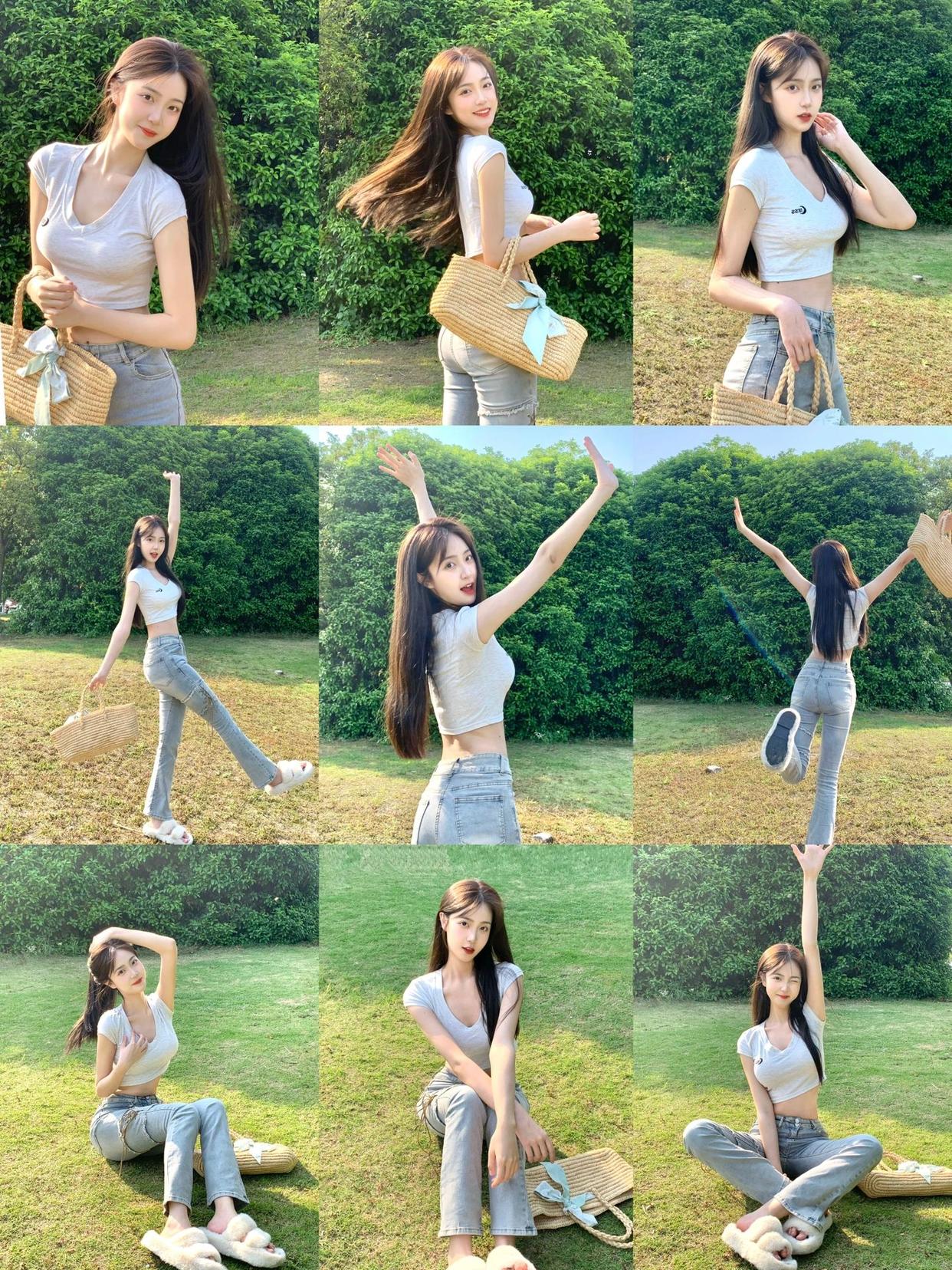 在公园草地上拍照,双手挎包是很经典的姿势。此时可以侧身歪头微笑看镜头,感受草地的自然氛围。通过微笑和眼神的交流,照片会更富有情感好看。