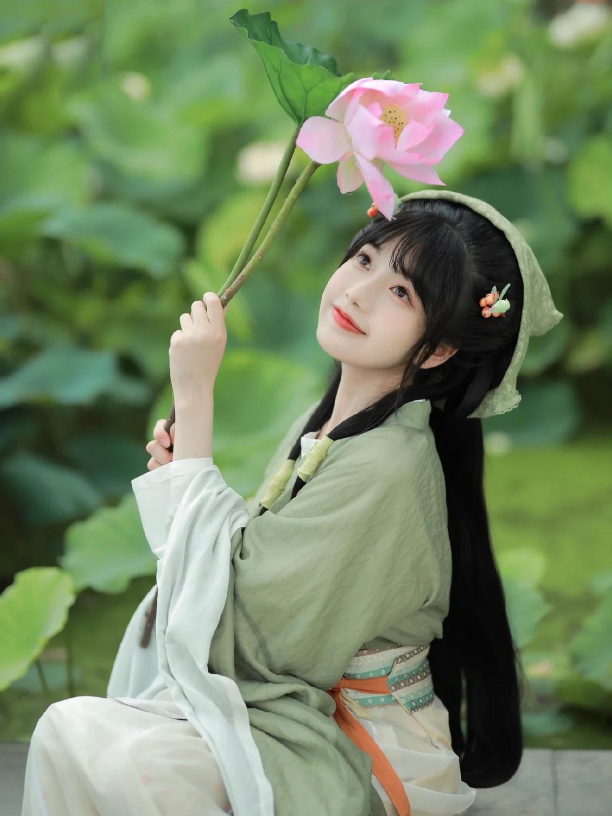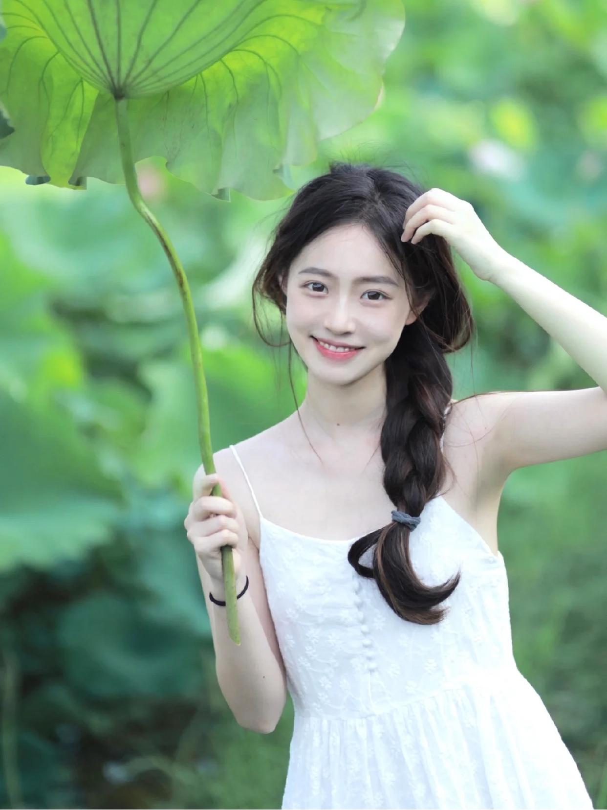 像下面的模特,手拿荷花半举起,抬头眼神顺势往荷花的方向看,模特的手与眼睛的方向一致,怎么拍都好看。