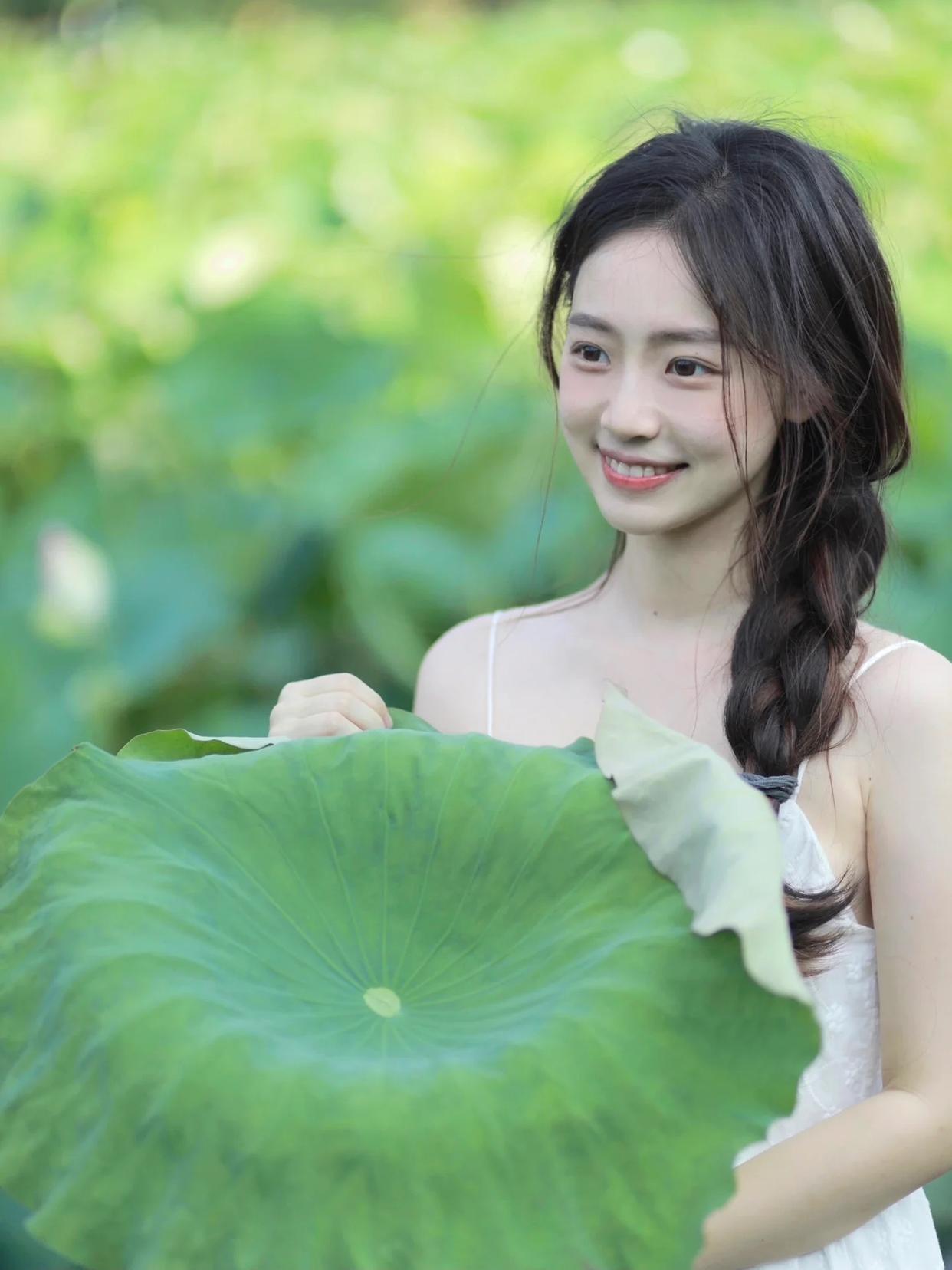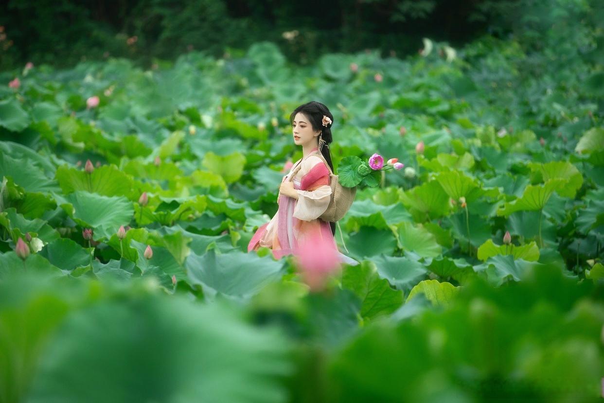 拍荷塘人像,画面的层次感也是很重要的,利用身边的荷花、荷叶作为画面的前景,不仅丰富了画面的立体感,也能遮挡住某些身材、五官的小瑕疵,拍出更美的照片。