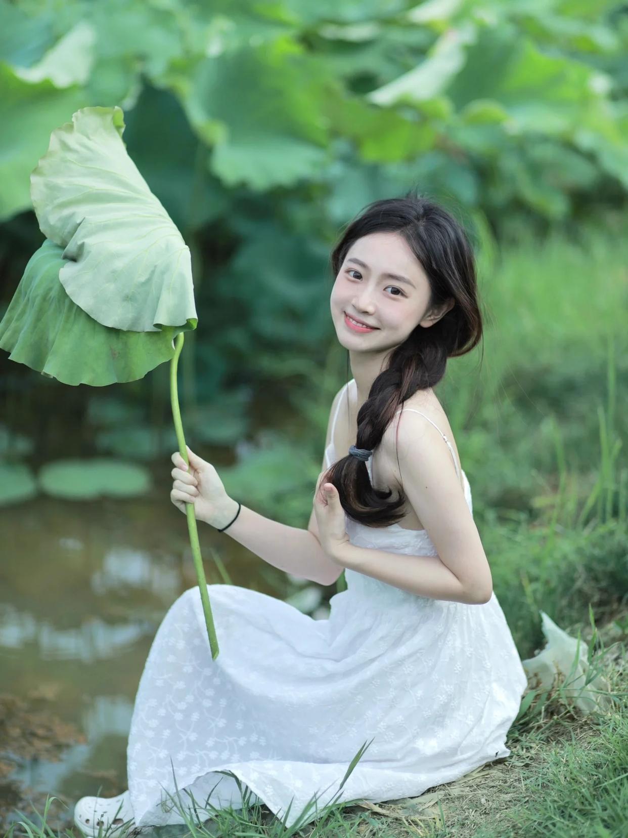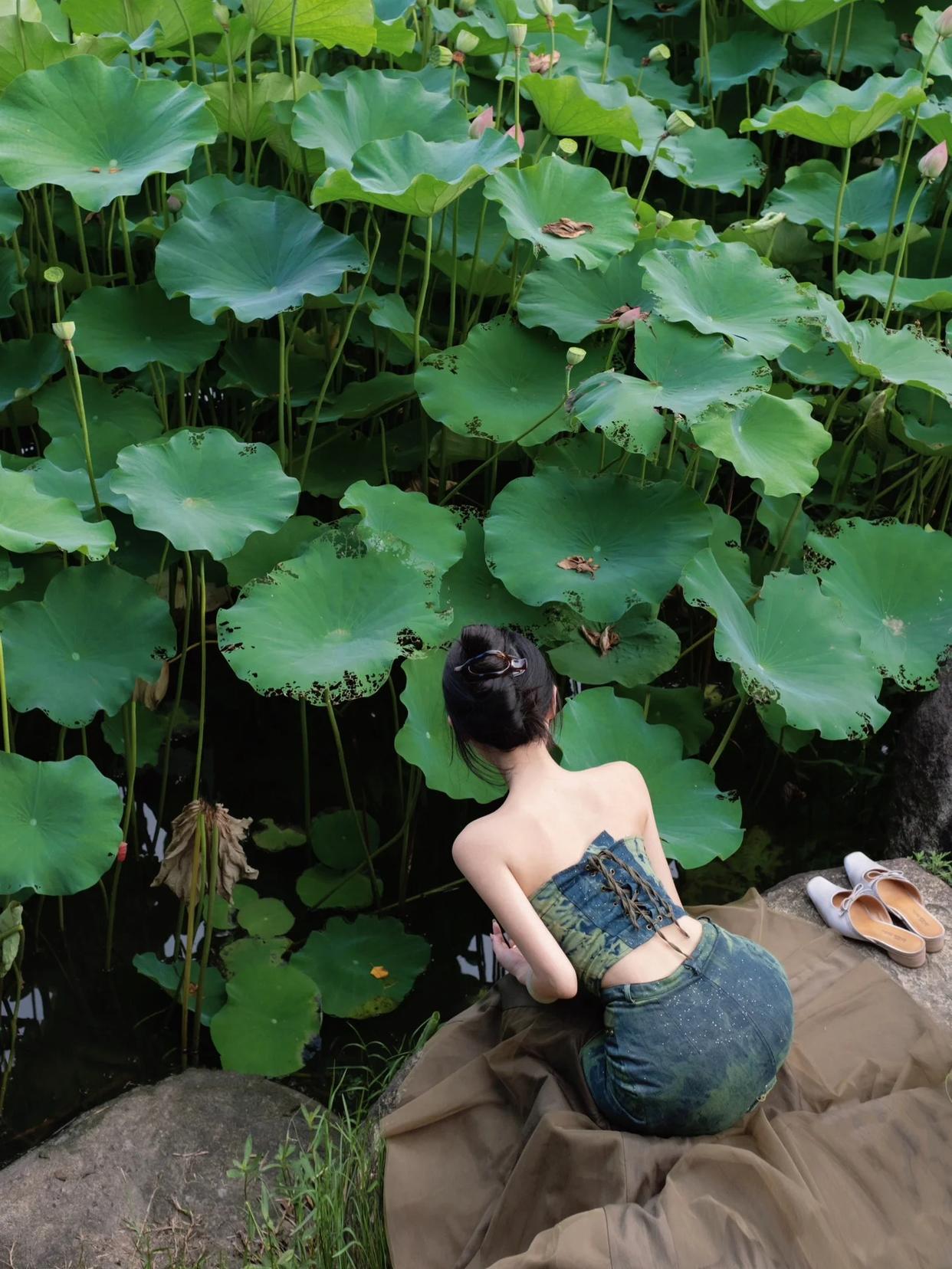 对于不常拍照的大多数来说,上镜紧张、不好意思是难免的,这时候摄影师可以引导模特背对镜头拍,参考下图,模特蹲在荷塘边,仔细的看花,摄影师从上方俯拍,效果也不错。