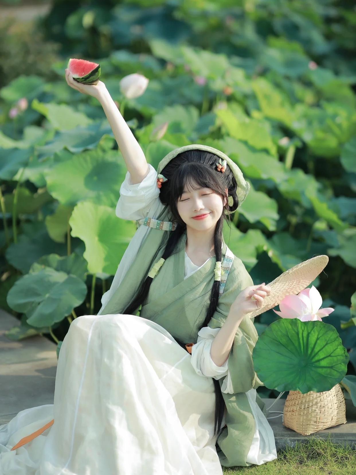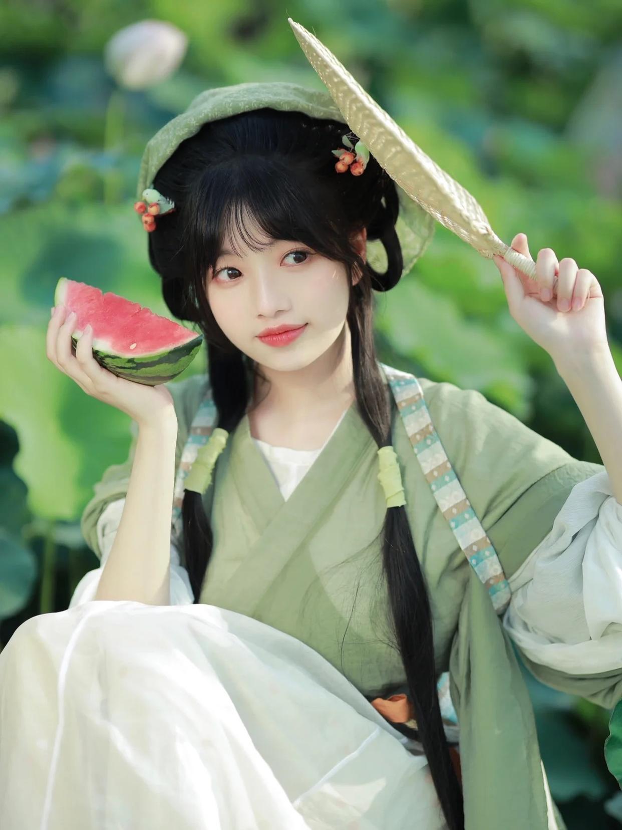 夏天的西瓜、扇子、油纸伞等都可以用起来,学下面的模特,一手拿西瓜,一手拿扇子挡太阳,实现遮阳的同时,人像摆姿更加多元有层次。