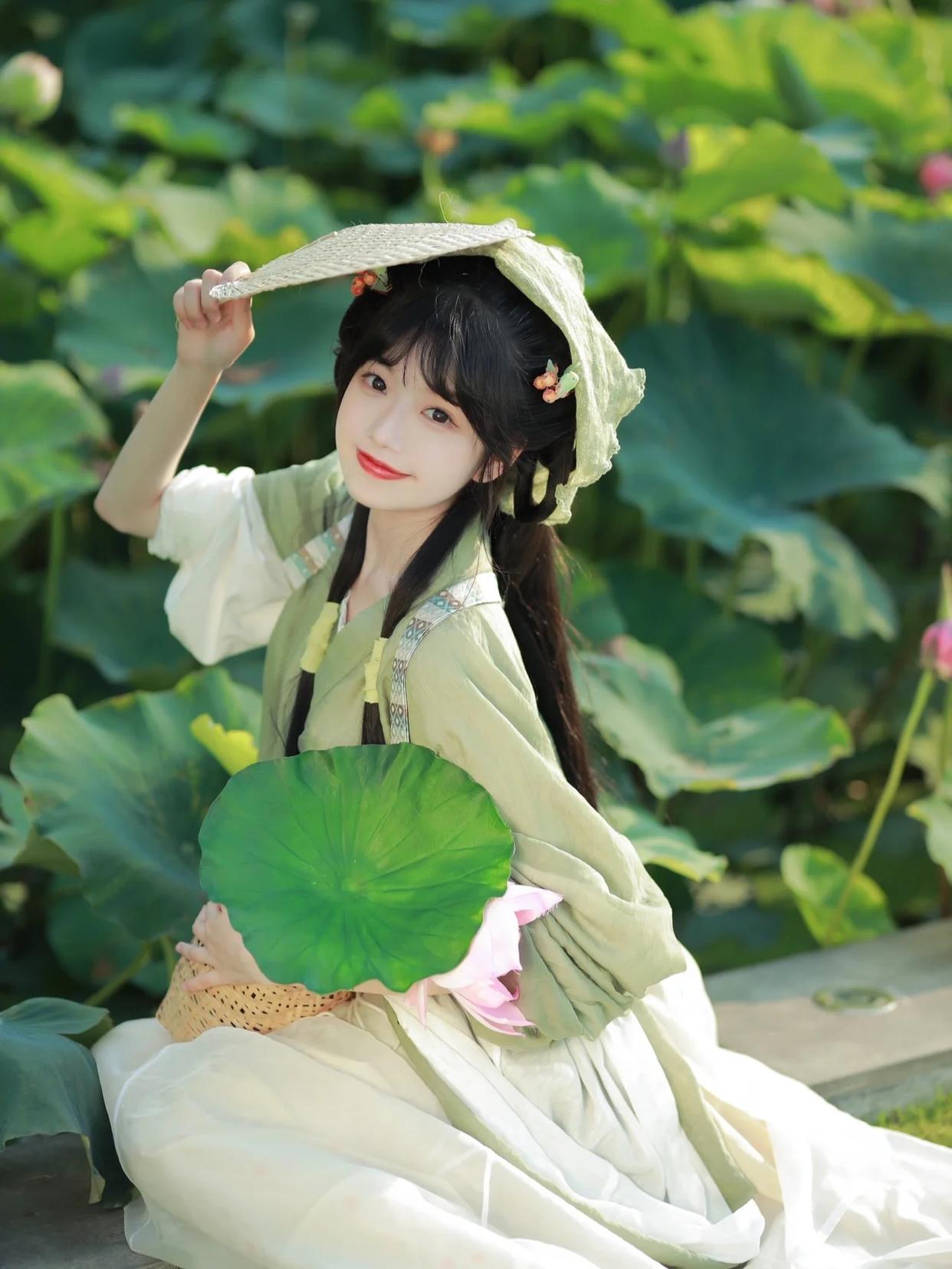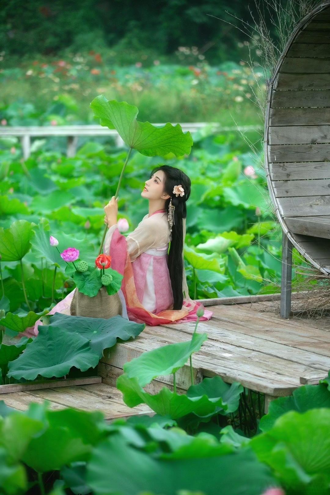 在荷塘中拍照,除了荷花荷叶外,很少有其他可以借力拍照的东西,所以,结合道具让模特的摆姿更丰富是不可少的。