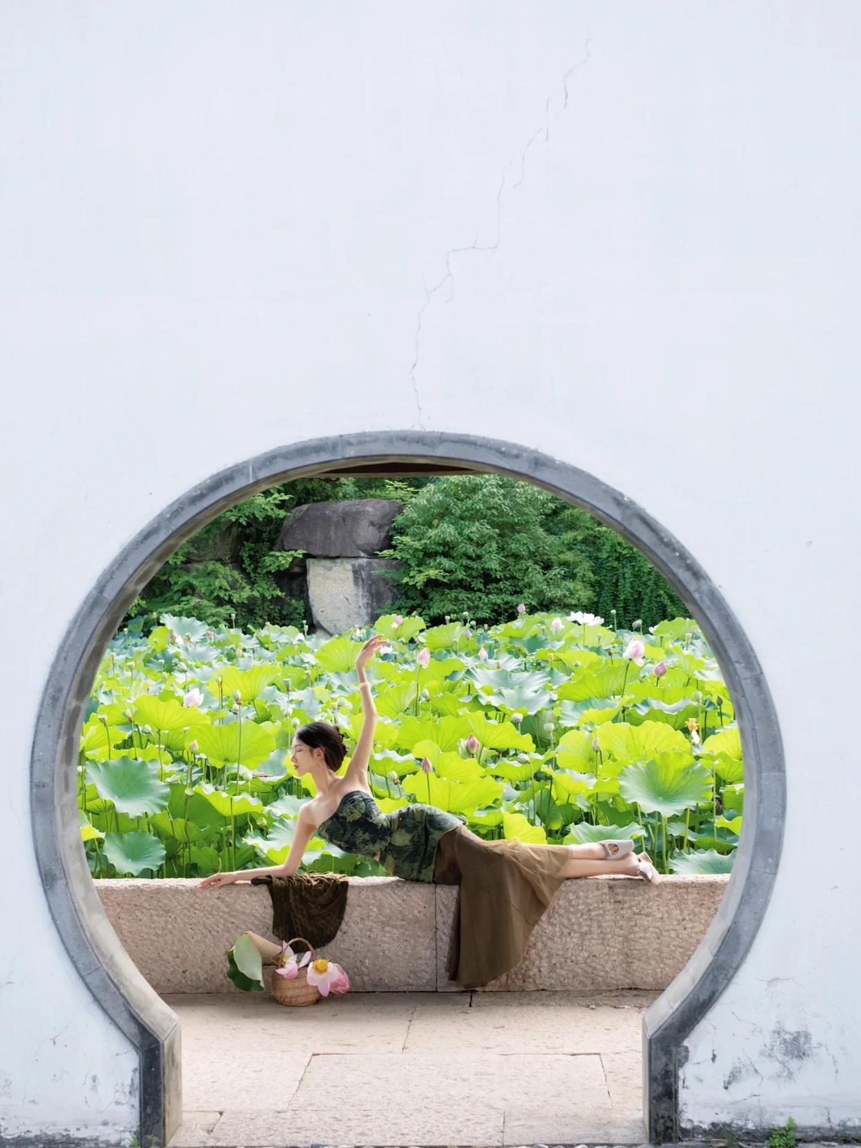荷塘附近一般都有一些古色古香的建筑,在实际的拍摄中,可以借助这些场景加强画面的韵味和氛围感,像下面一般,透过门框这个框架拍人像,简洁画面的同时人物也很突出。
