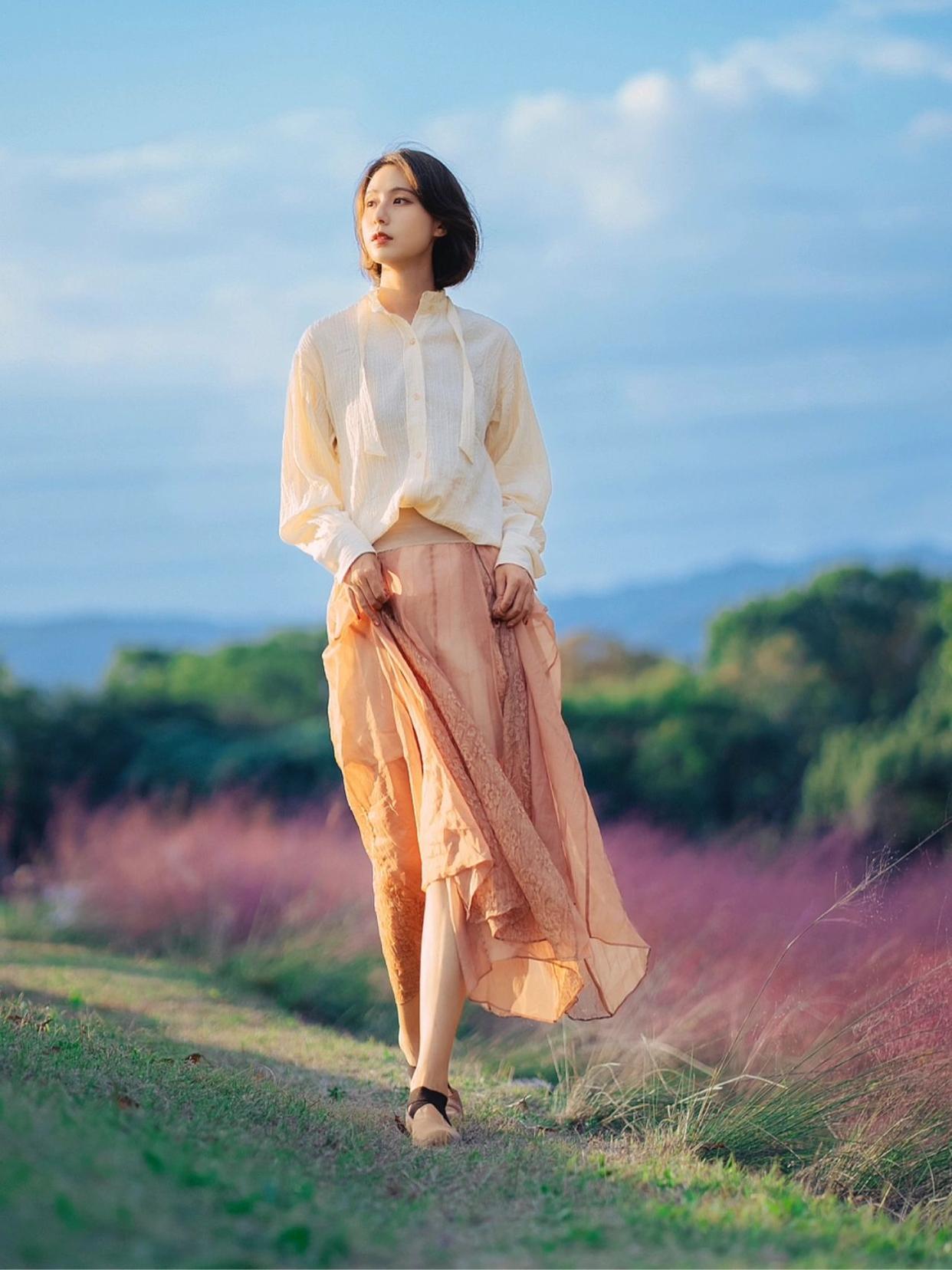 站在镜头前,双手抬起挡住太阳,同时两只脚自然并排站立,眼神自然看向旁边别处,能够营造出一种优美的姿态,让腿部看起来更加修长。