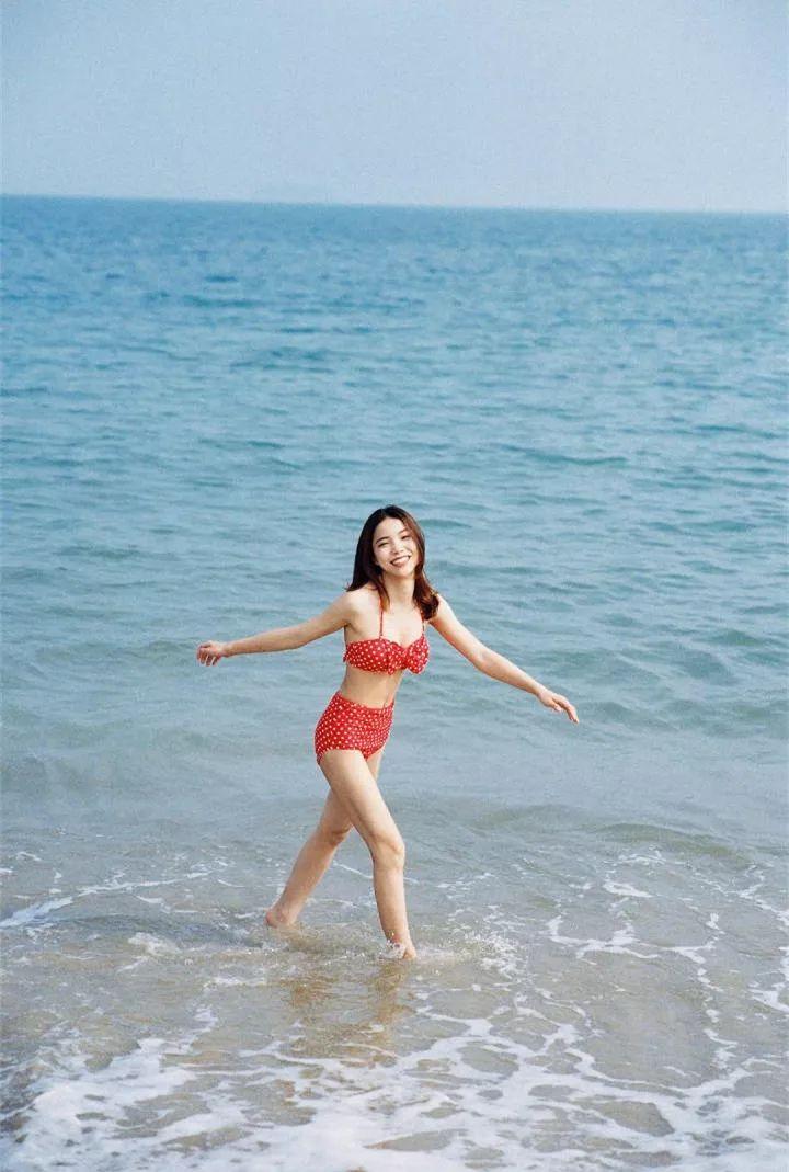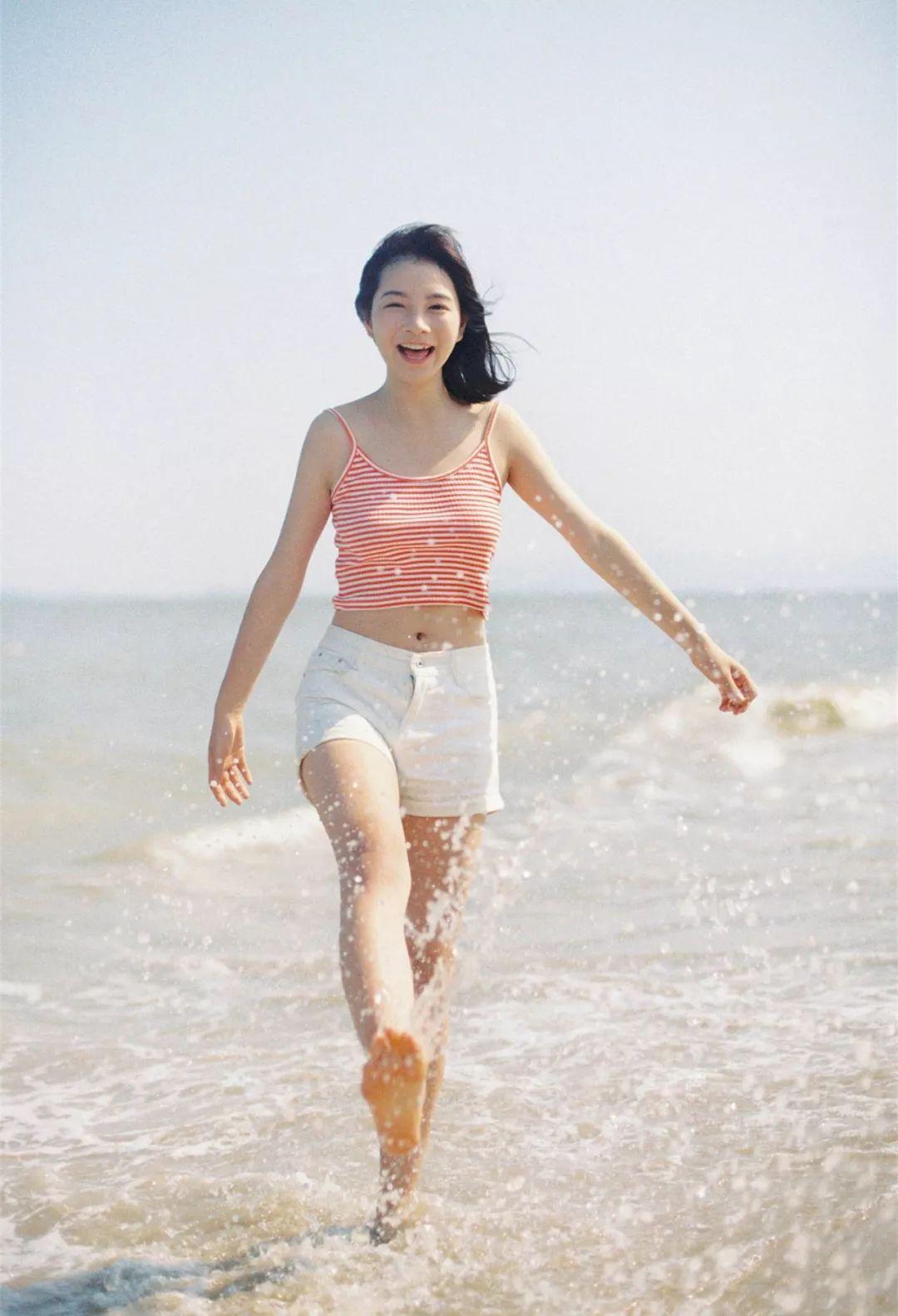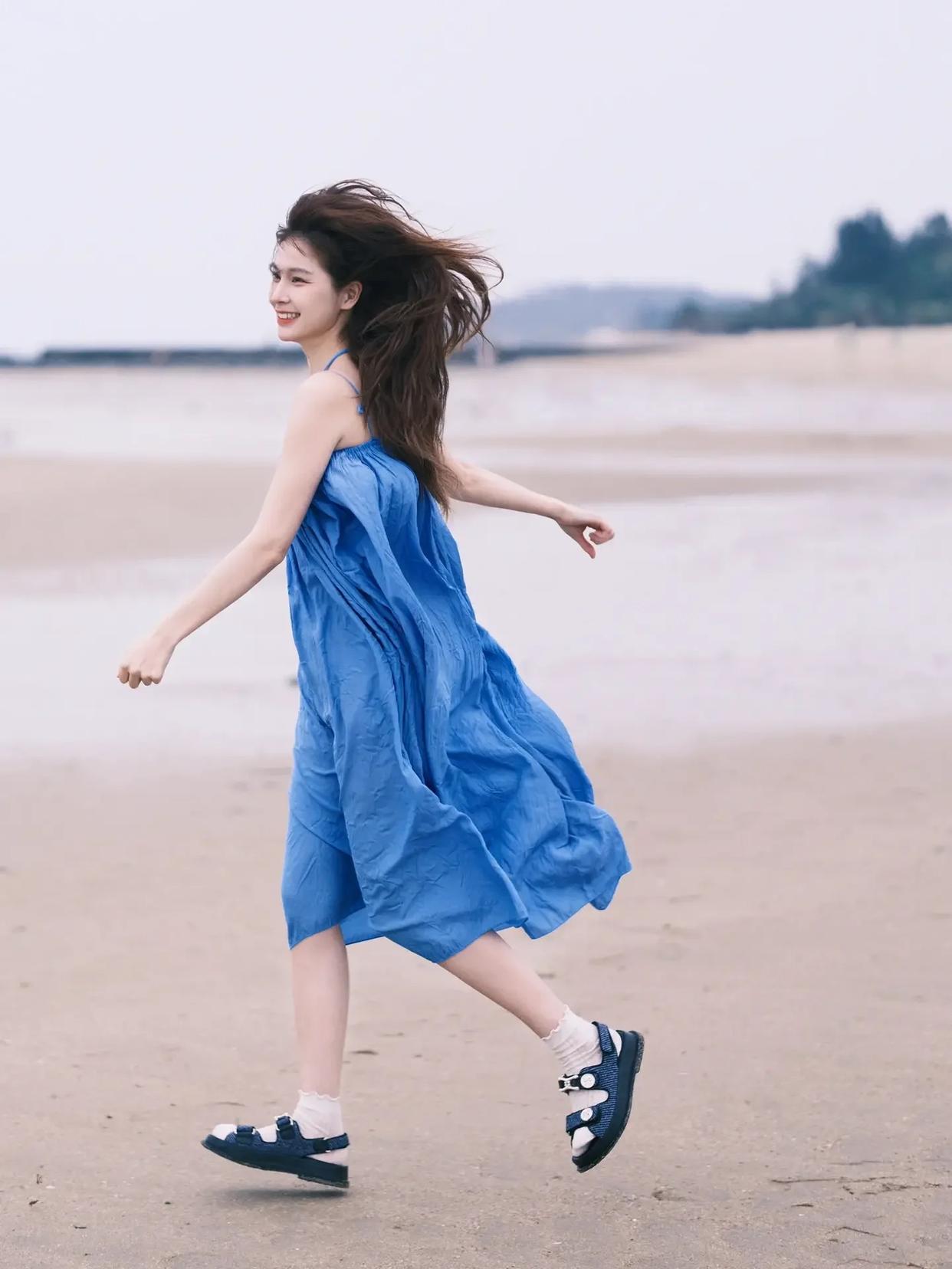 假装被海浪追赶,朝着岸边跑上来,自然的摆姿和随动作飘动的发丝,都能赋予画面满满的动态美。