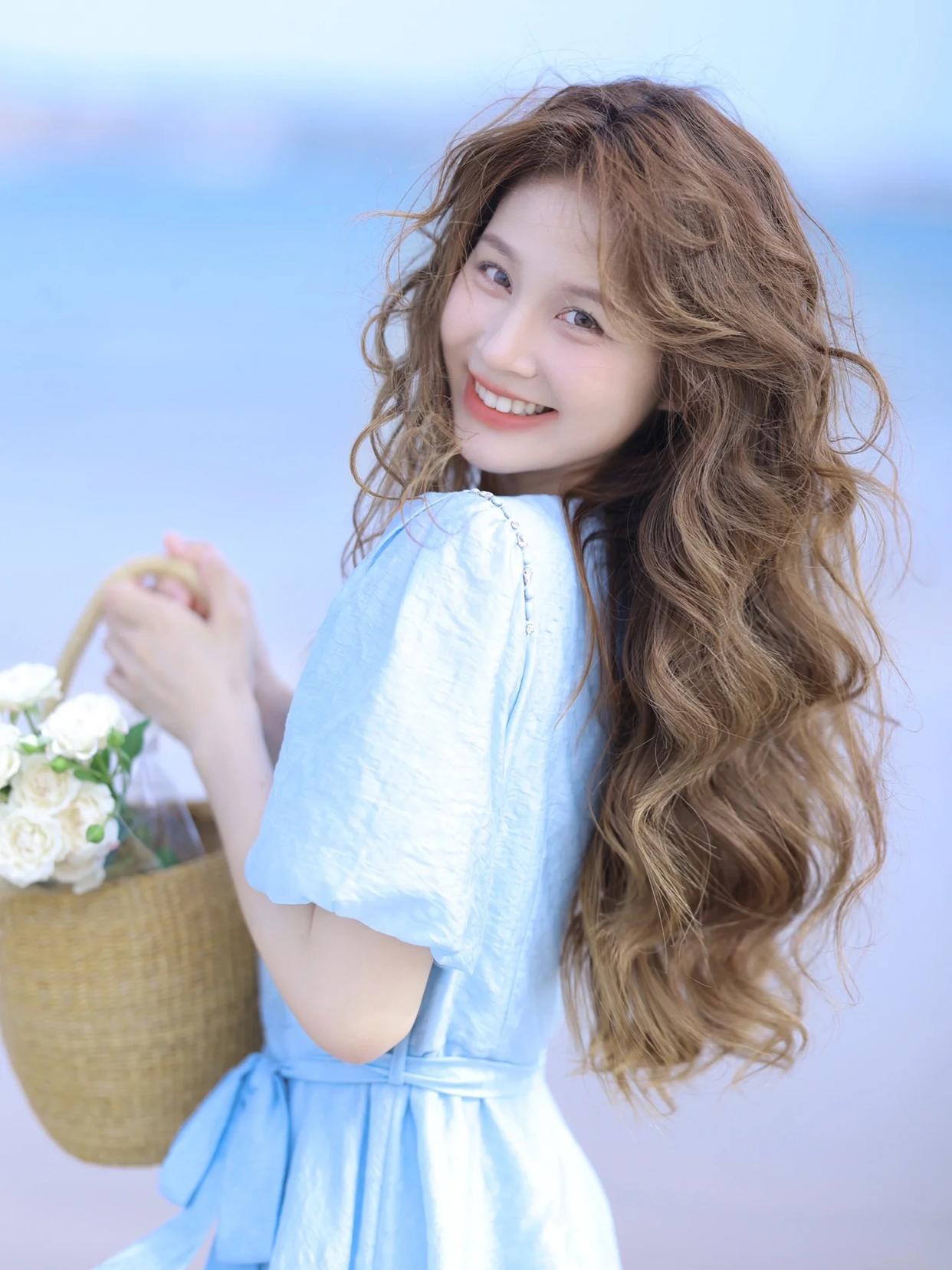 夏天也是百花齐放的季节,在海边拍照的时候,不妨用好这些五颜六色的花花草草,为画面增添更多的美好,手拿花篮,侧身对镜拍半身,层次、色彩都很丰富。
