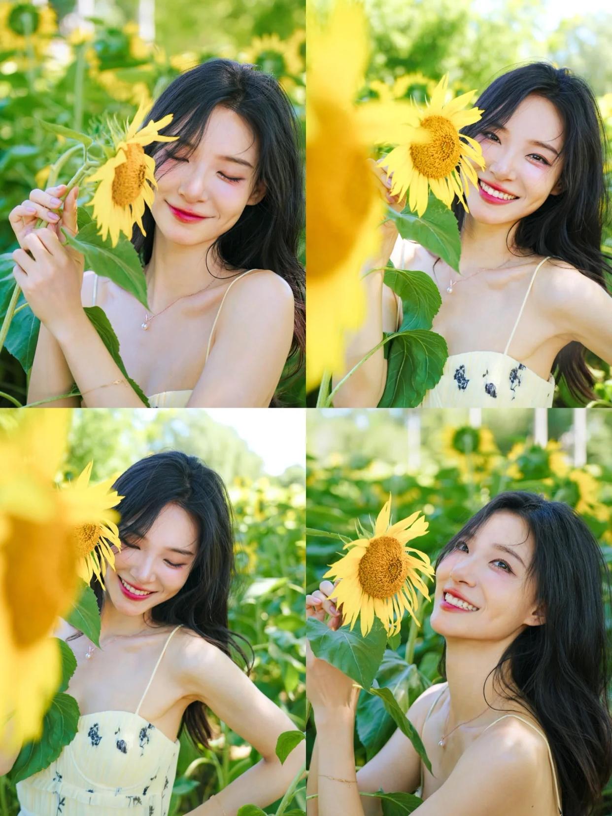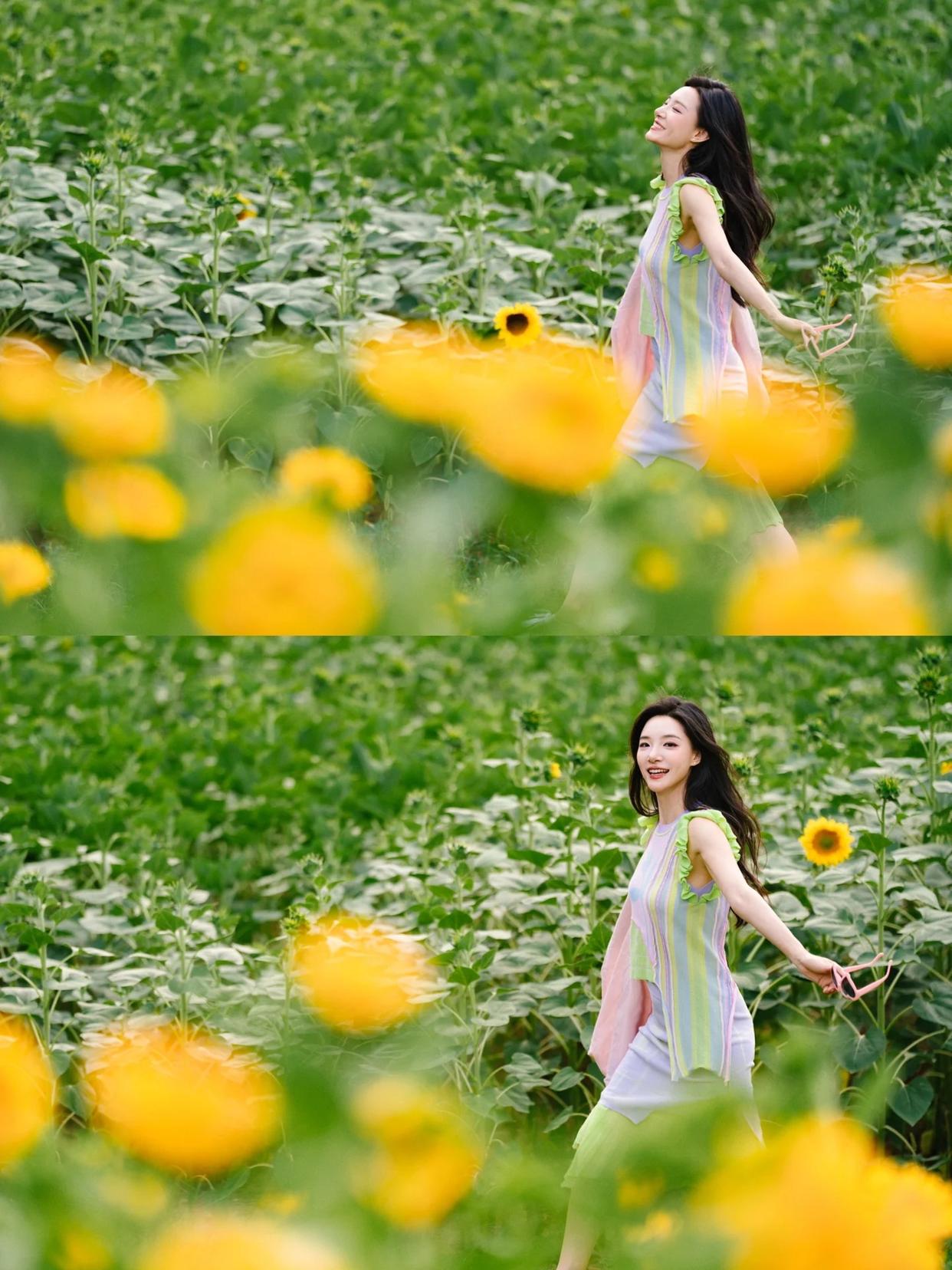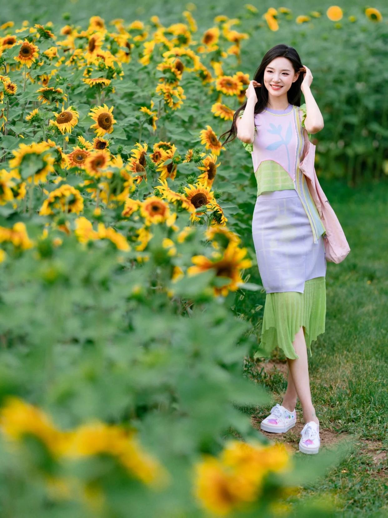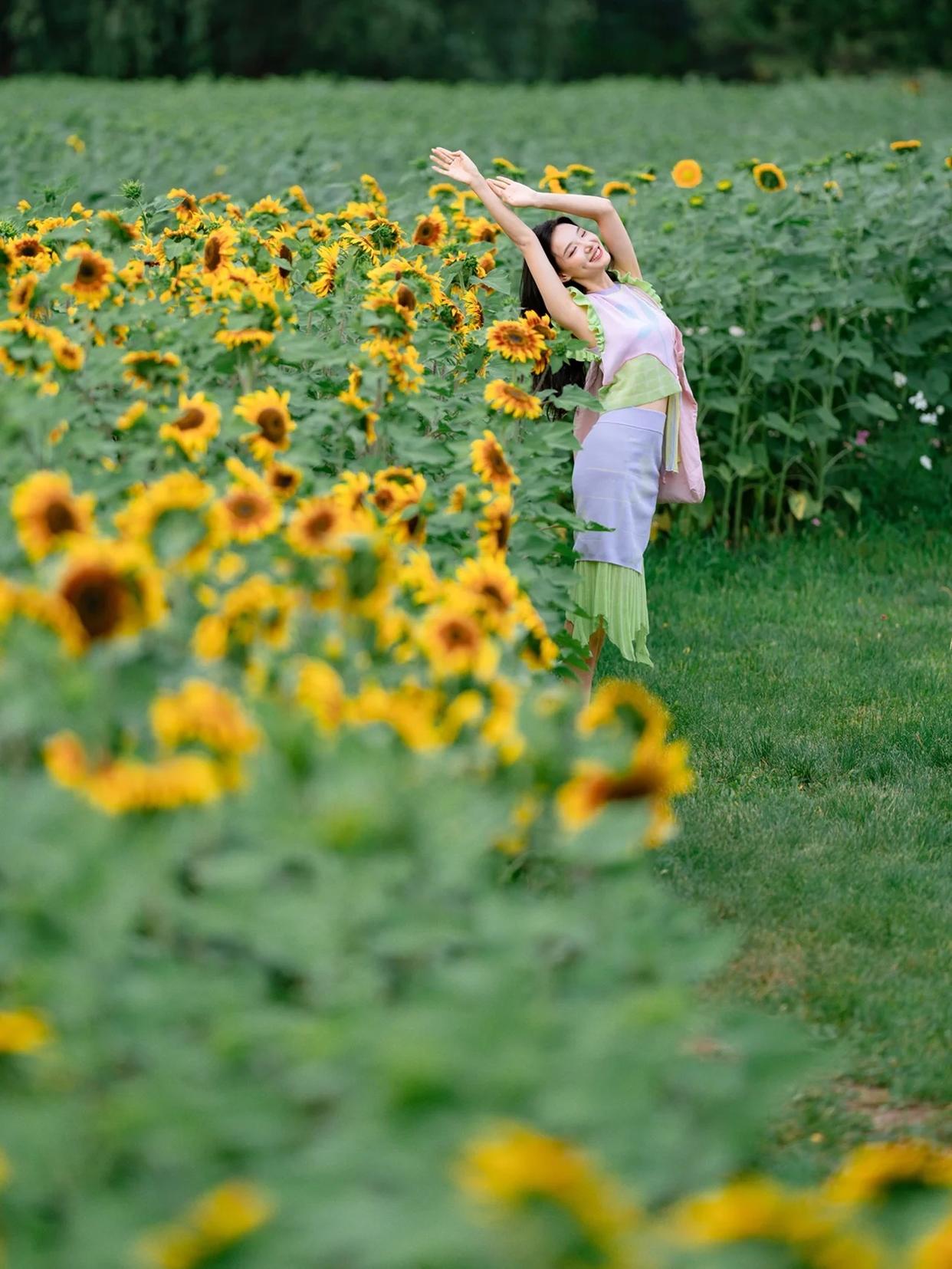 在以近景或特写拍摄的时候,向日葵本身就是很好的拍照道具,手拿花或凑近花拍,挡住自己的半边或三分之一的脸,拍照不仅显脸小,也能和花互动起来,帮助人物更好地融入环境之中,实现人景合一。