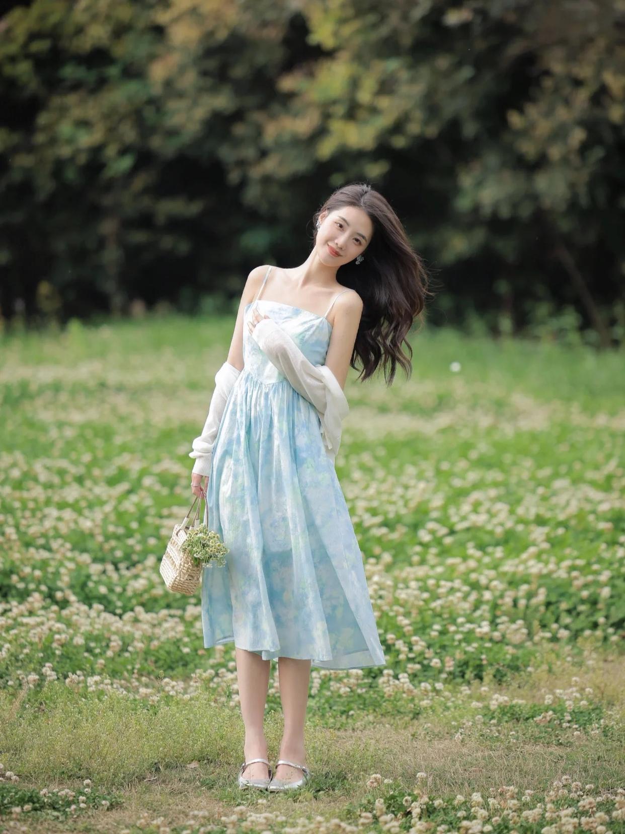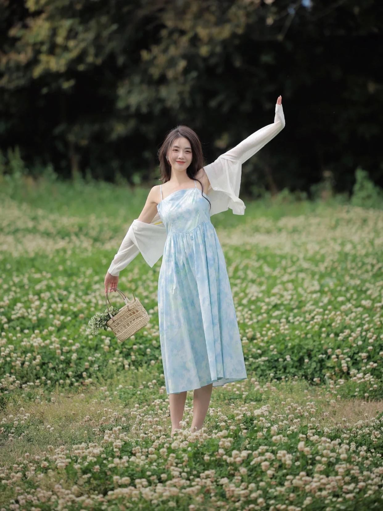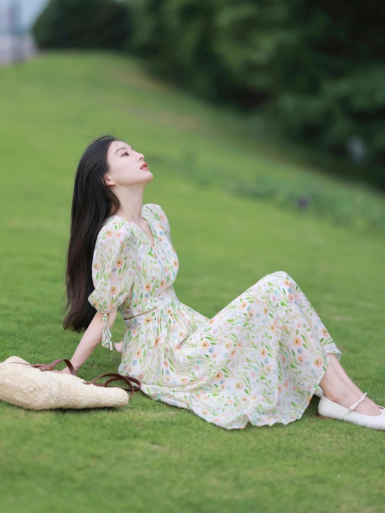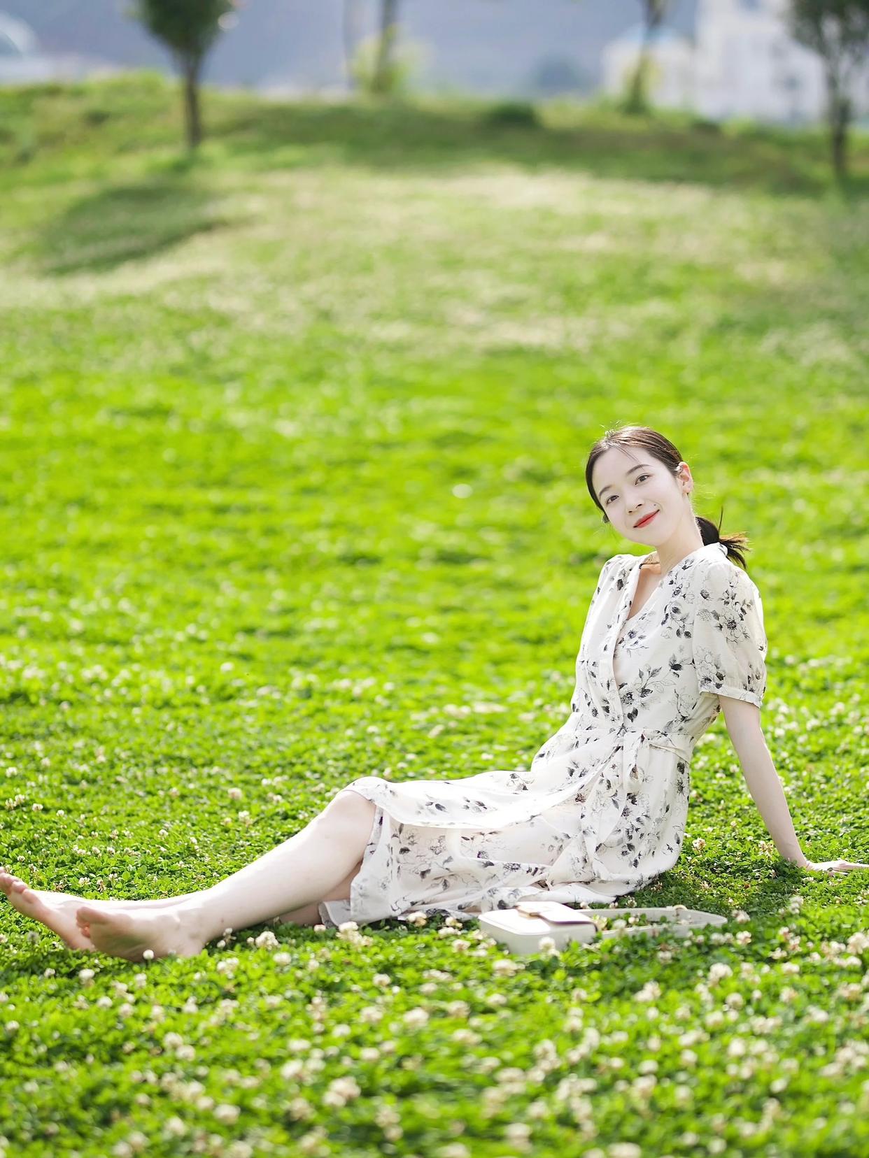 如果是平坐在草地上拍全身照,可以像下面的模特一般,脚往侧前方延伸,双手撑地,身体往后仰,再搭配一个仰头的动作,从模特侧前方拍,身体的线条以及脸部的五官轮廓都能很好地突显出来。