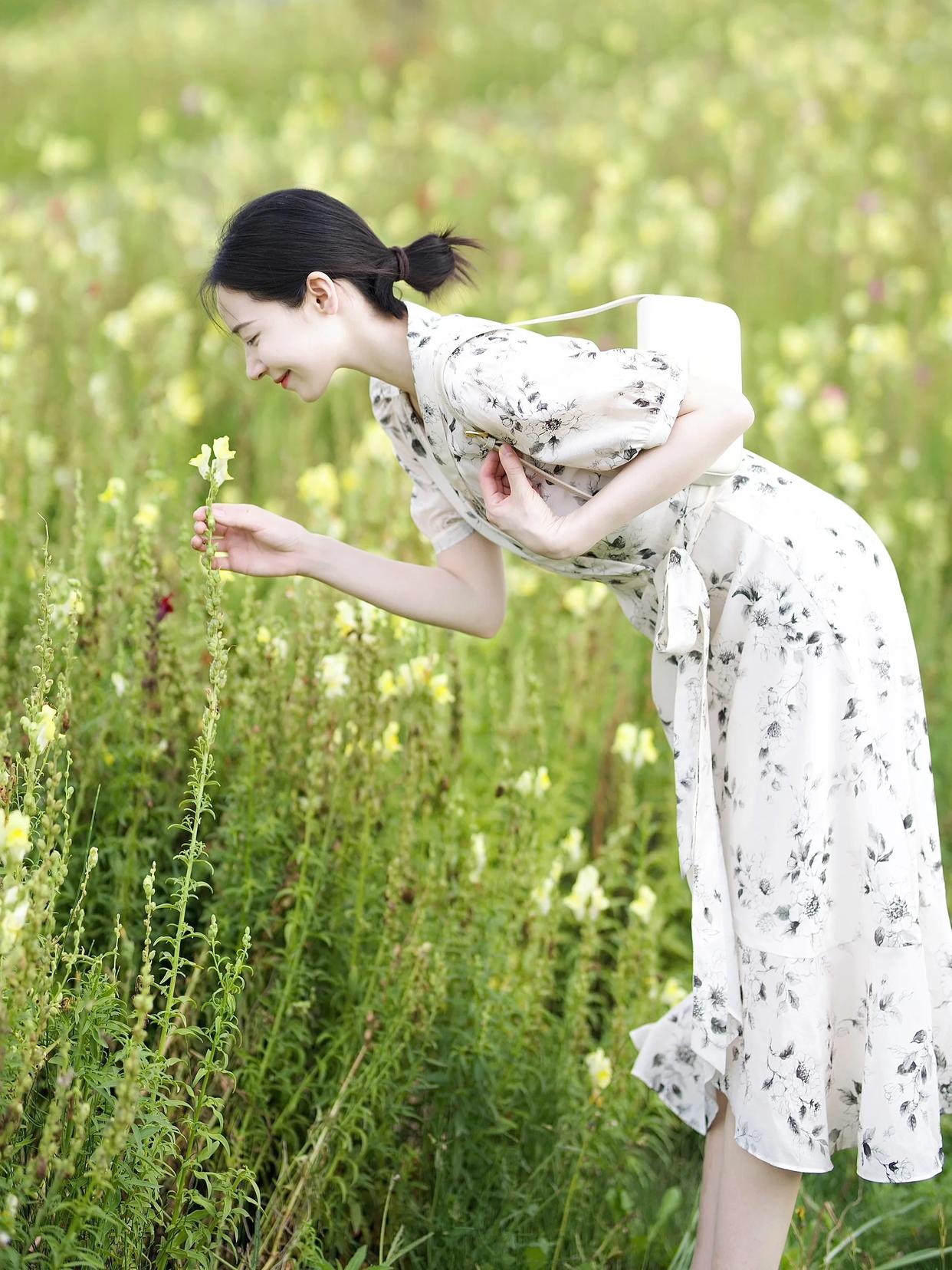 在花海中拍照,最为自然的拍照姿势莫过于和身边的花花草草互动起来,比如弯腰闻花低头看花、凑近花拍都可以,帮助模特融入拍照环境之中,怎么拍都自然好看。
