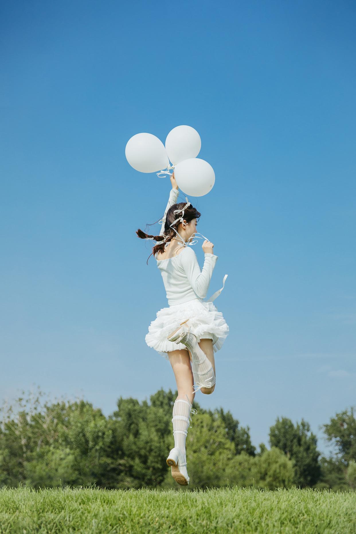 低角度的仰拍是拍全身照的好机位,将机位放低,让模特背对镜头,在拍照的时候跳起来,摄影师都抓拍,选择姿势自然,构图又合适的一张即可。
