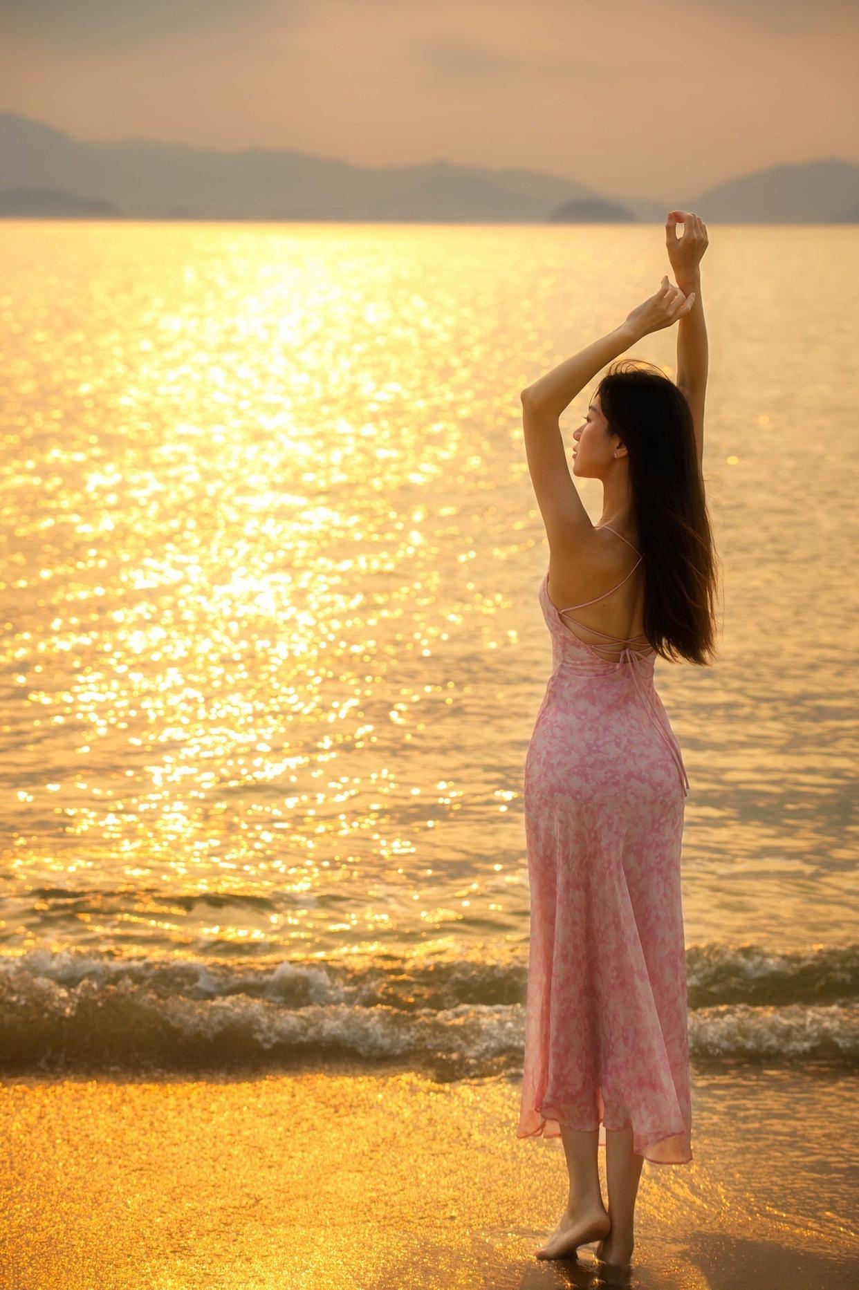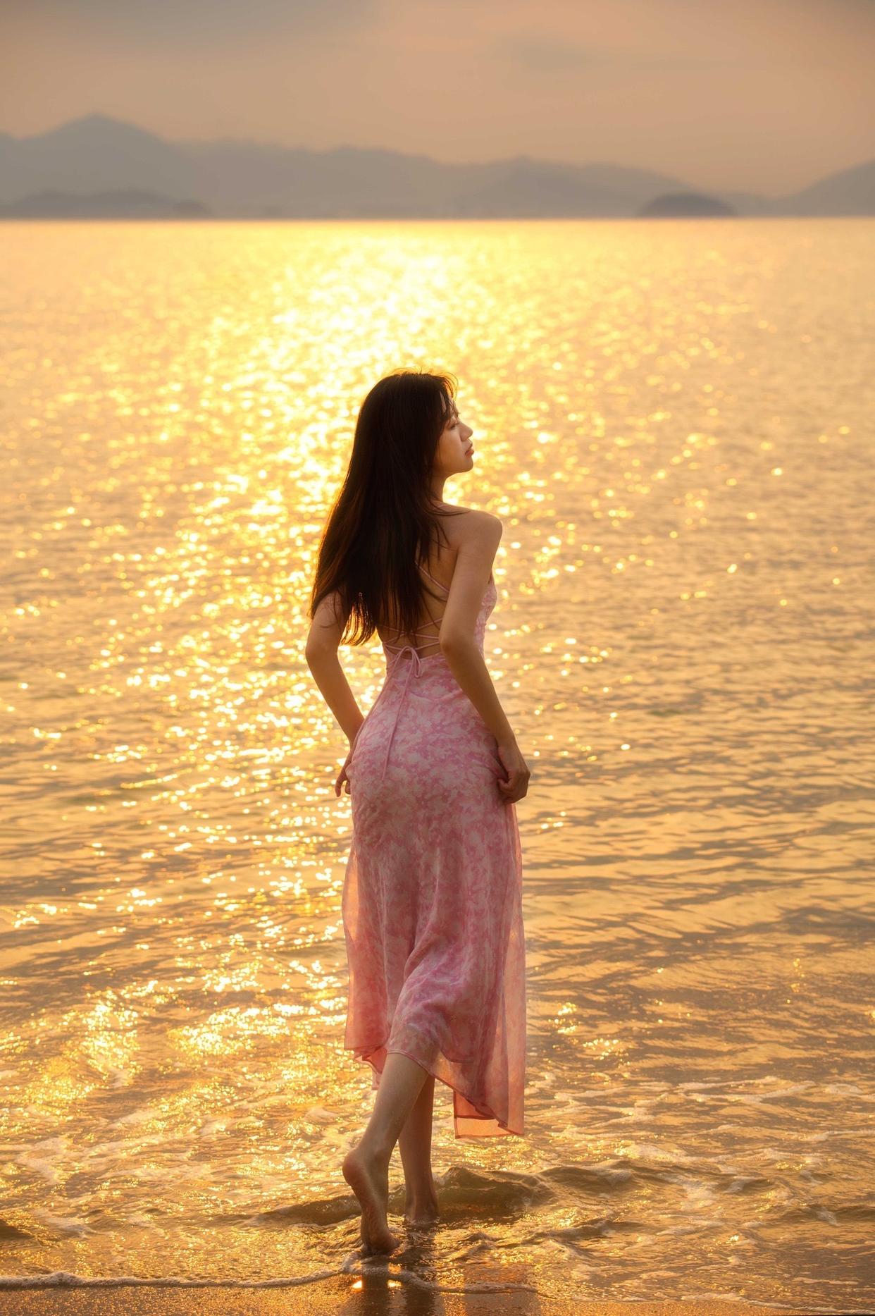 黄昏的光打在海面,形成波光粼粼的效果,这个时候即便是拍背影也很出彩、漂亮。