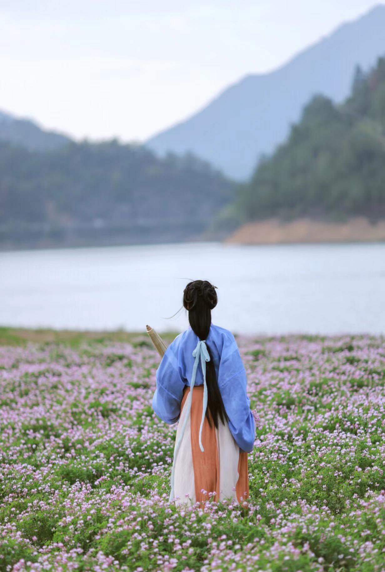 以下图为例,镜头前的花为画面的前景,人物处于中景,背后的山水、天空为背景,呈现前、中、后三个层次,照片的空间感也就出来了,有了空间感的照片看起来更舒适,有氛围感。