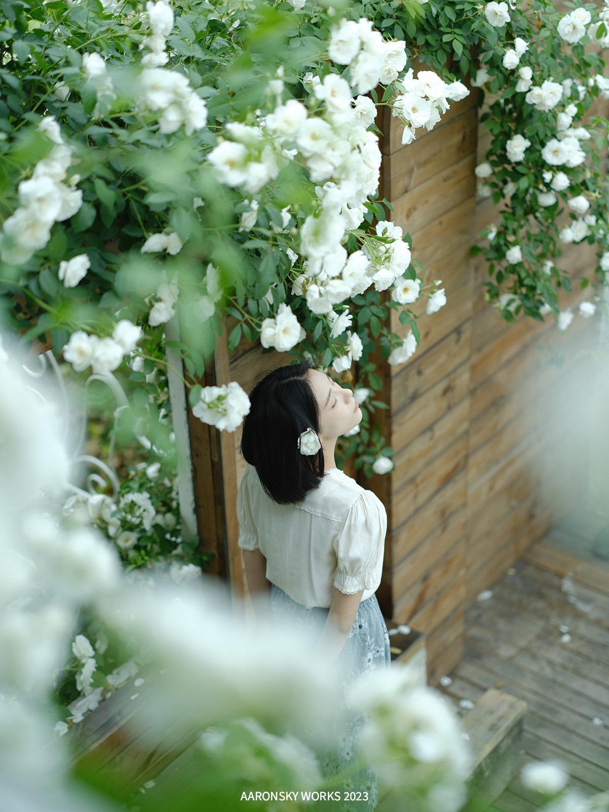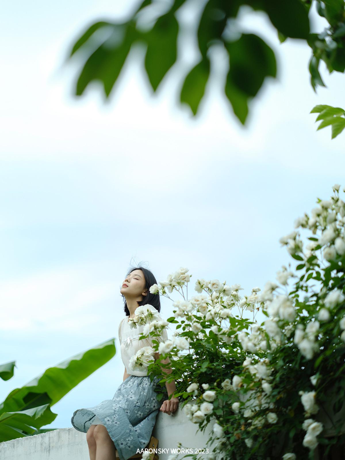 高角度的俯拍,可以在镜头前加入前景,让画面整体呈现地更加多元,比如用前景花形成一个自然的框架,将人物框起来,拍模特仰头的侧颜照就足够好看。