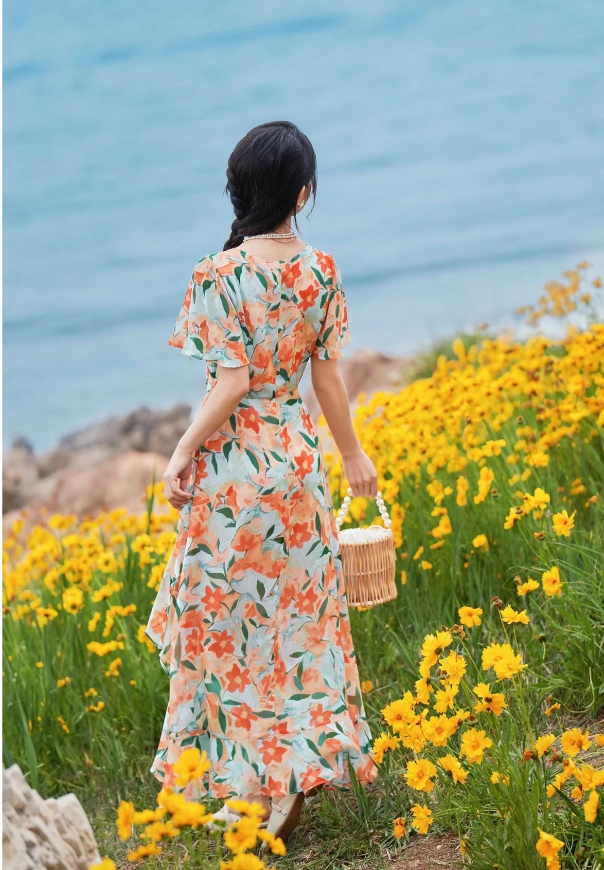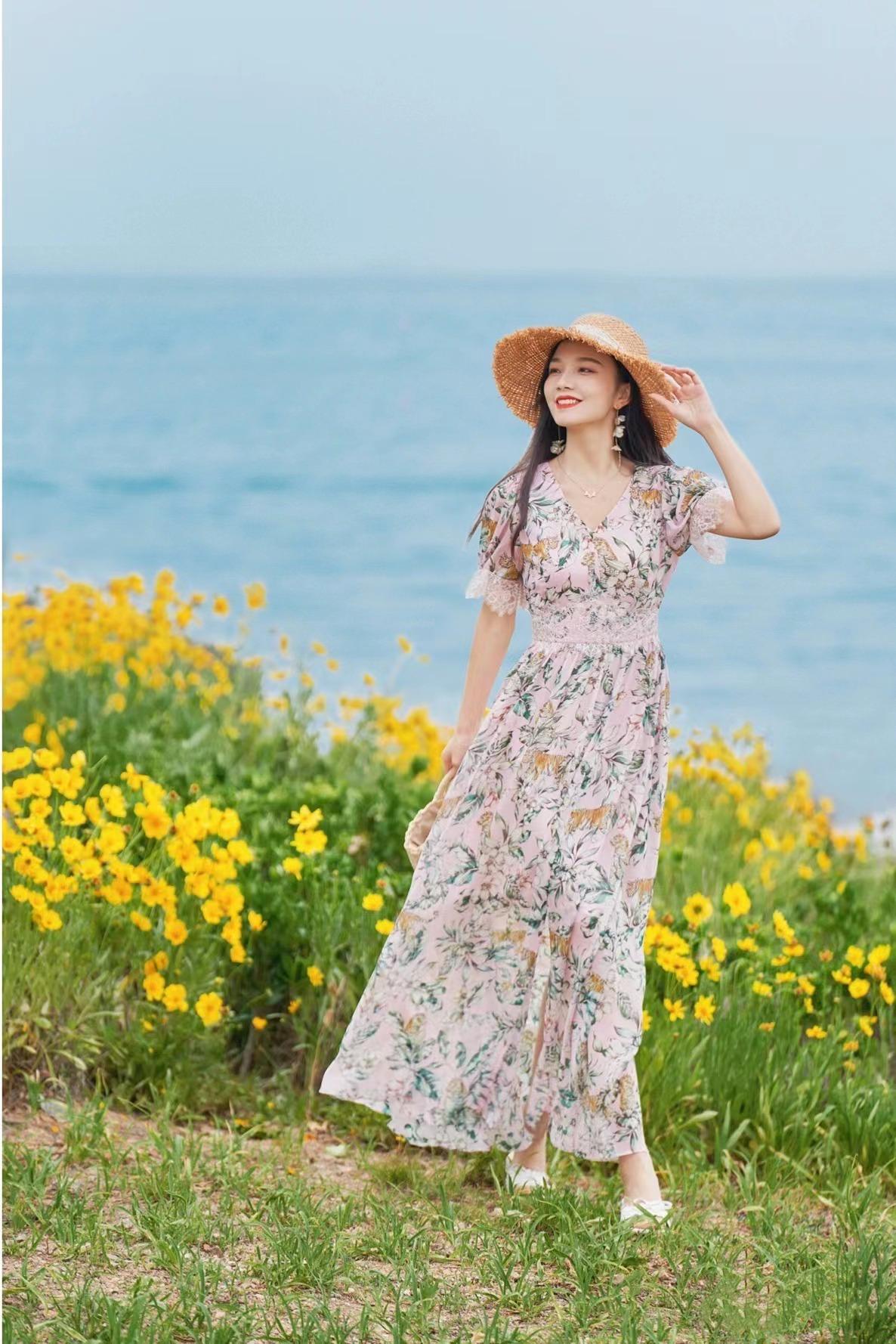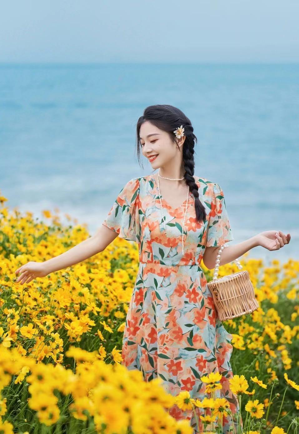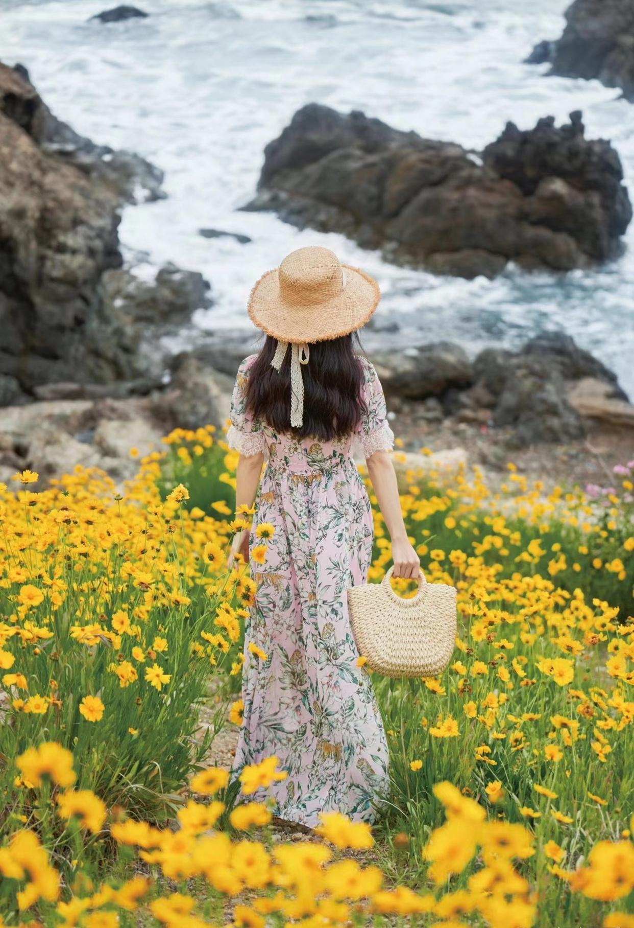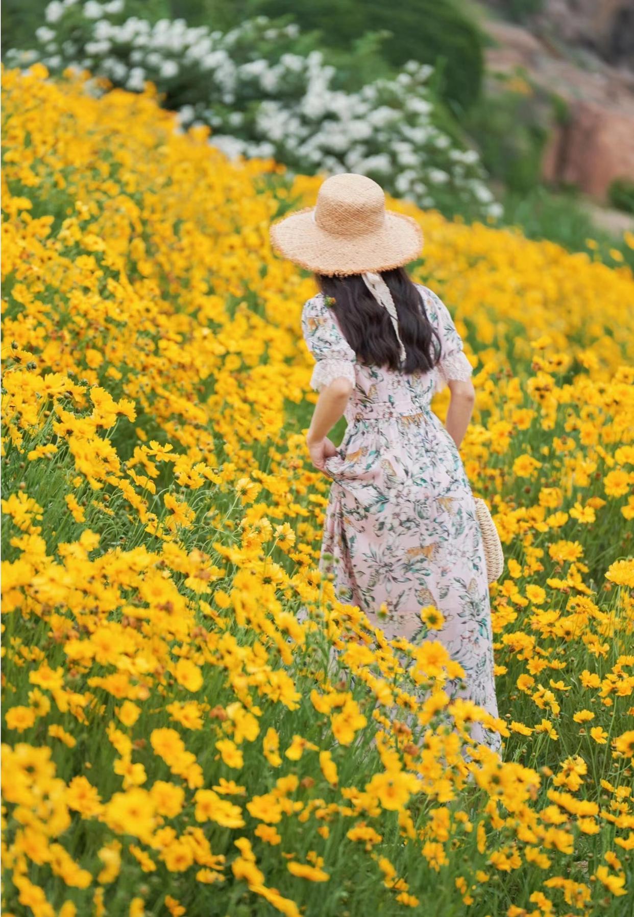 带点动态的背影照可以很好地抓住观众的眼球,边提裙摆边走在花海之中,拍照很有童话般的故事感。