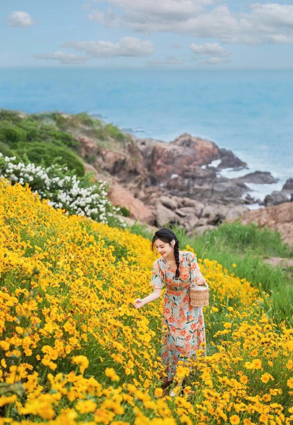 比如在花海中拍照,可以指导模特弯腰低头,伸手摸花、眼神看花、闻闻花香,建议以全景或远景拍摄,让人物融入到环境之中,实现人景合一