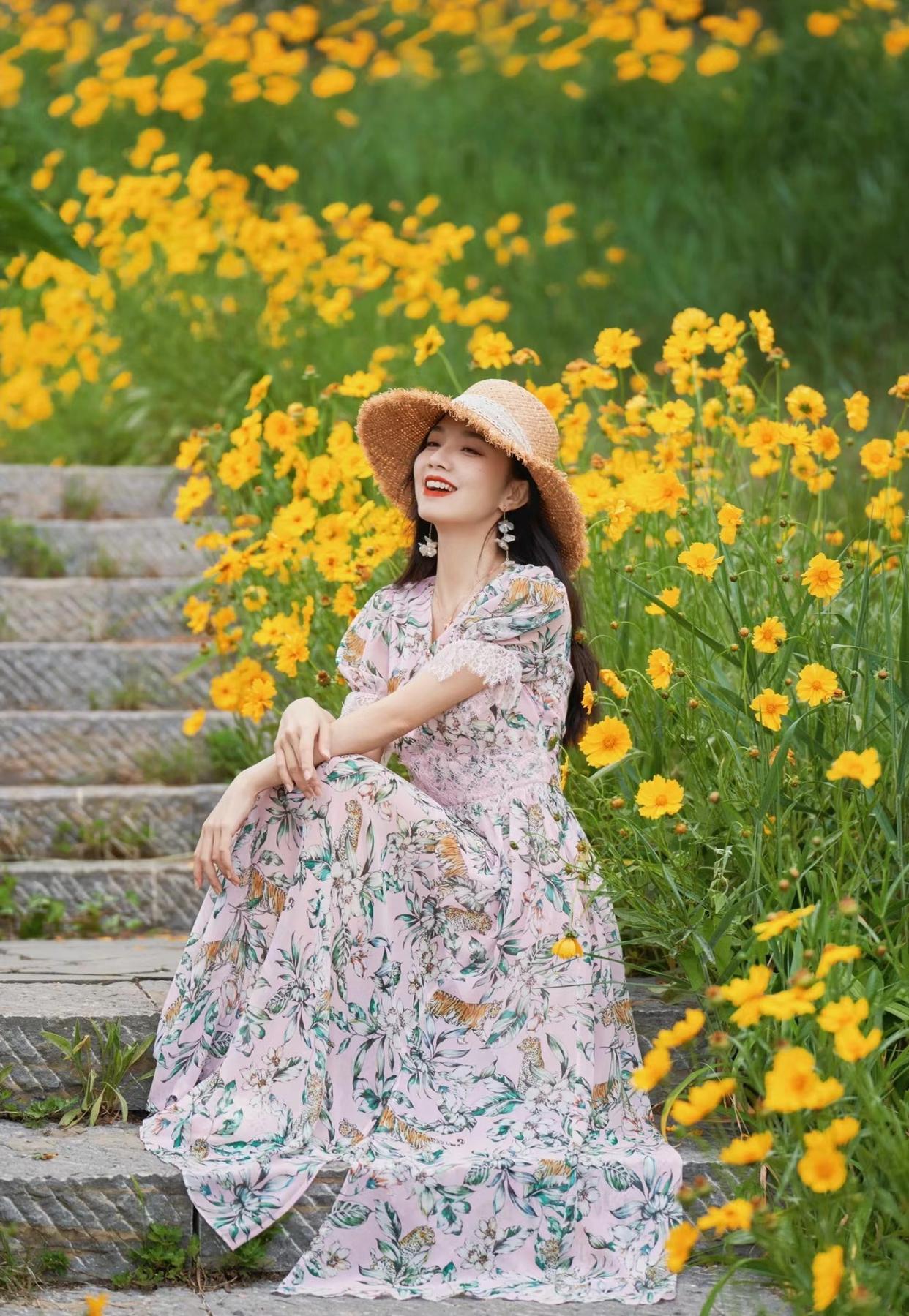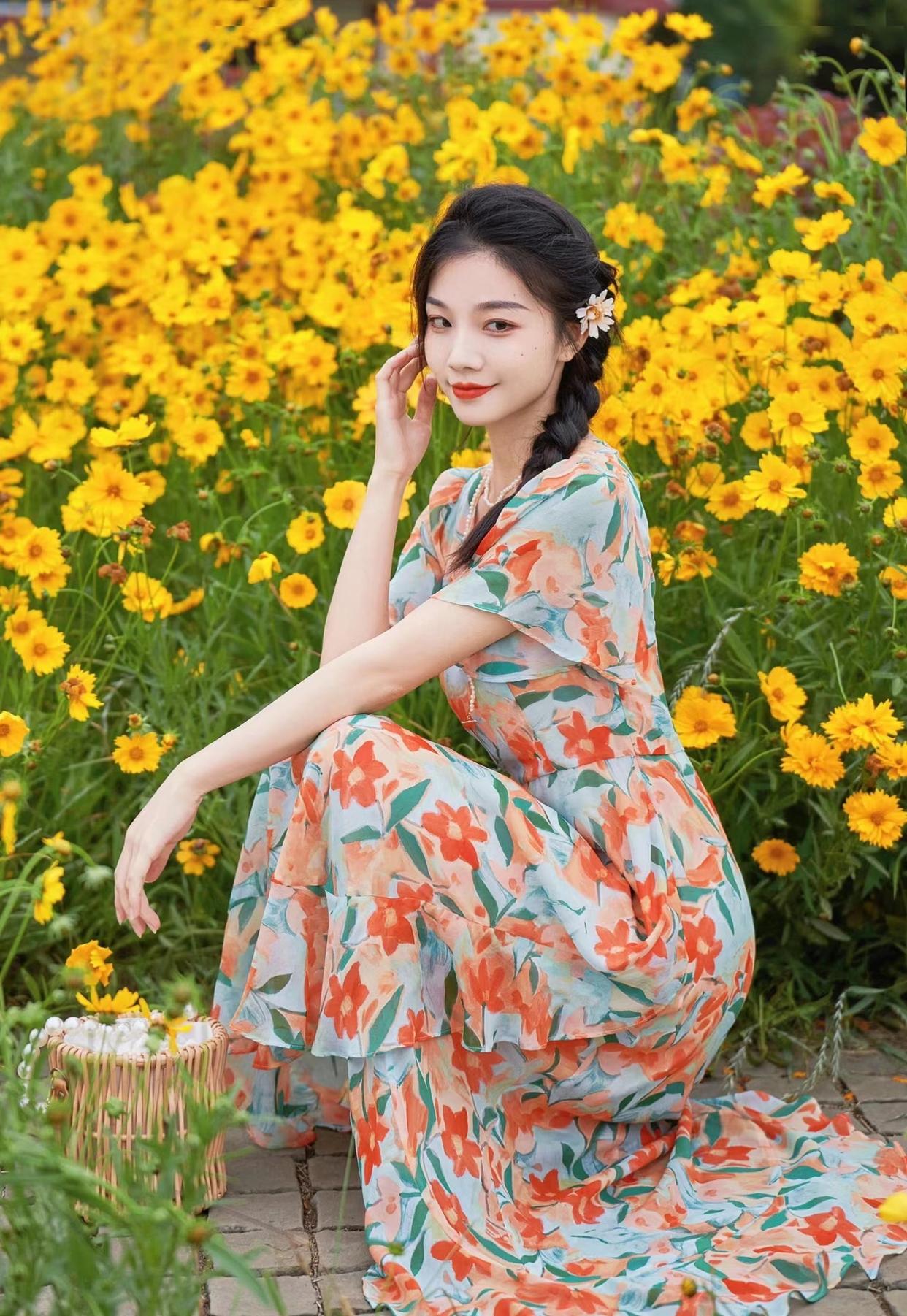 蹲姿虽然在人像摄影中并不常见,但在好看的背景中,也是很值得尝试的一个姿势,参考下图模特,侧身蹲在花海面前,将手搭在膝盖上,保持一上一下的状态,也是很好看的。