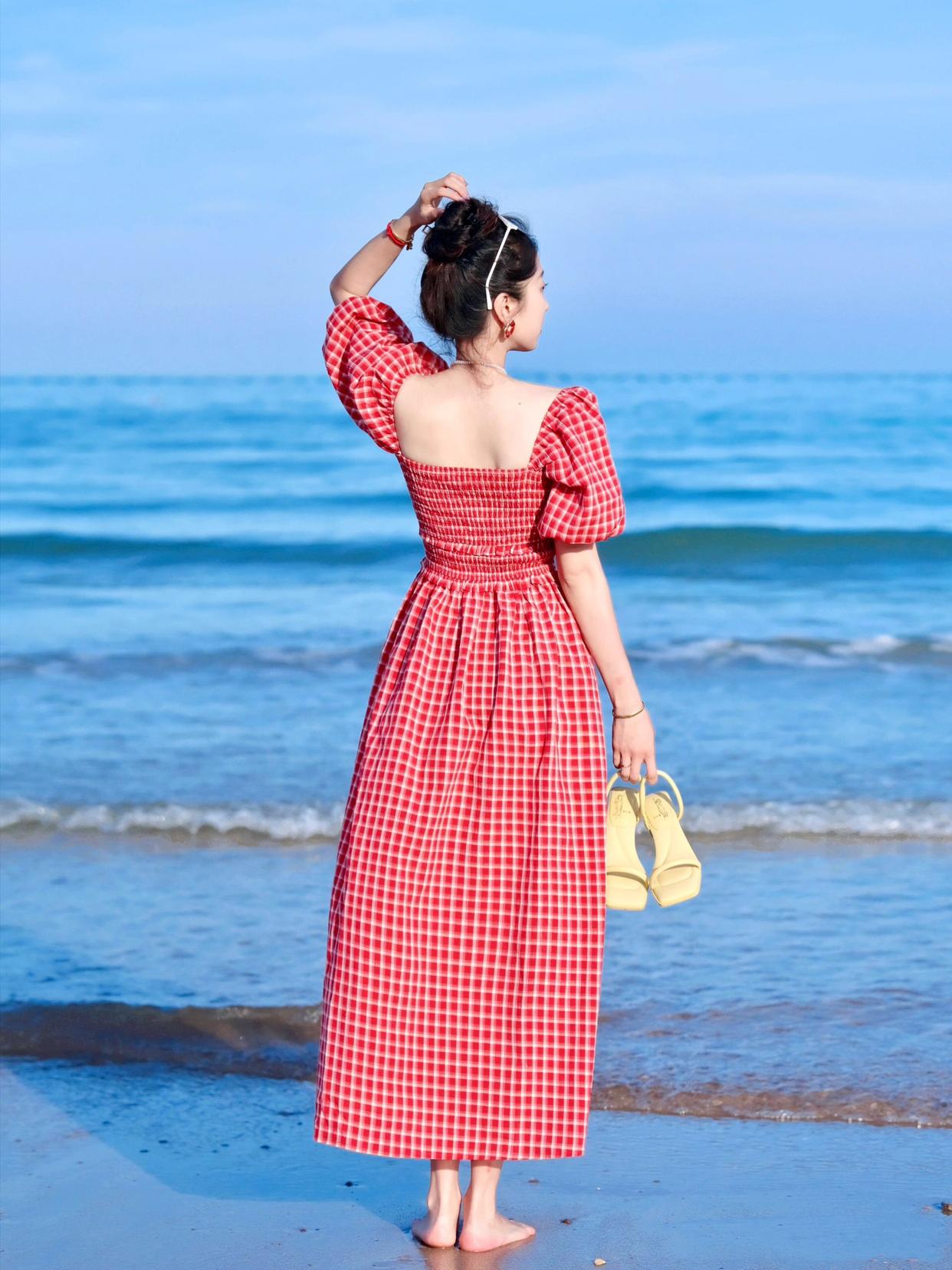 在一些极简或者好看的背景下,简单的背景照也足够惊艳,比如在海边拍裙装人像的时候,背对镜头,采取中心构图的方式,拍照文艺又有神秘感。