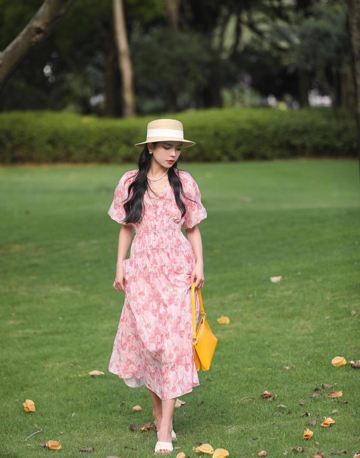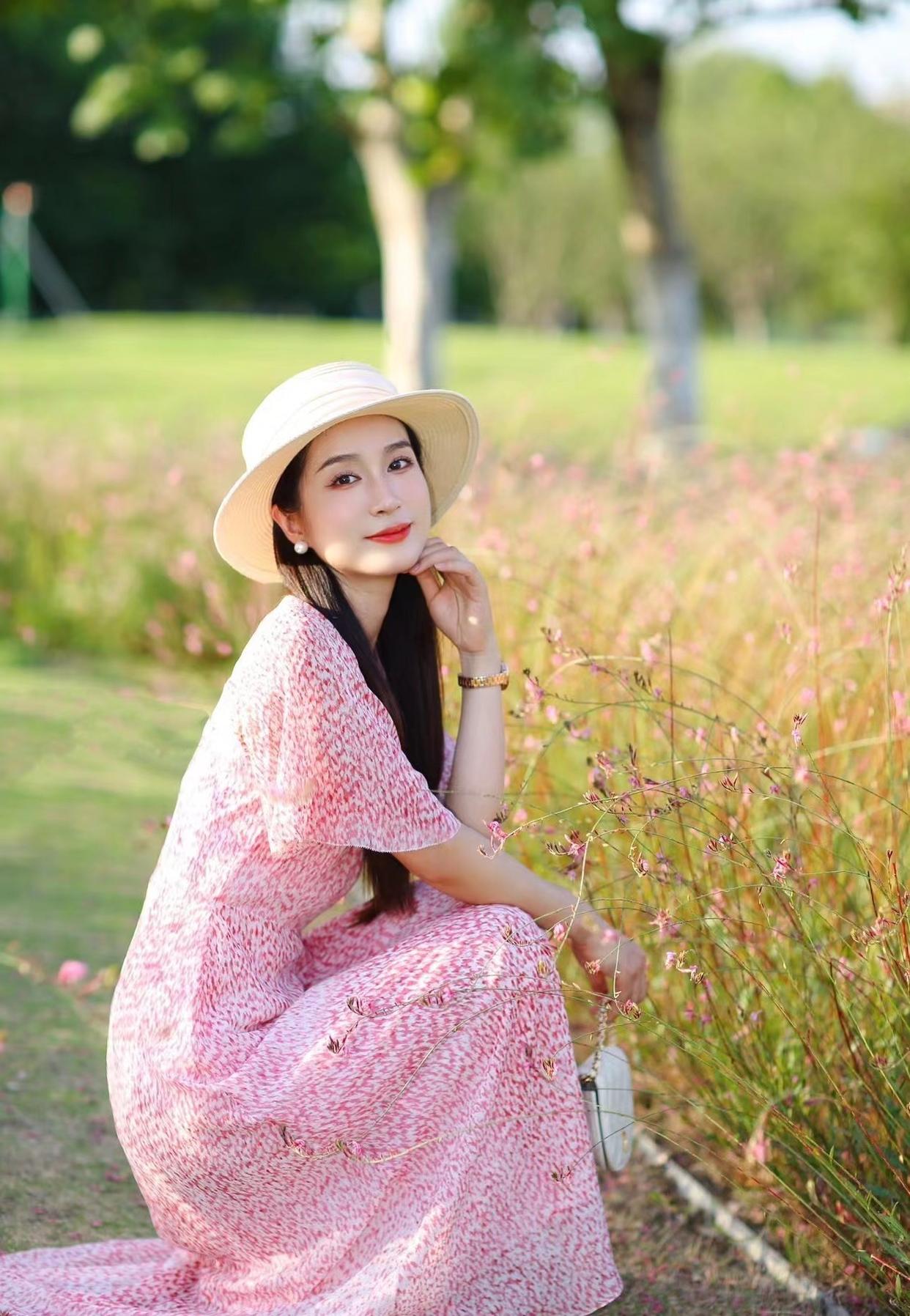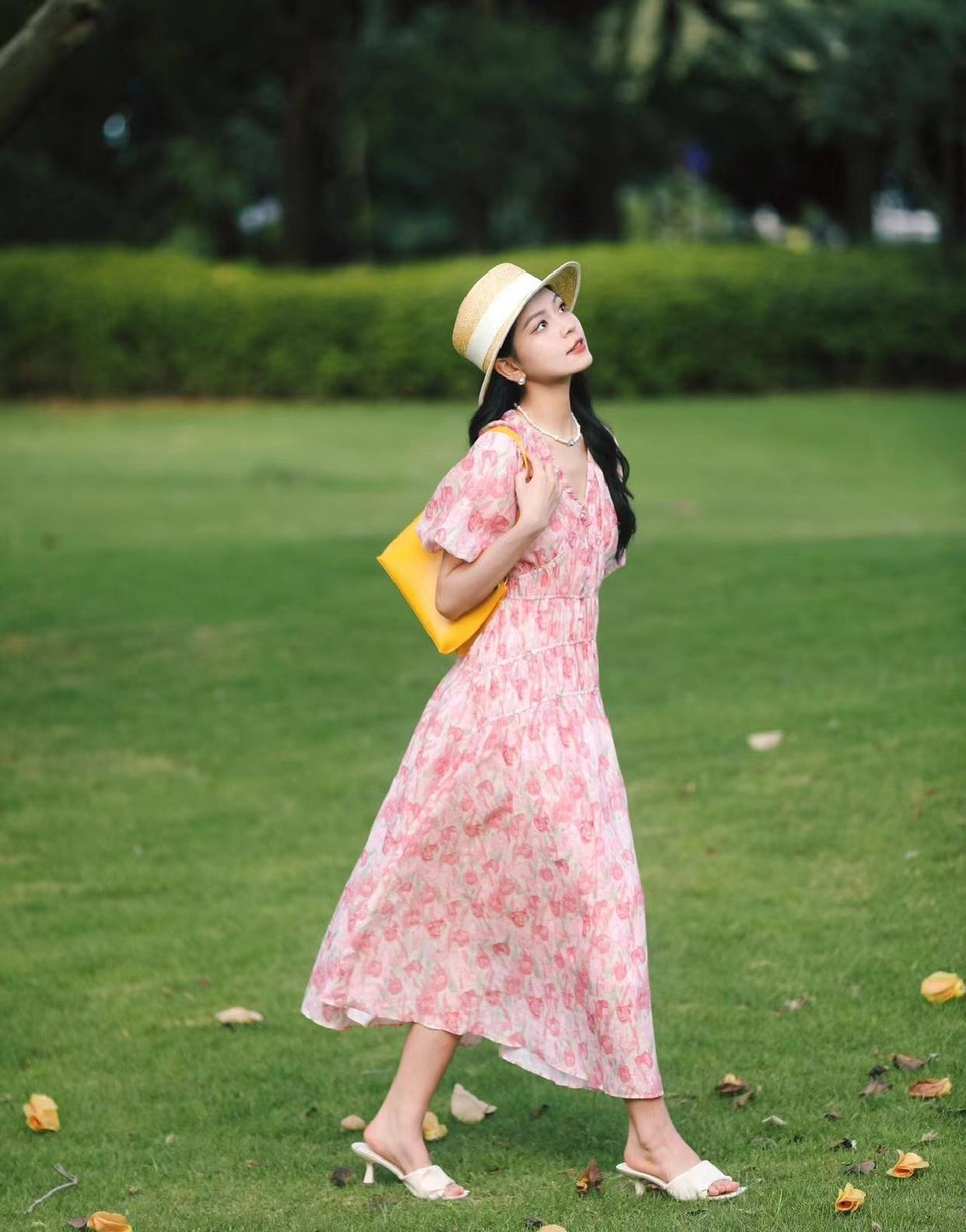 拍显高显瘦的全身照,可以参考下图,模特站在花间小道中间,摄影师低角度仰拍,确保脚底与画面底框贴合,头顶留白三分之一的位置,模特交叉腿站,或者双脚分开,搭配遮阳或撑帽檐的动作即可。