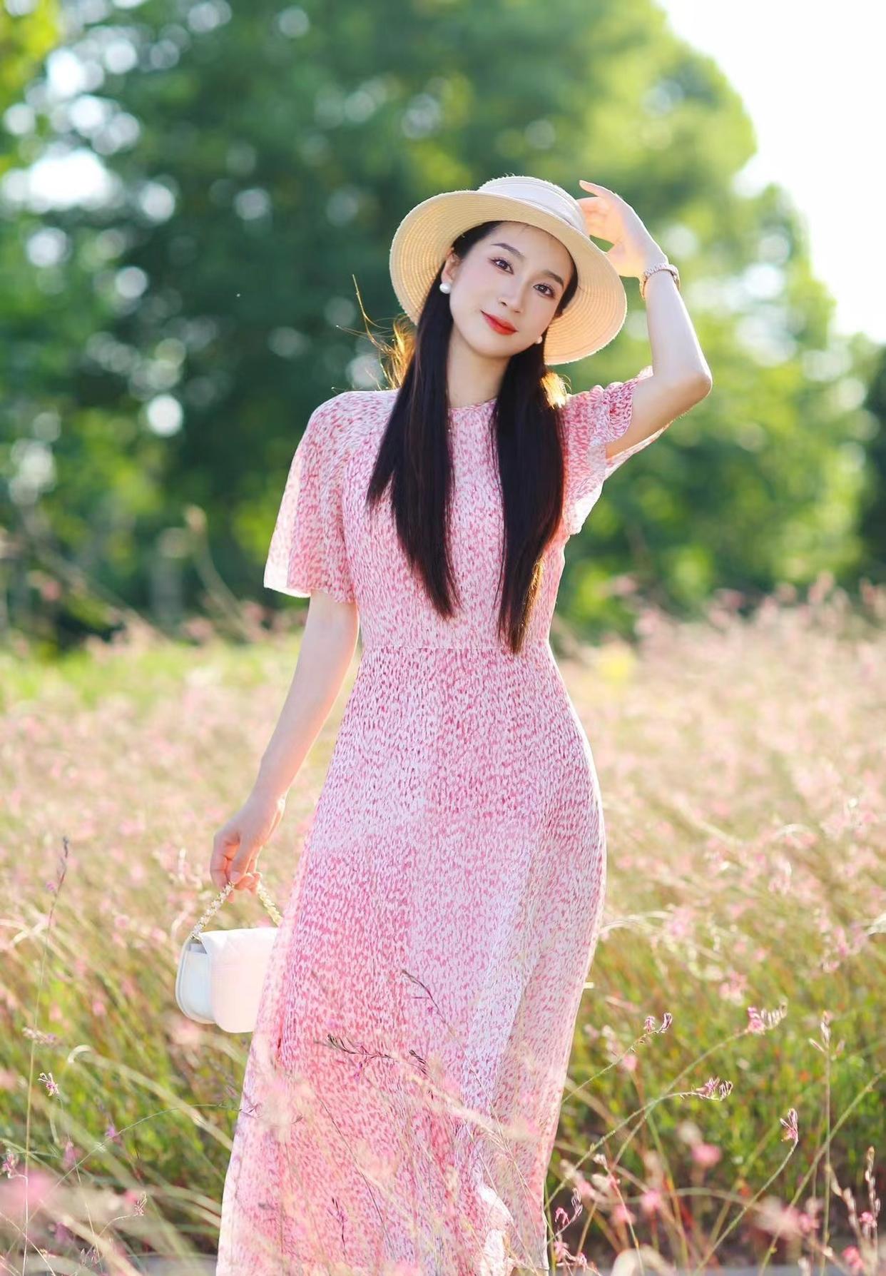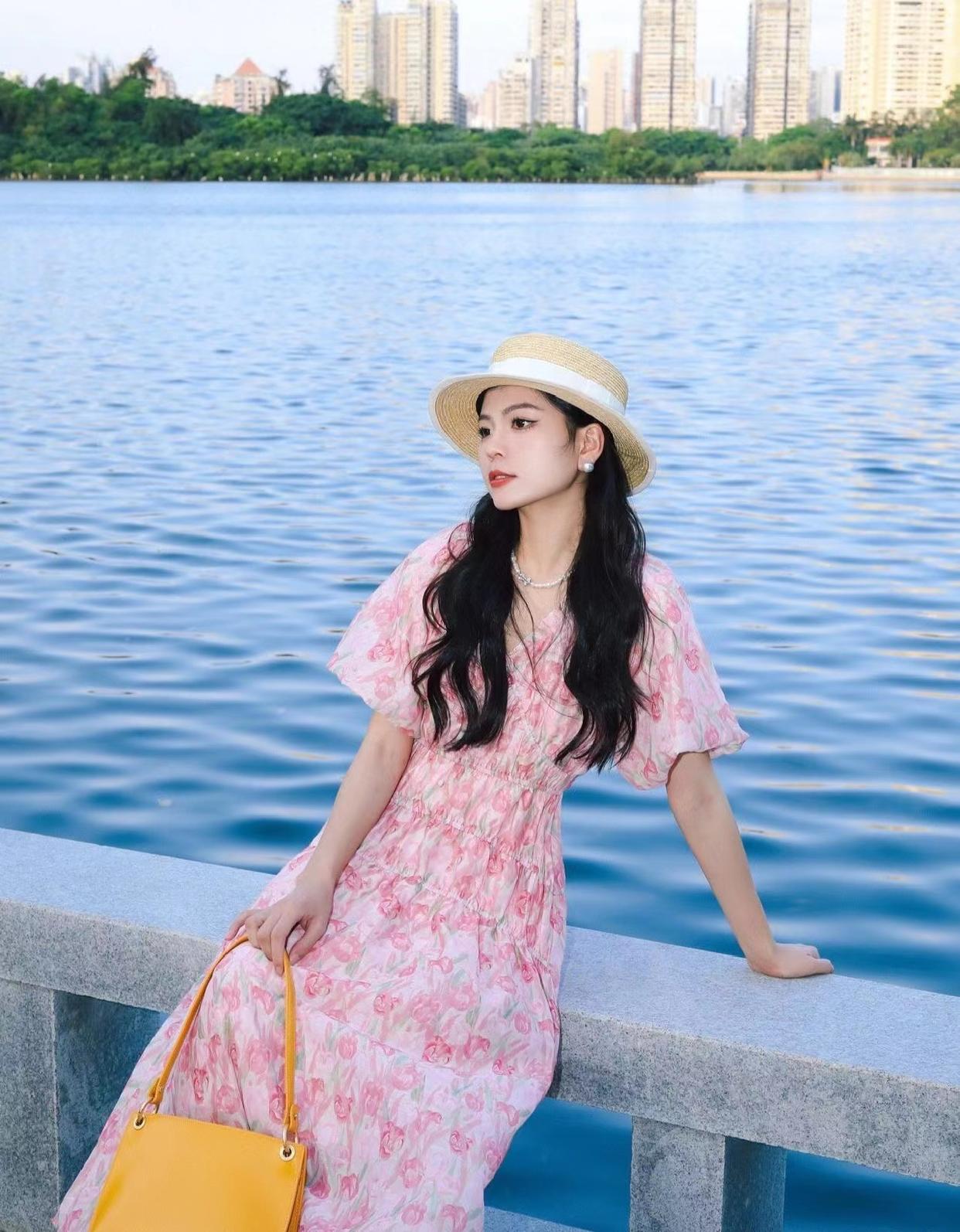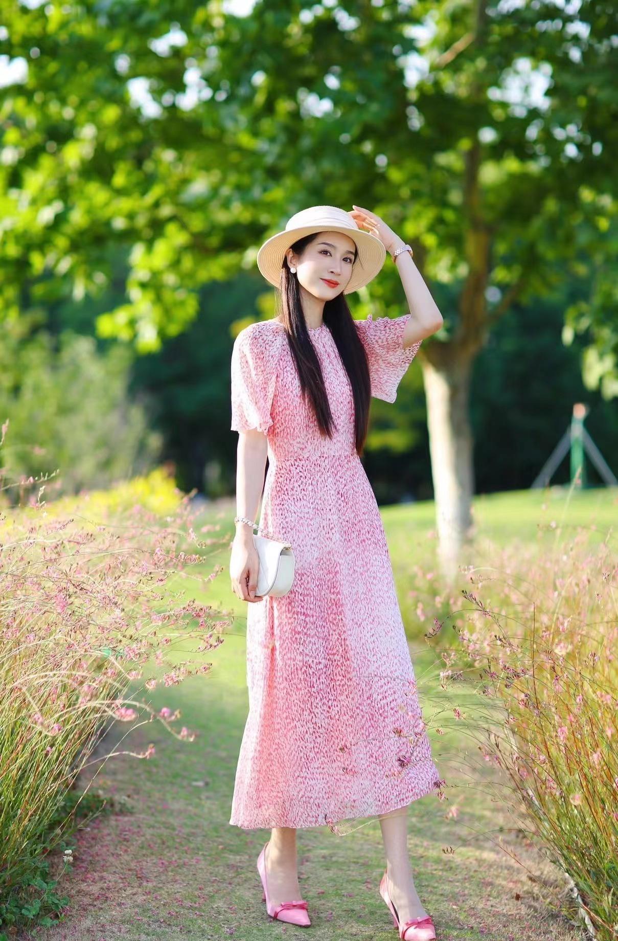 拍显高显瘦的全身照,可以参考下图,模特站在花间小道中间,摄影师低角度仰拍,确保脚底与画面底框贴合,头顶留白三分之一的位置,模特交叉腿站,或者双脚分开,搭配遮阳或撑帽檐的动作即可。