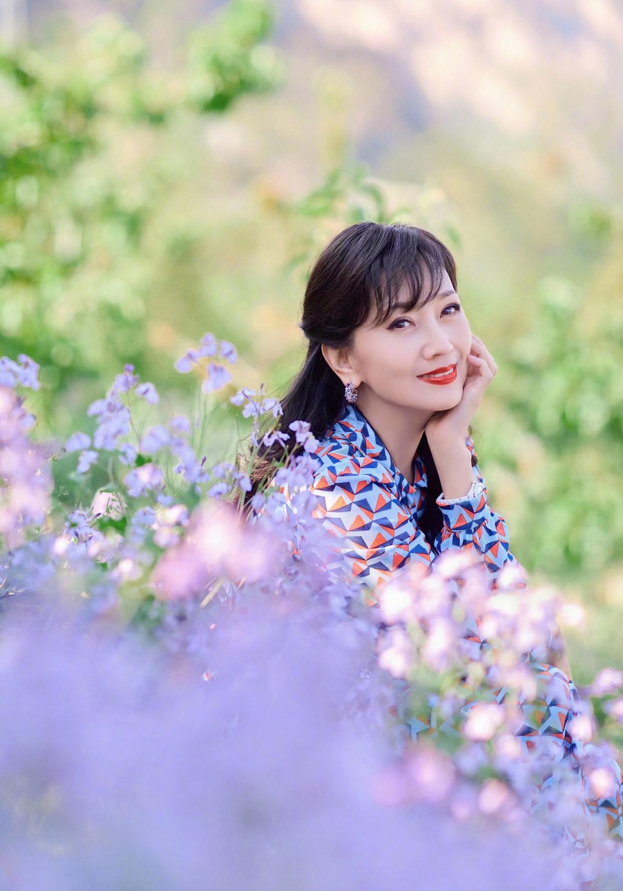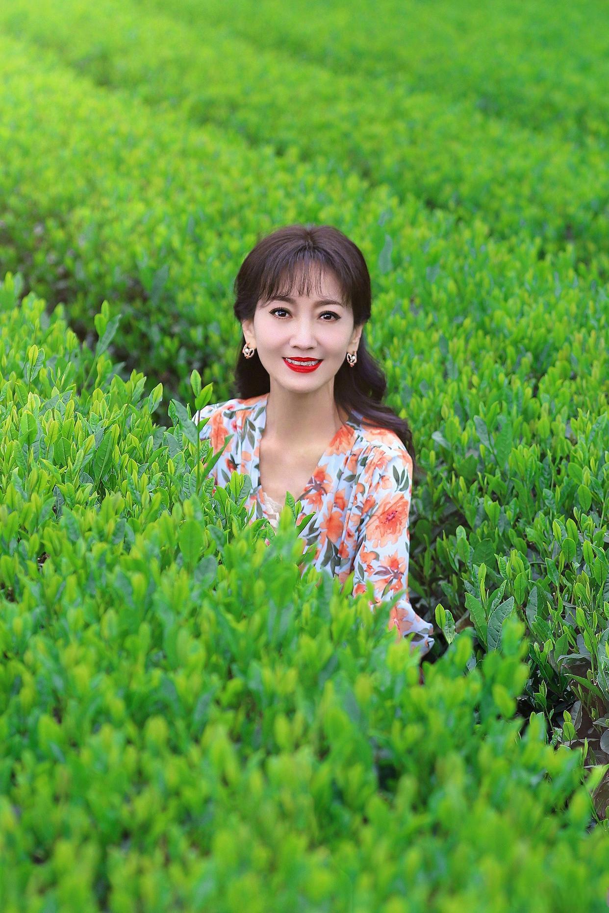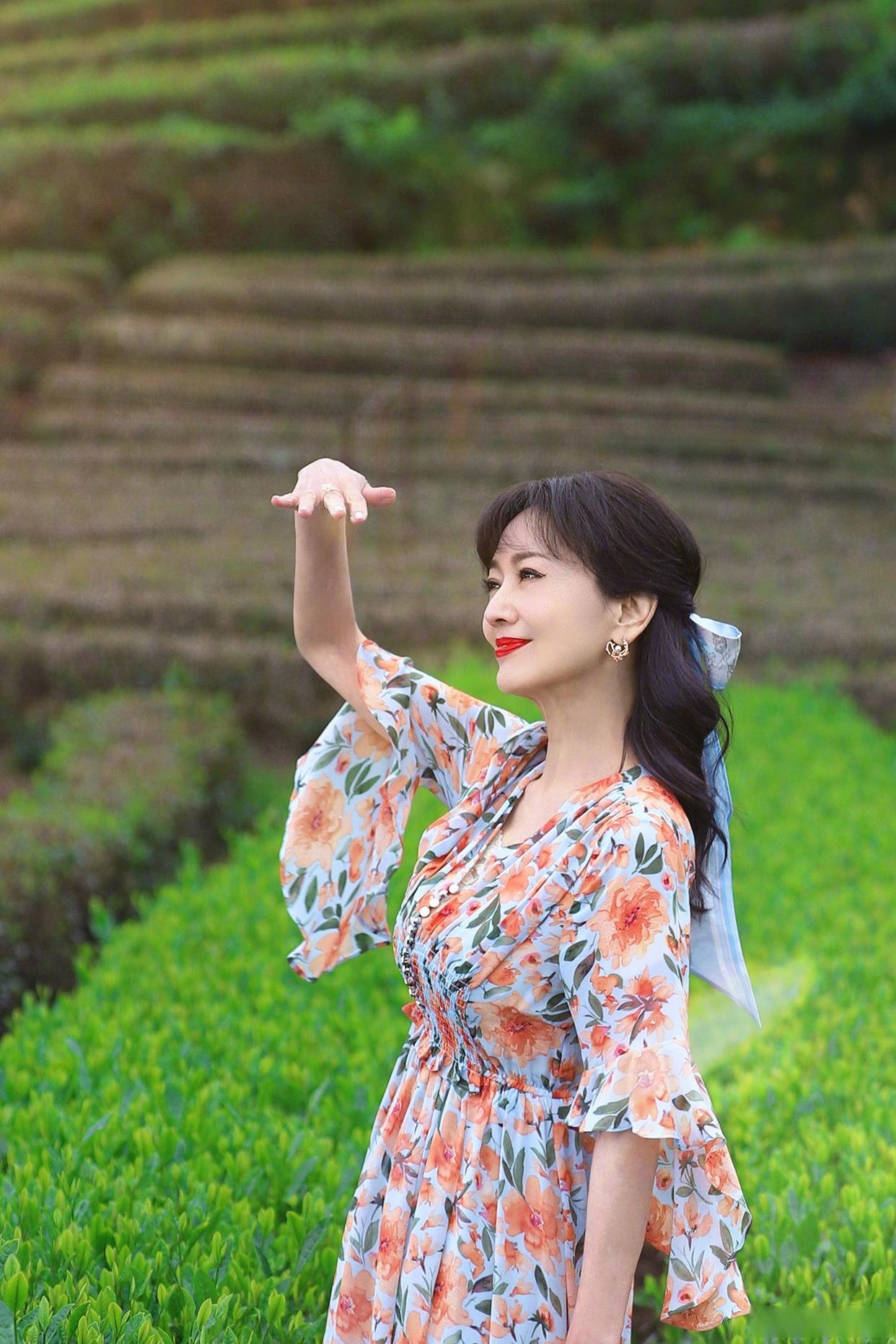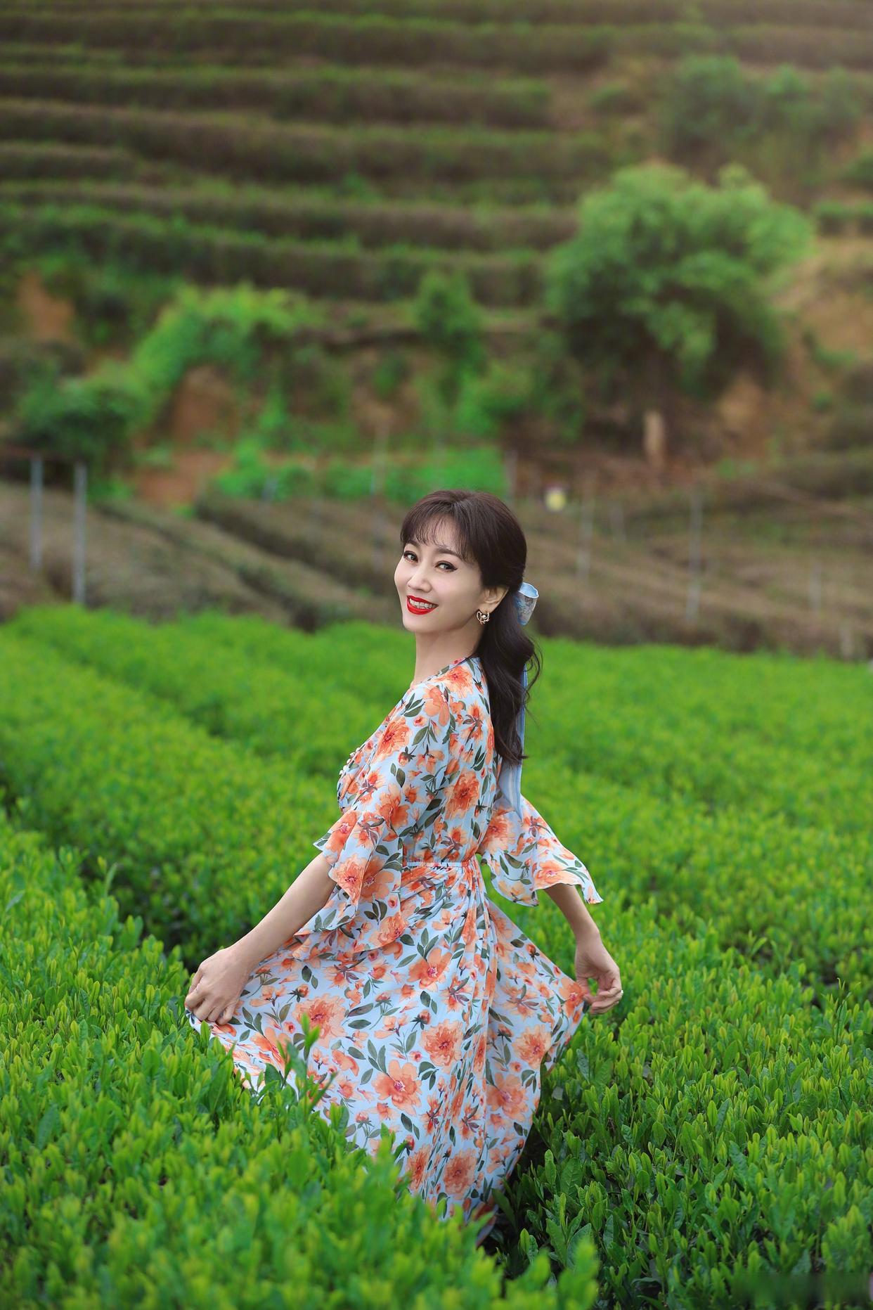 在树林、花海这类大环境中,遇到光线刺眼的时候,可以自然地抬起手来挡阳光,姿势自然而又大方。