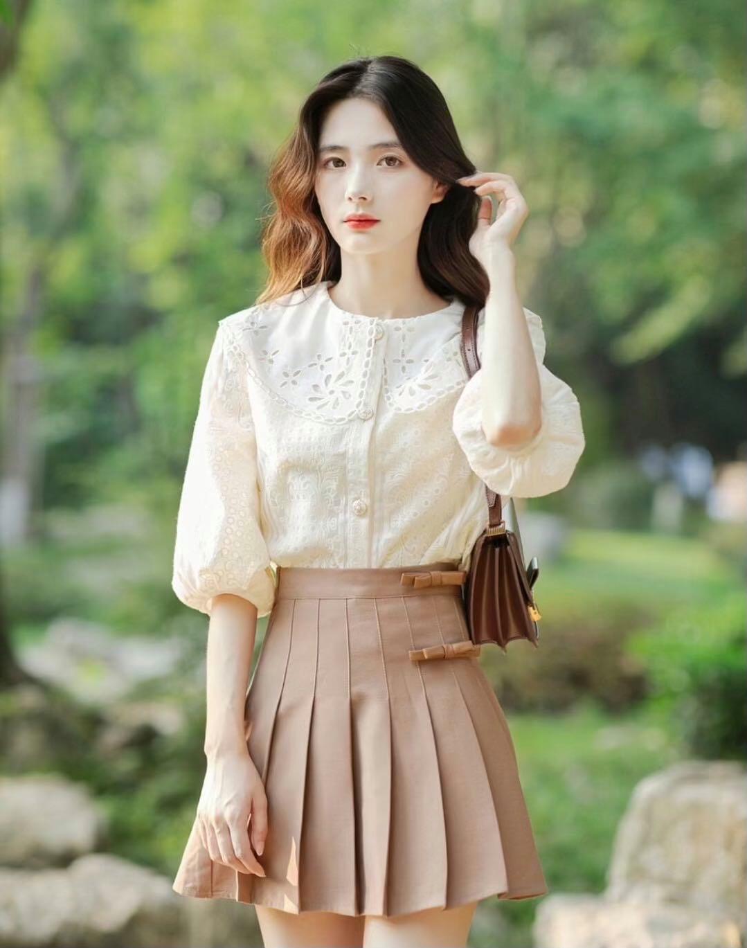 他拍的时候,最方便拍出大长腿的方法便是低角度加大广角,这样拍摄,不仅能拉长身材比例,显高显瘦显腿长,还能起到简洁画面的效果,拍出清新漂亮的照片。