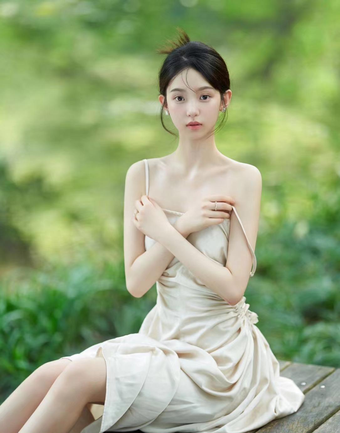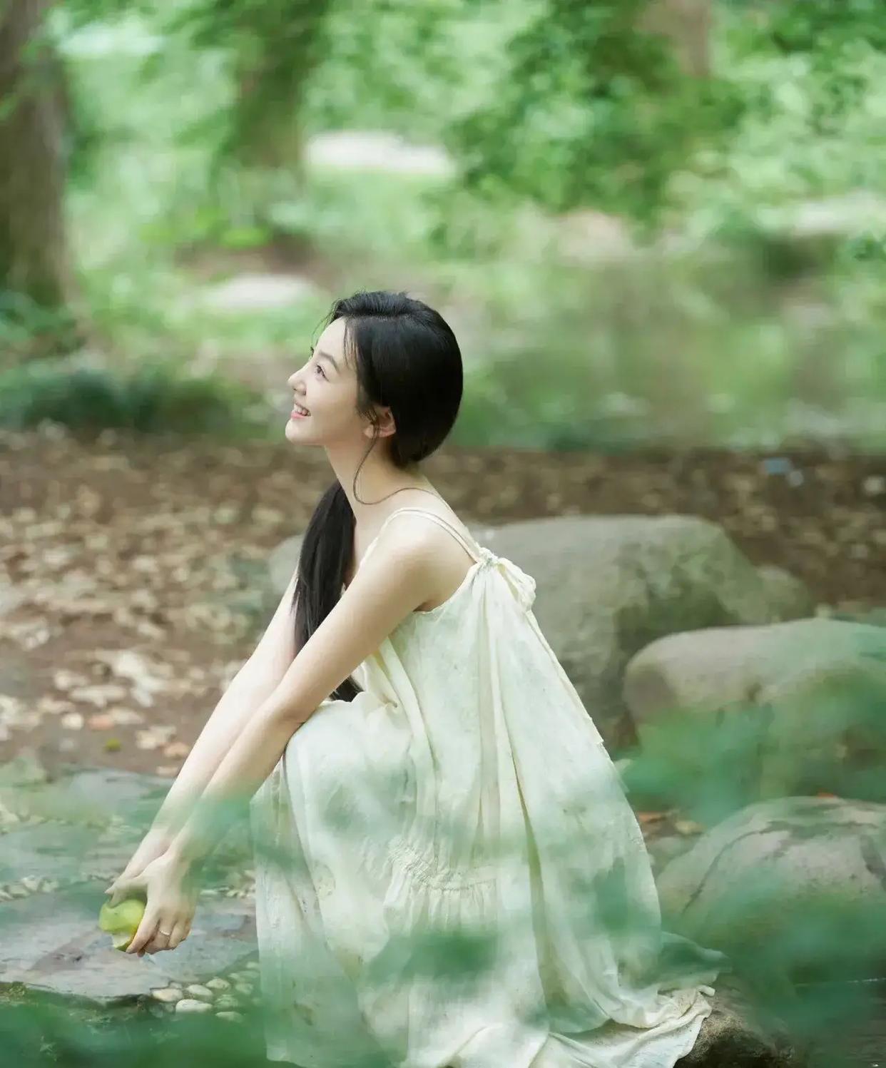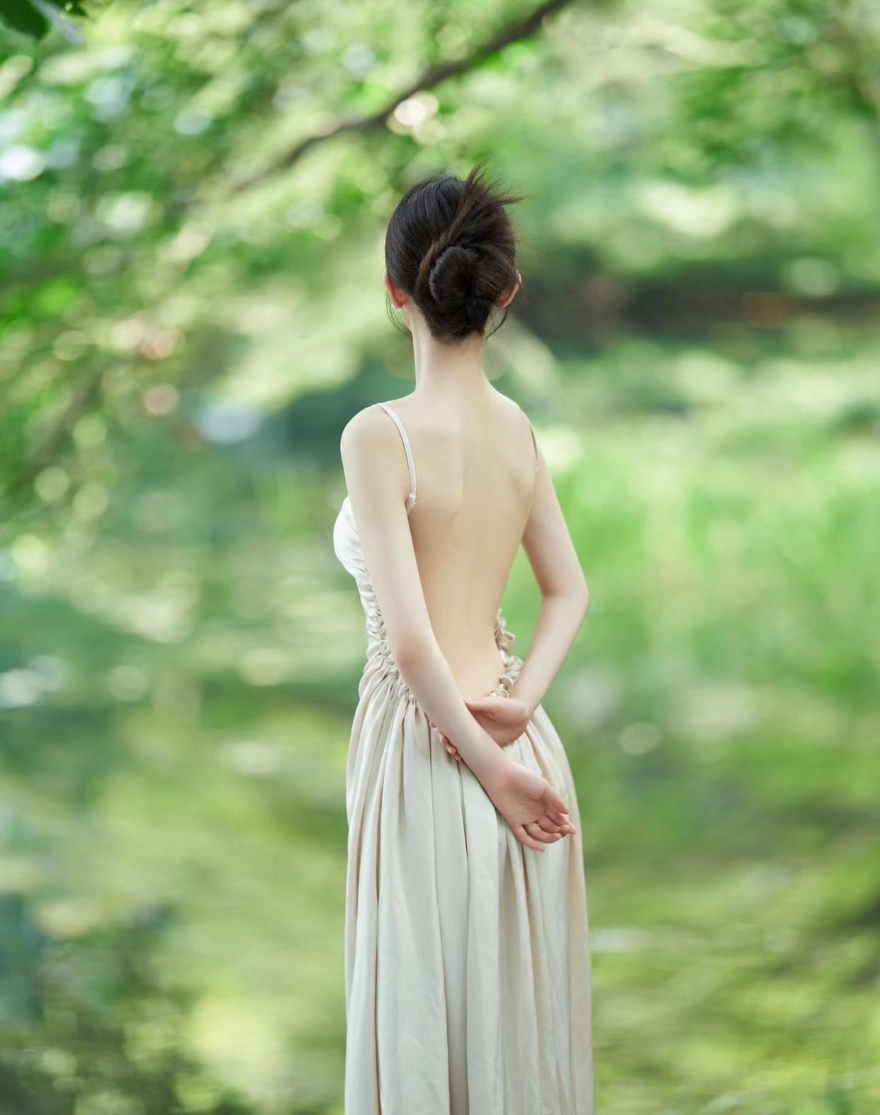 参考下图,将背景的树林虚化成绿色的虚团,一个简单的侧背影也能拍出很仙很迷人的画面。