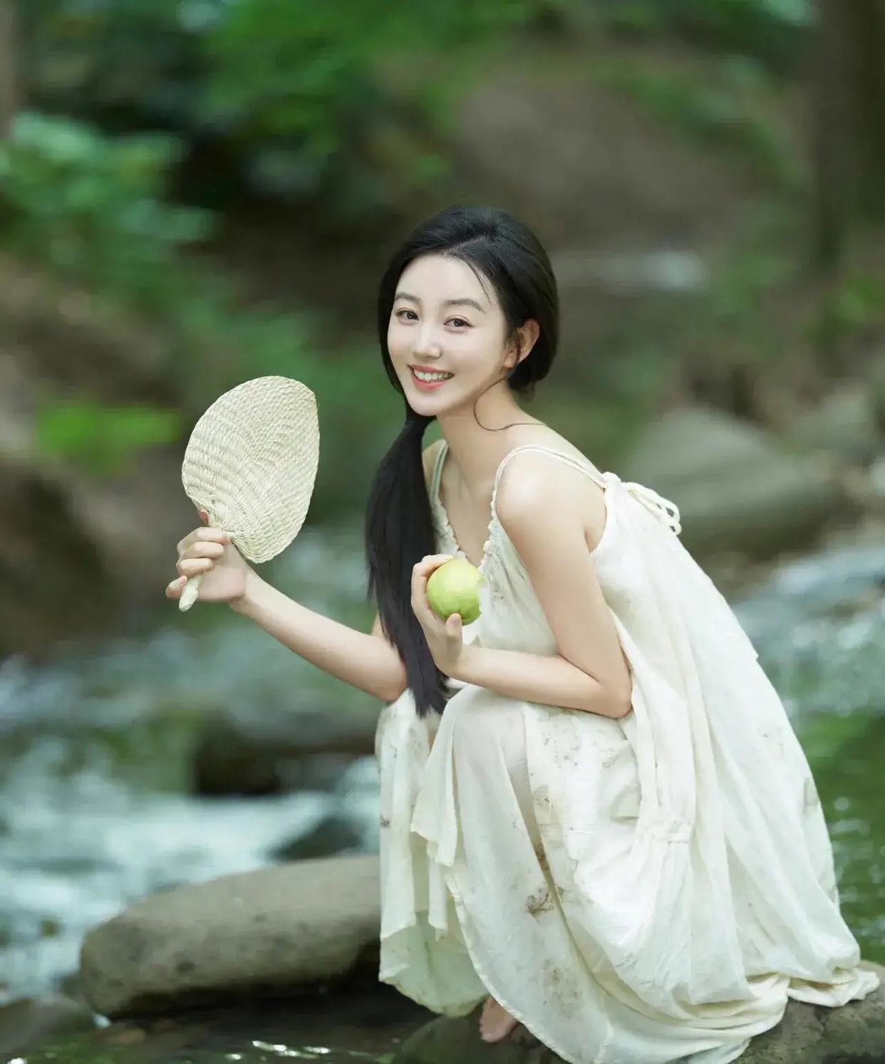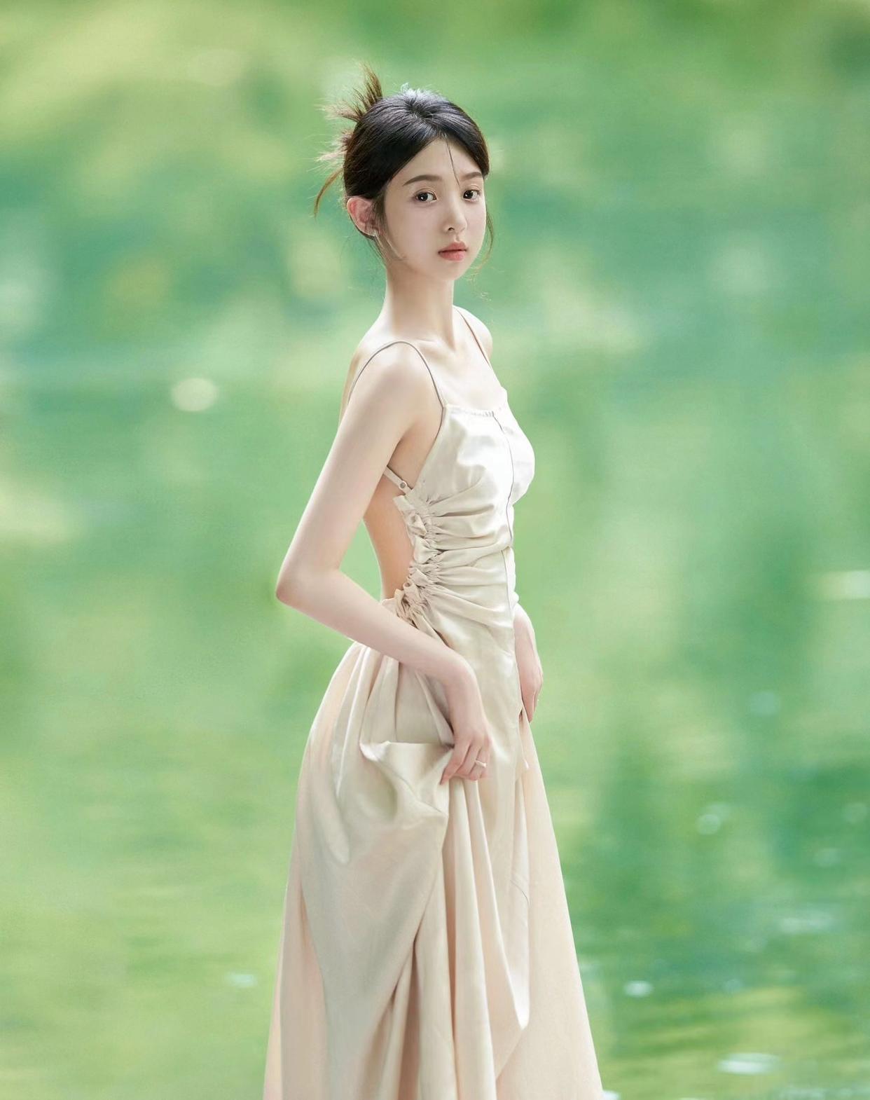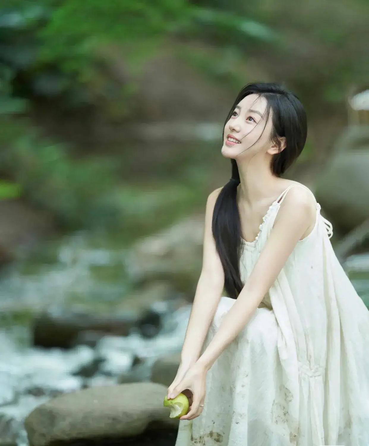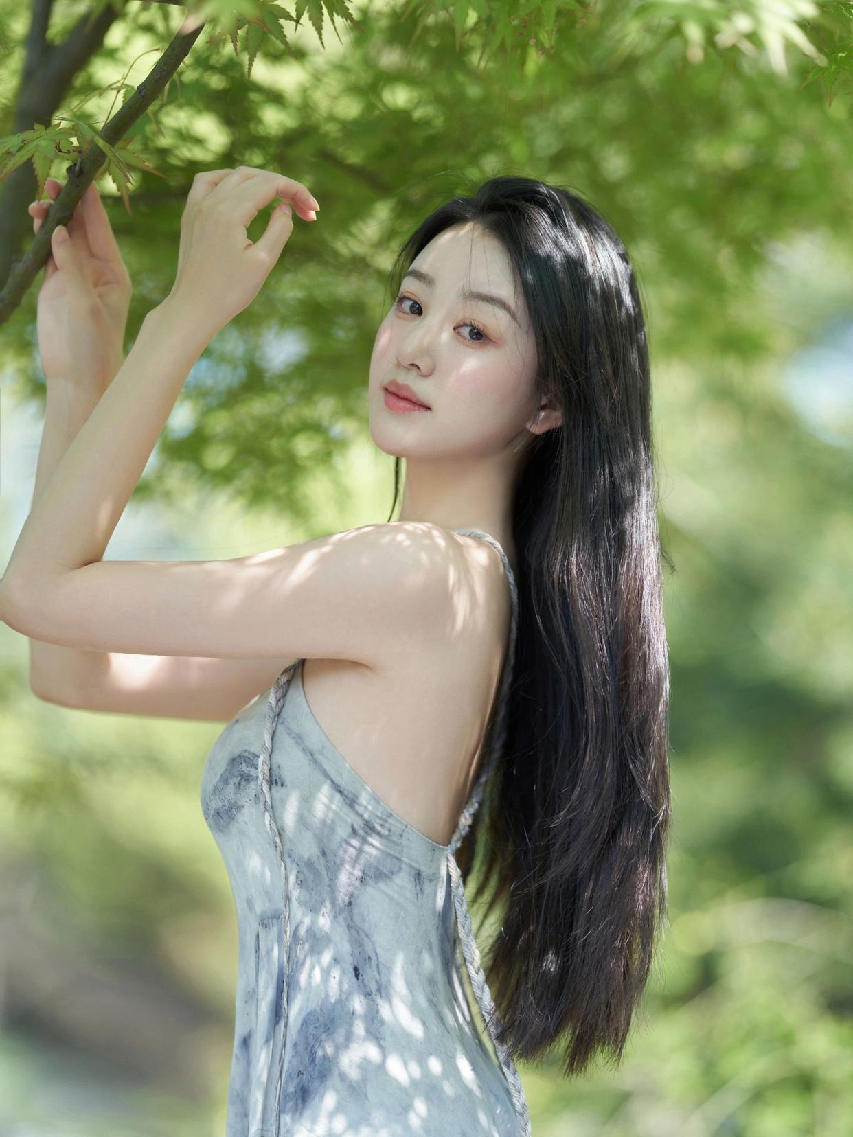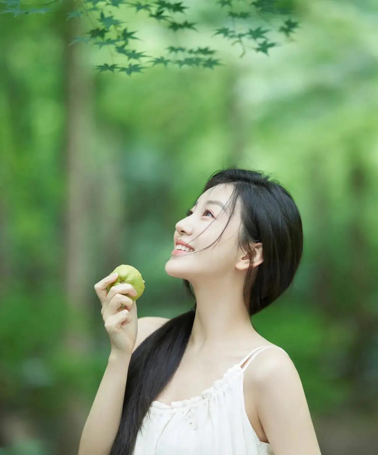 只拍半身的情况,角度的选择尤为重要,以上方的树叶为视觉指引,让人物侧身抬头往上看,搭配一个治愈的笑容,不仅显瘦、突出五官轮廓,也能拍出清冷的感觉,很漂亮。