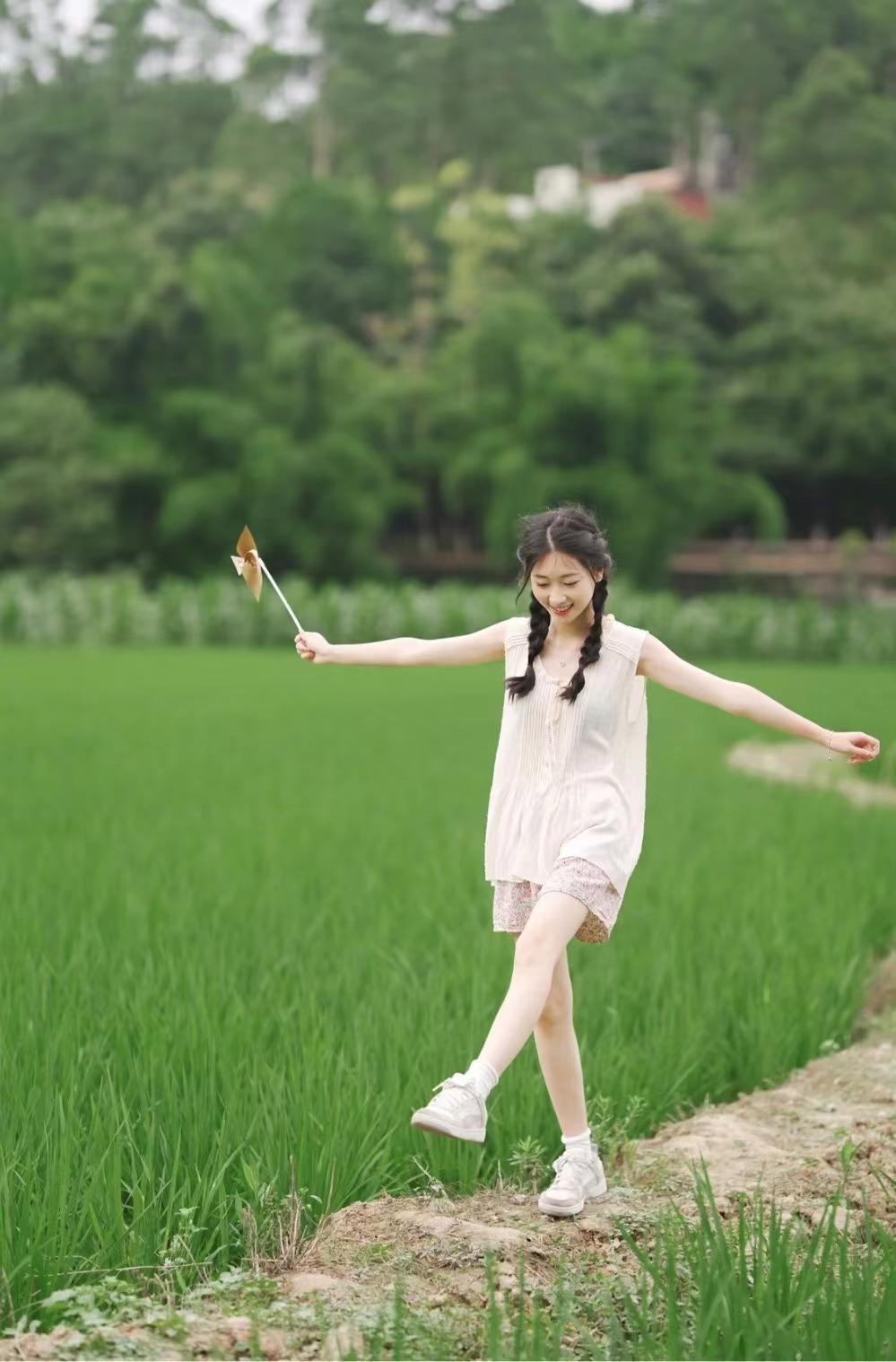 张开手拍,或在田间自由自在地走起来,让走动的动作带动四肢摆动起来,显瘦的同时也能拍出活泼快乐的既视感。