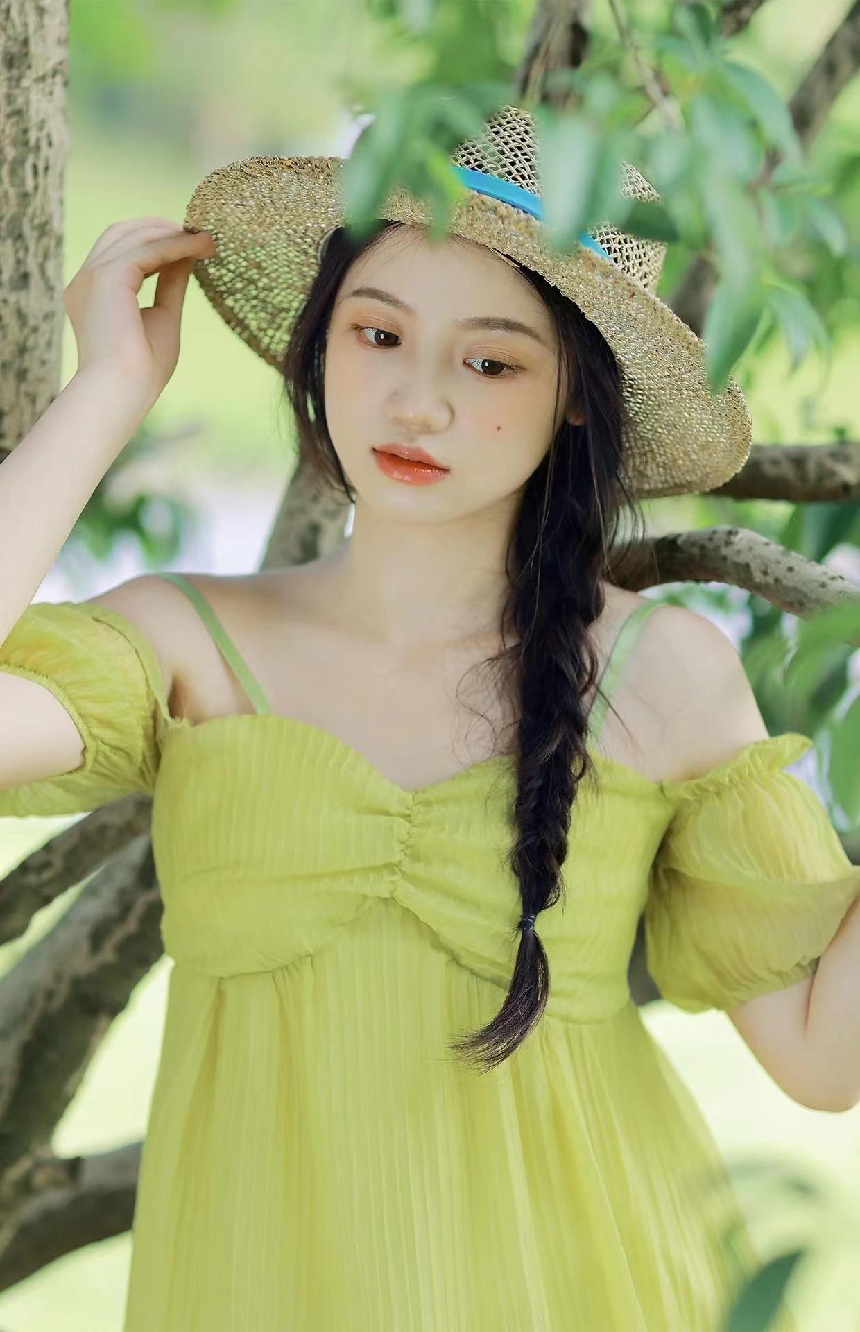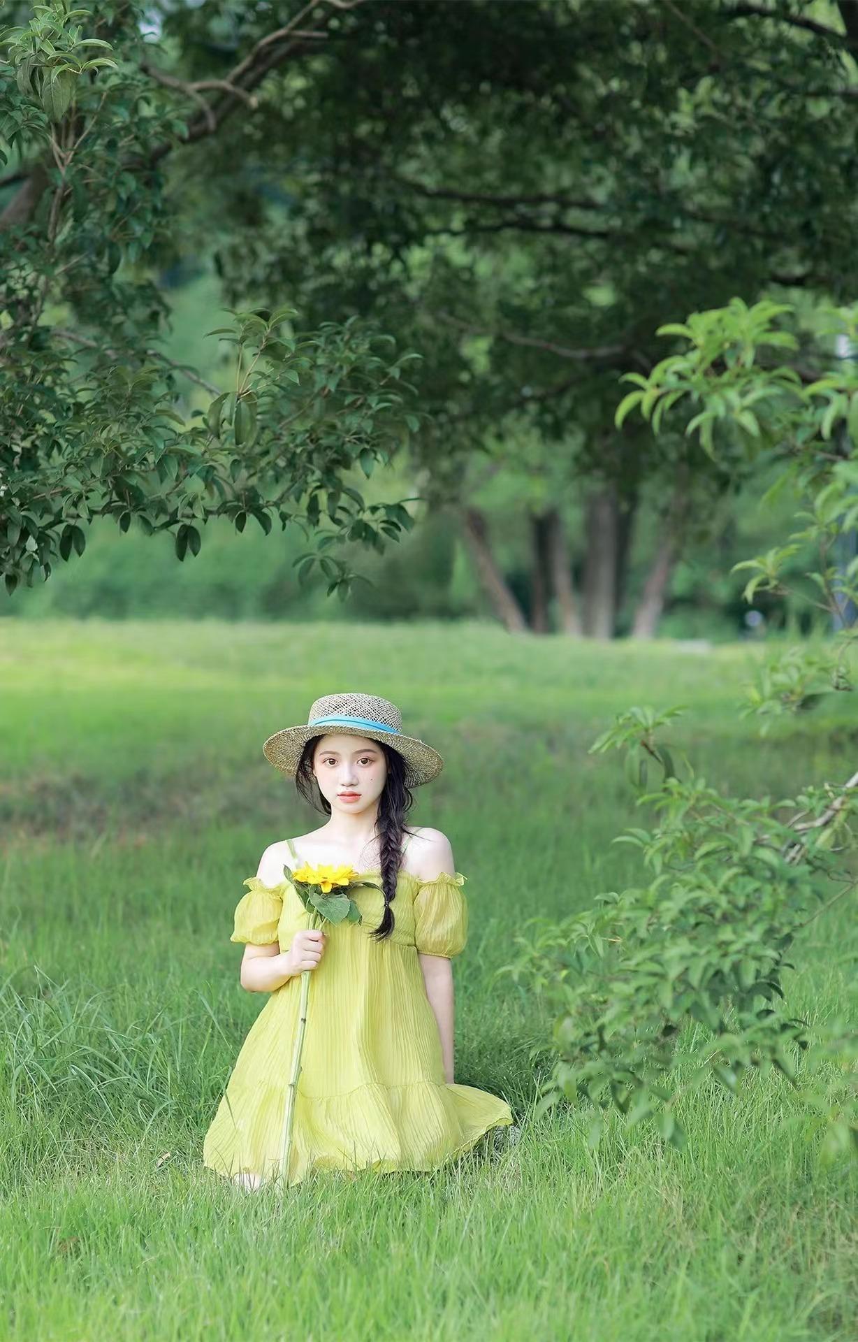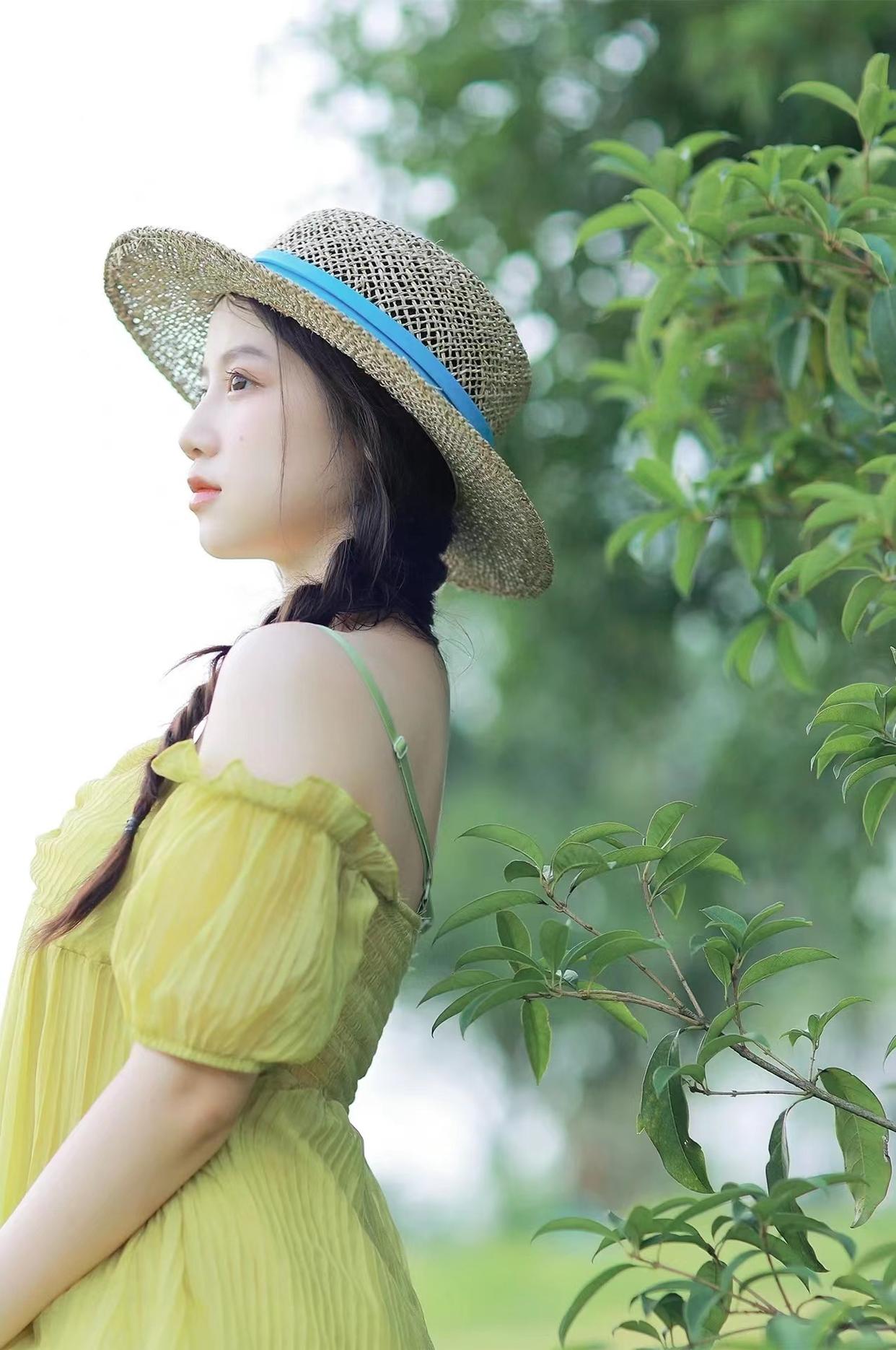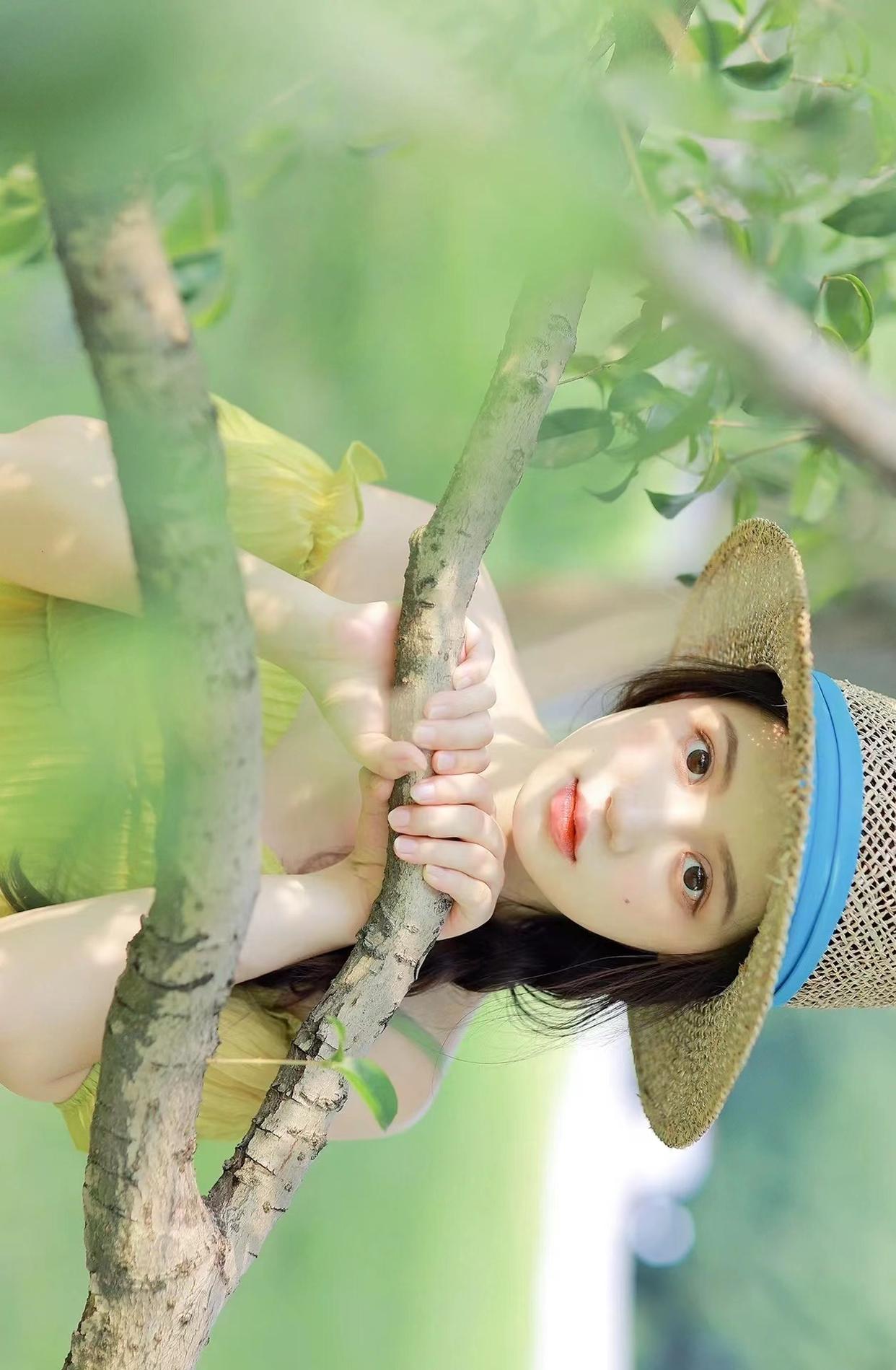 树林拍照,帽子是必备的道具之一,拍正面中景照的时候,可以用帽子遮住腹部位置,避免拍到小肚腩的同时较大的帽子也能和模特的脸形成一大一小的视觉对比,轻松显脸小。