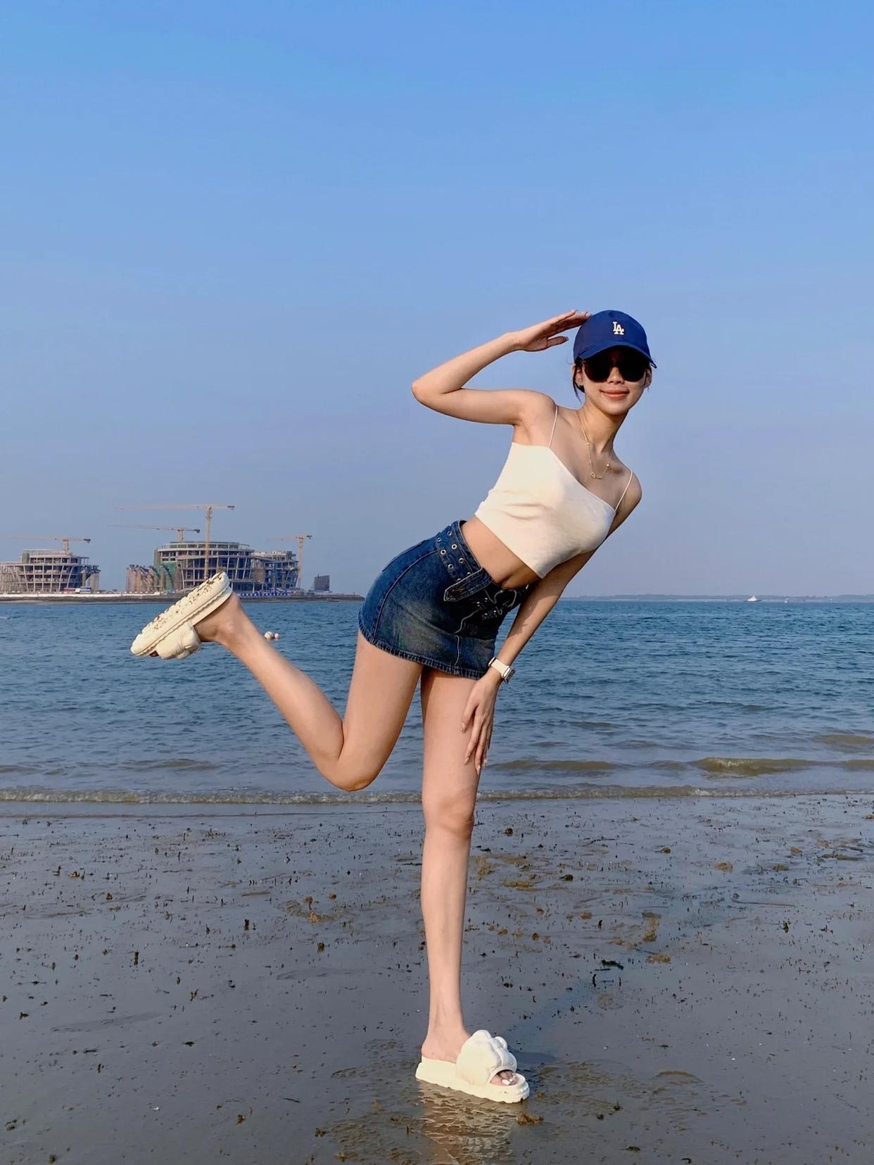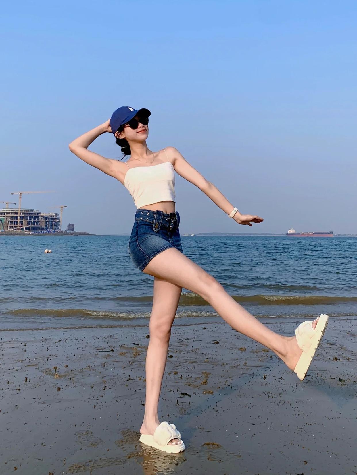 夏天拍全身照的时候不要拘束,大大方方地展示自己的身材,例如张开四肢,做一些大幅度的动作,这时四肢躯干远离了身体,视觉上自然会显瘦不少。