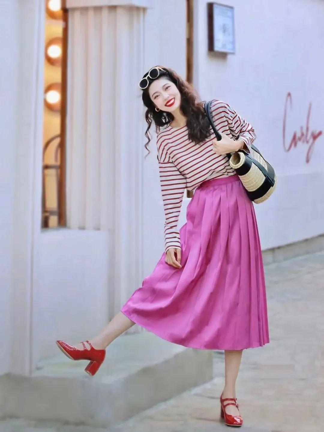 如果你是穿着长裙拍照,踢裙摆的动作不要错过,以一脚为重心站立不动,一脚向外提裙摆,双腿跟着踢腿的动作弯曲,这种动态的全身照显得照片更加生动、活泼。