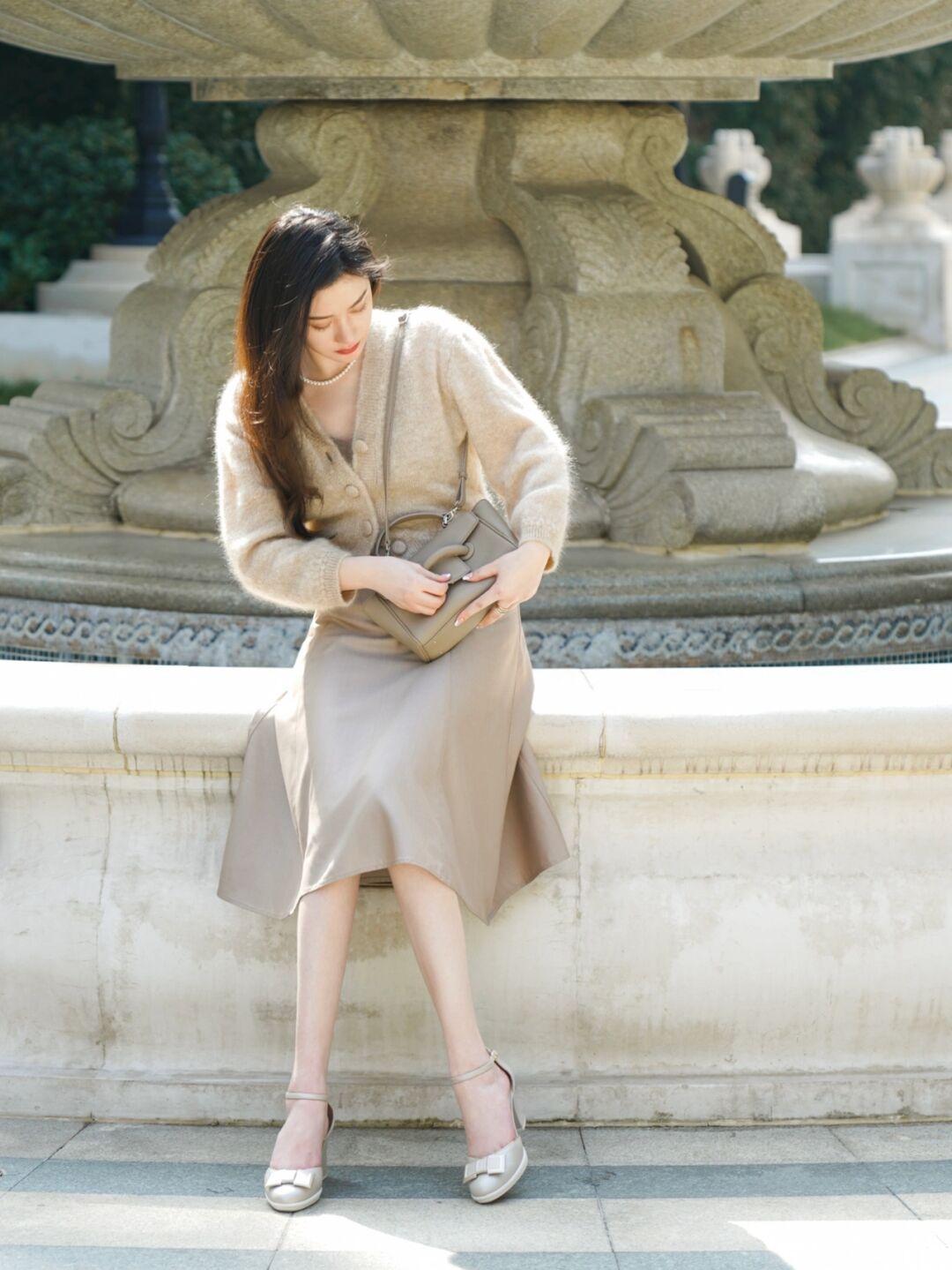 抓拍的方式是最容易捕捉到人物当下自然的一个状态,不想刻意摆拍的话,可以学下图模特,坐着假装整理服饰,拍出不经意的美。