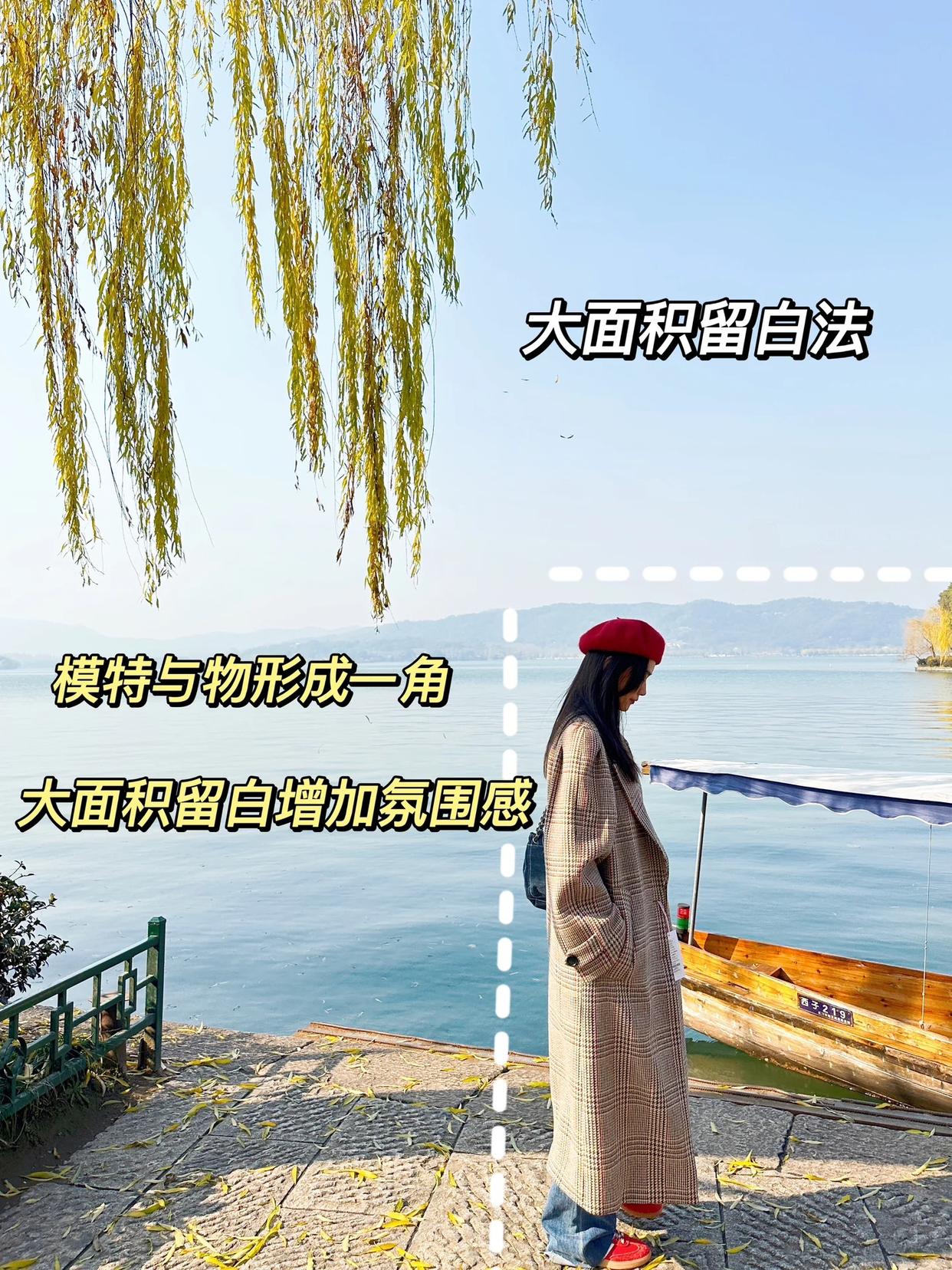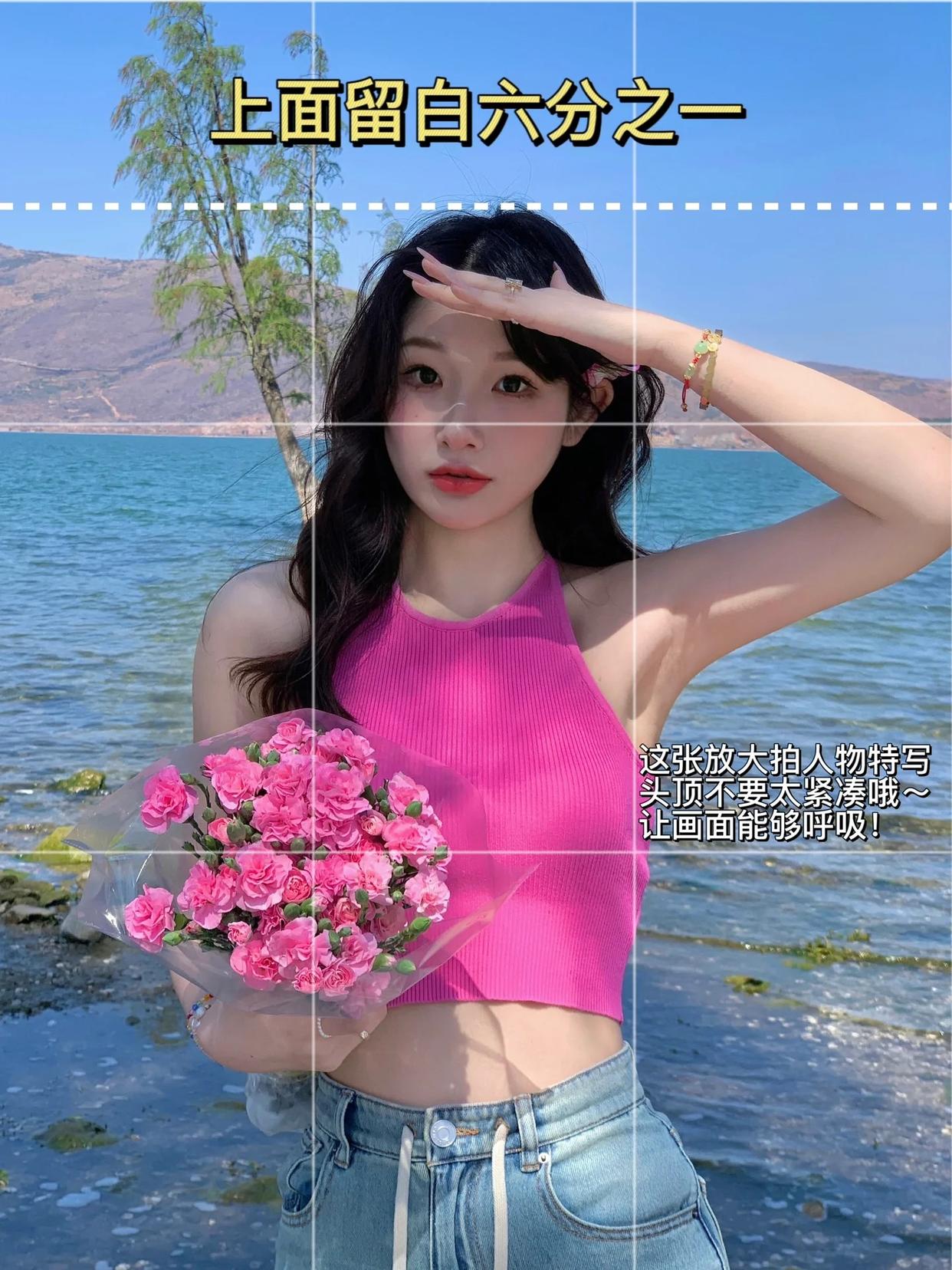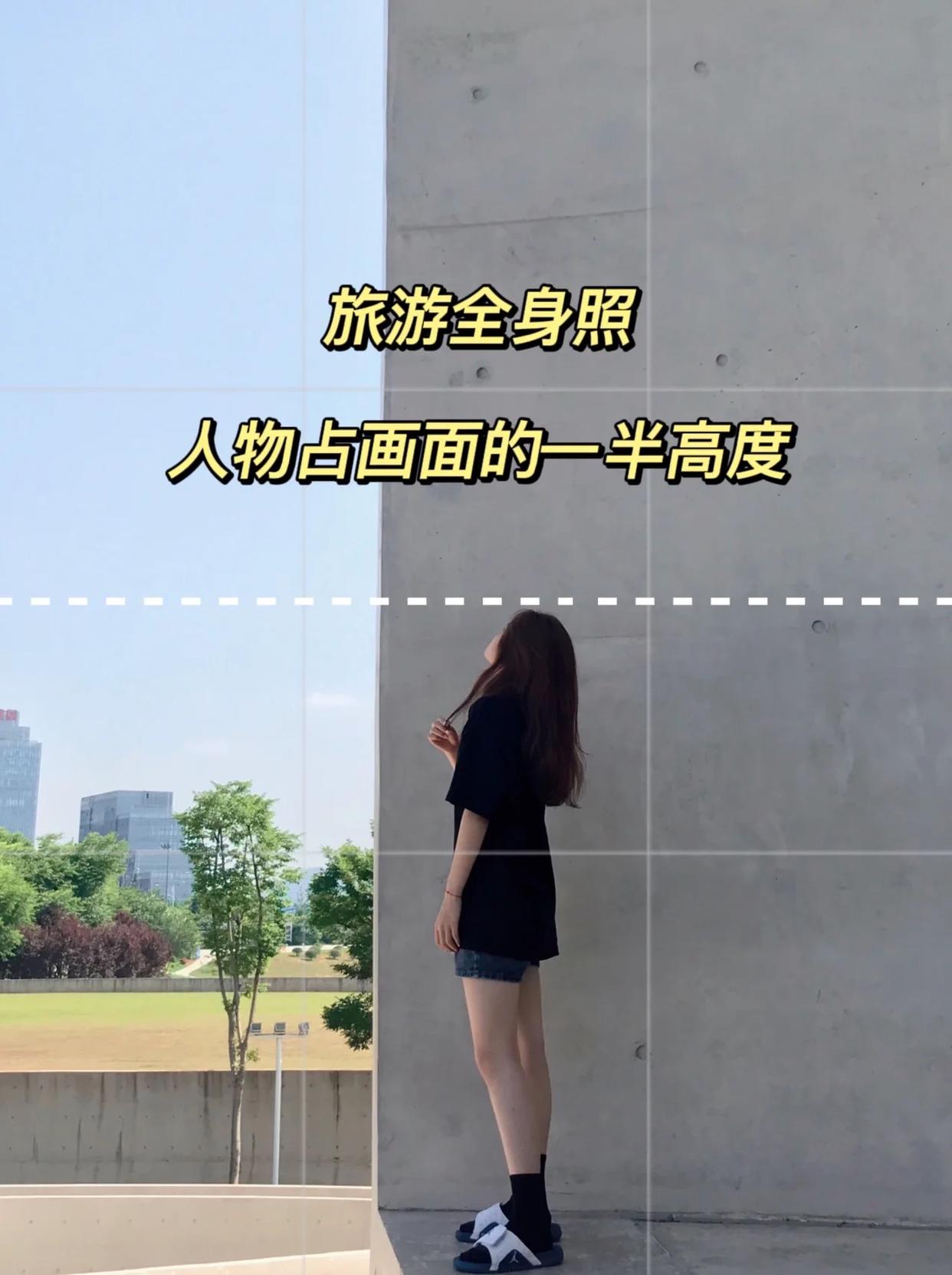 拍又高又瘦的游玩全身美照,不要让人物填满整个画面,适当的留白,建议人物头顶留白三分之一或二分之一的位置,并且,人物的脚要贴底,为了更显瘦,可以从人物的侧面下手,轻松拍出又瘦又高的全身照。