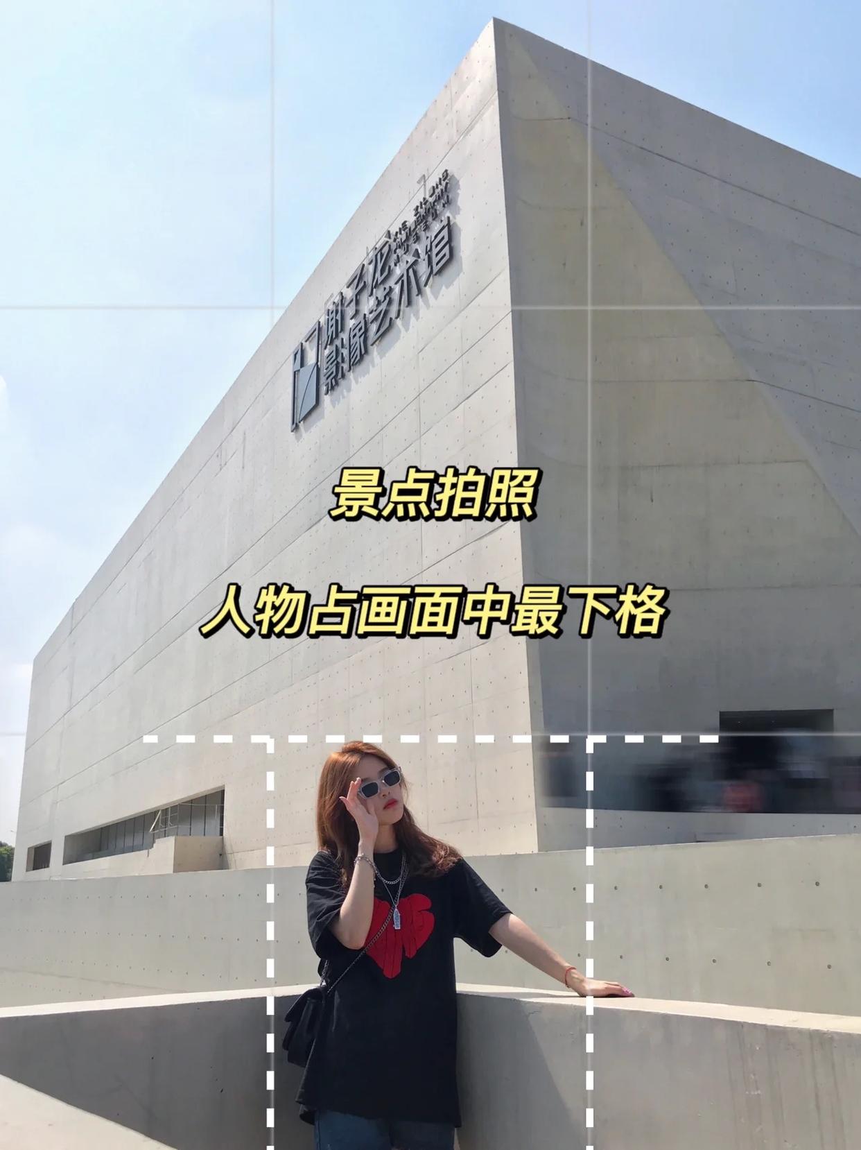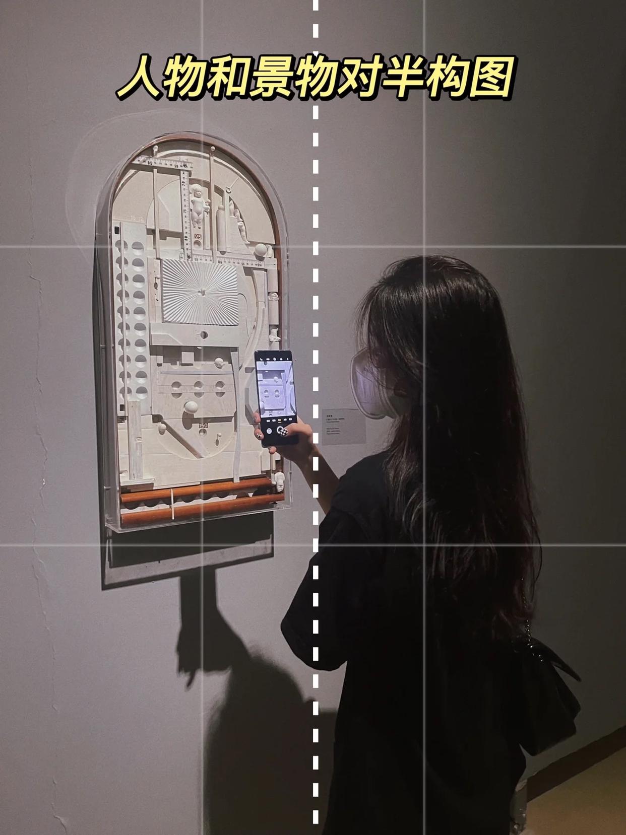 到景点看展的时候,如果人多不好取景,可以拍摄半身近景,注意不要直直拍背面,从模特侧后方拍摄,注意人物和景物对半构图,既能拍出氛围,也能平衡画面的美感。
