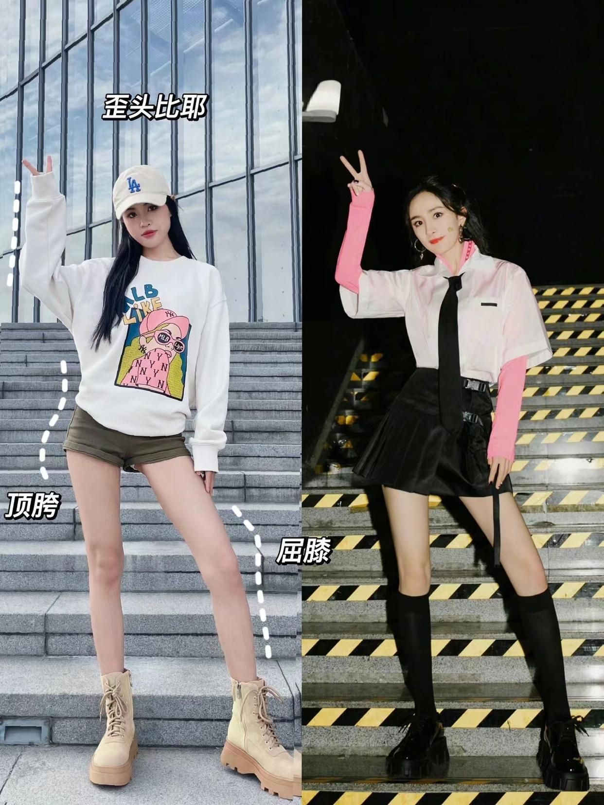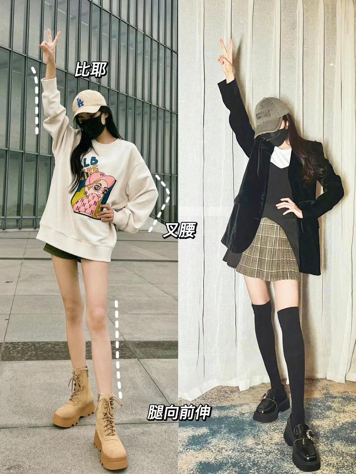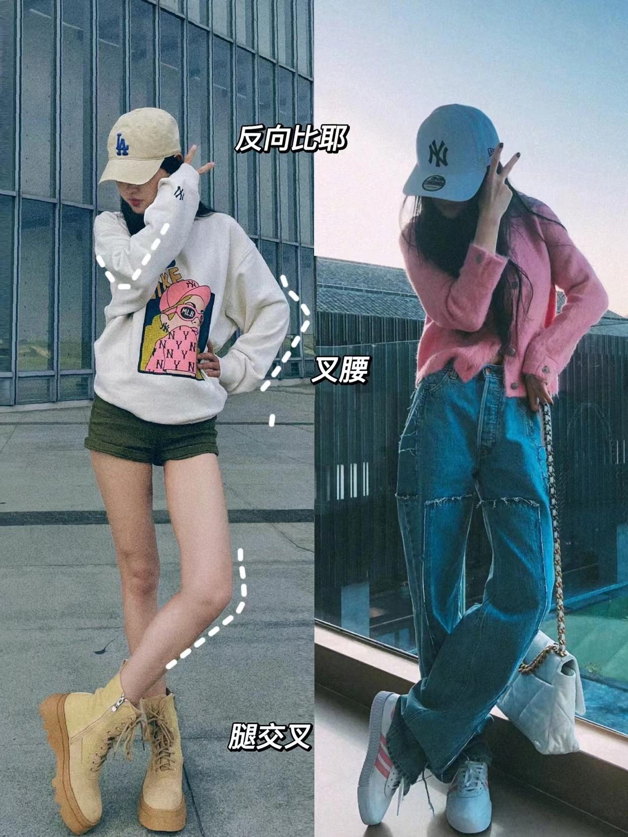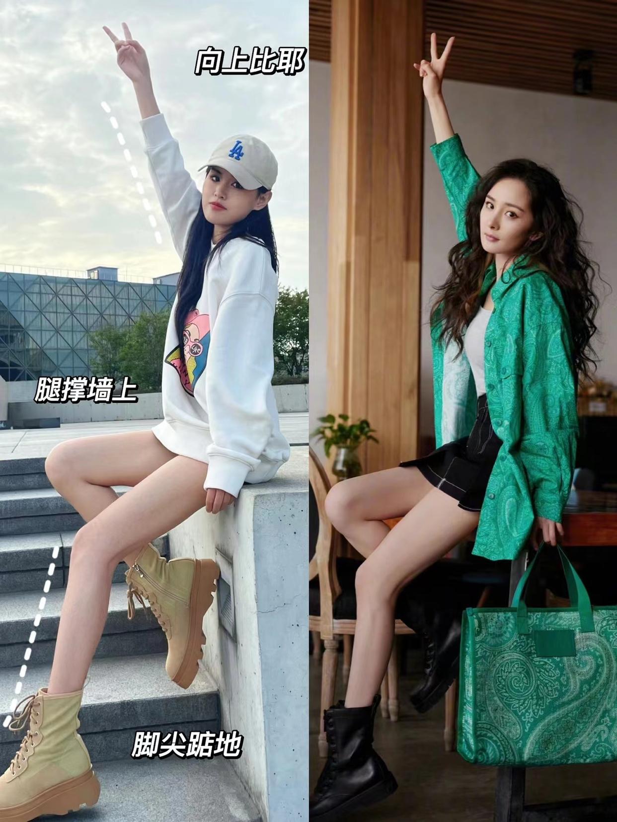从正面拍照的时候,双脚尽量避免保持直直站立,学杨幂一般,稍微顶胯,腿向一侧迈去并屈膝,配合上歪头比耶的动作,显高显瘦显腿长,拍照自然又上镜。