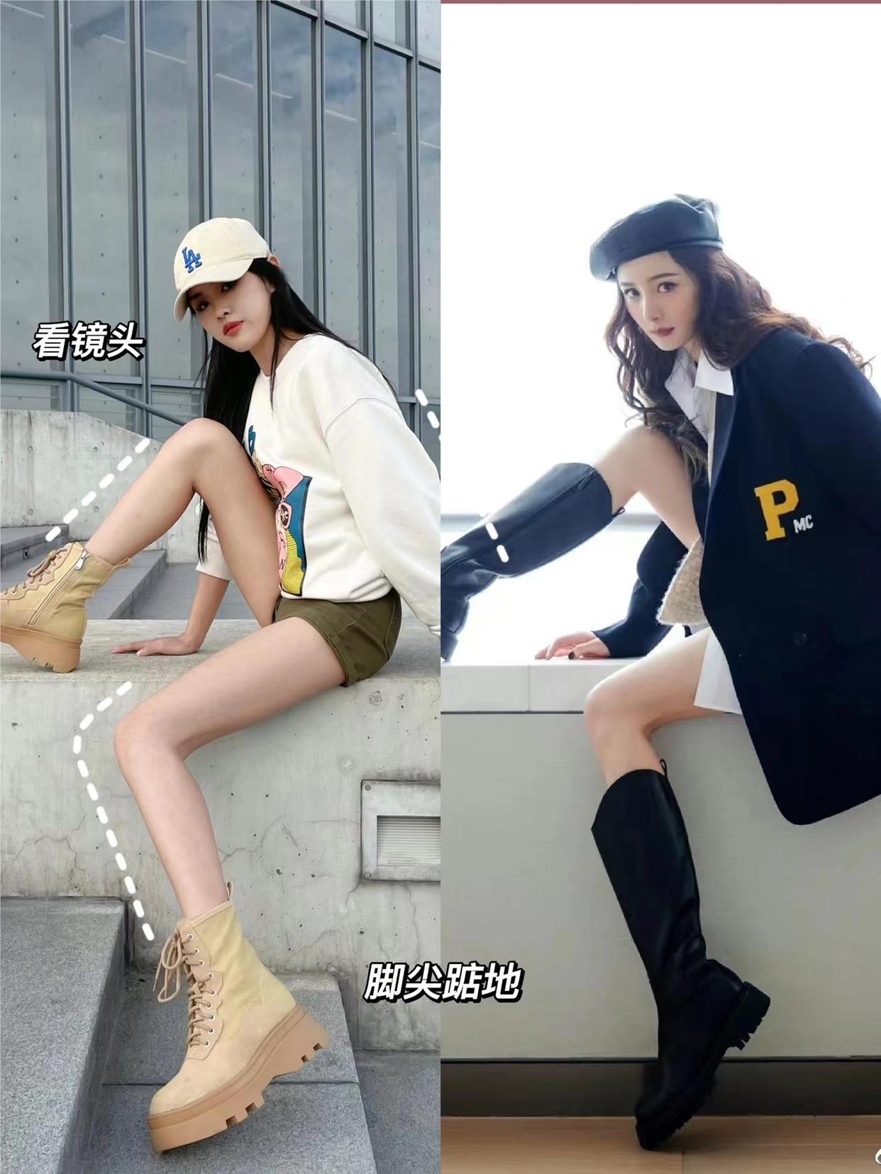 多观察拍摄环境,选择在楼梯、高椅、飘窗上拍摄,侧身坐下对镜头,将腿一上一下放,错落摆放的腿姿能显得腿又细又长,注意此时脚不要平放地面,脚尖点地,更显腿细。