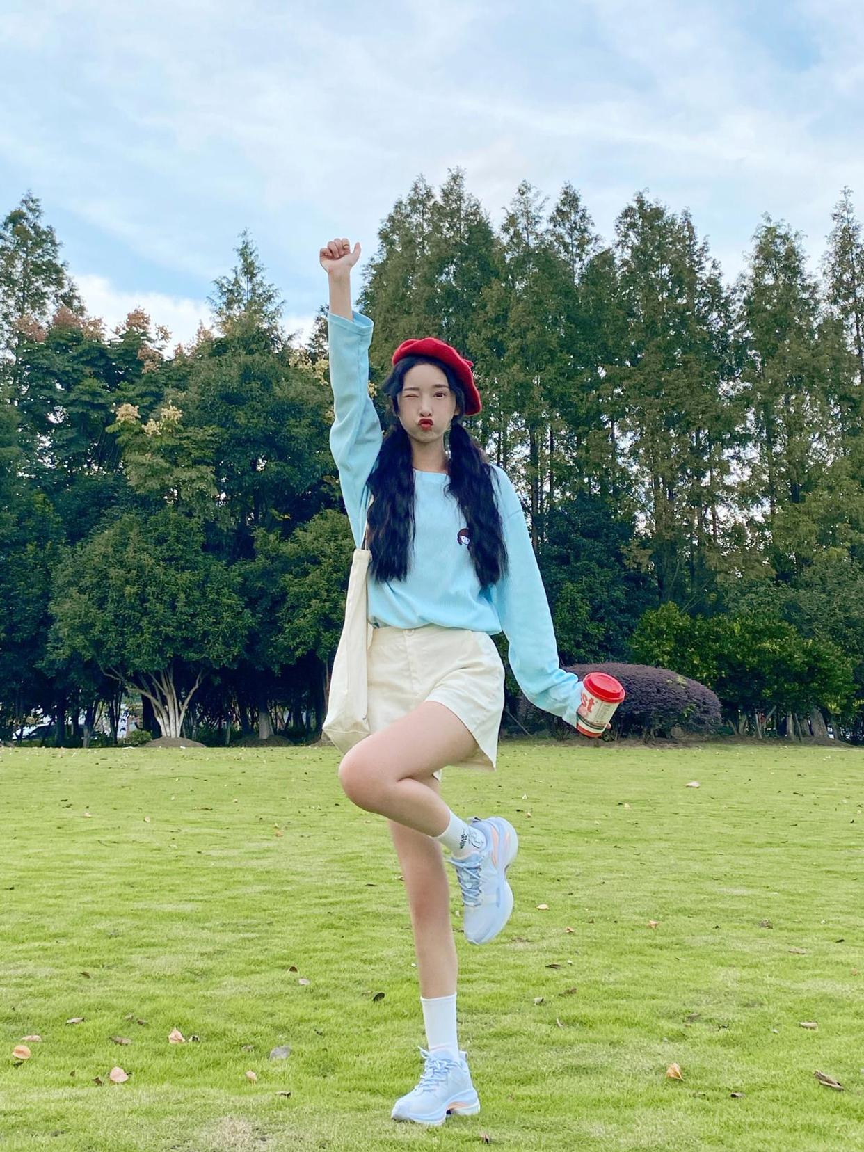 近距离的拍摄往往能制造更强的视觉冲击力,将手机放在草地上,采取低角度的仰拍,人物侧蹲在镜头前,身体往后倾,手部动作再丰富些,整体就很好看了。